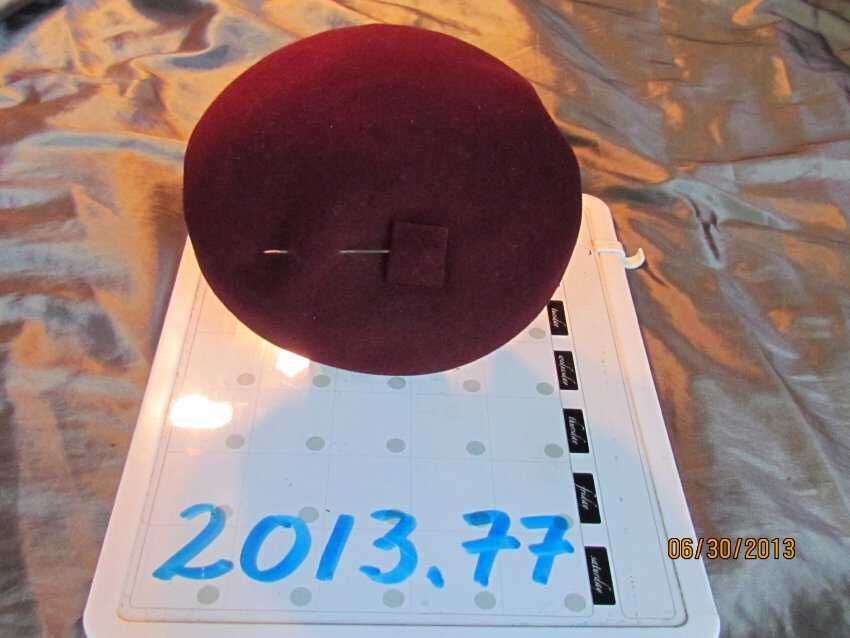 Hat, burgundy beret, label says "Chelton Beret 94% wool, 5% casein, Betmar Hats Inc, New York" size medium, leather headsize ribbon; hat pin with same felt square hat pinCollection