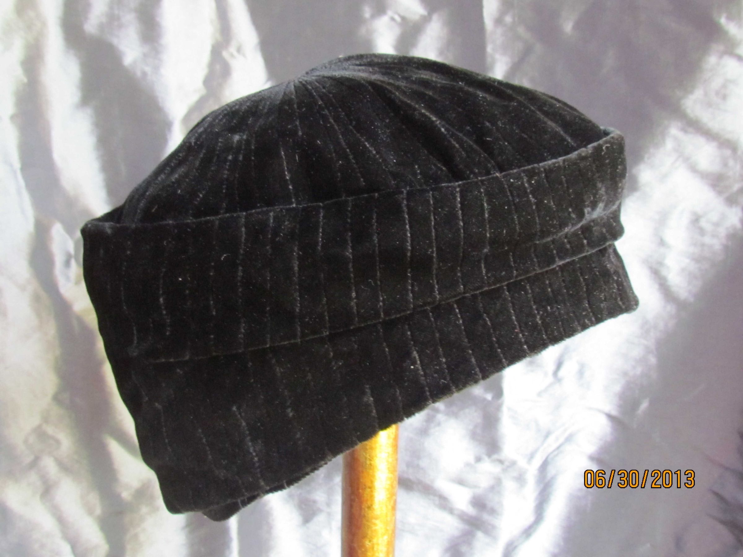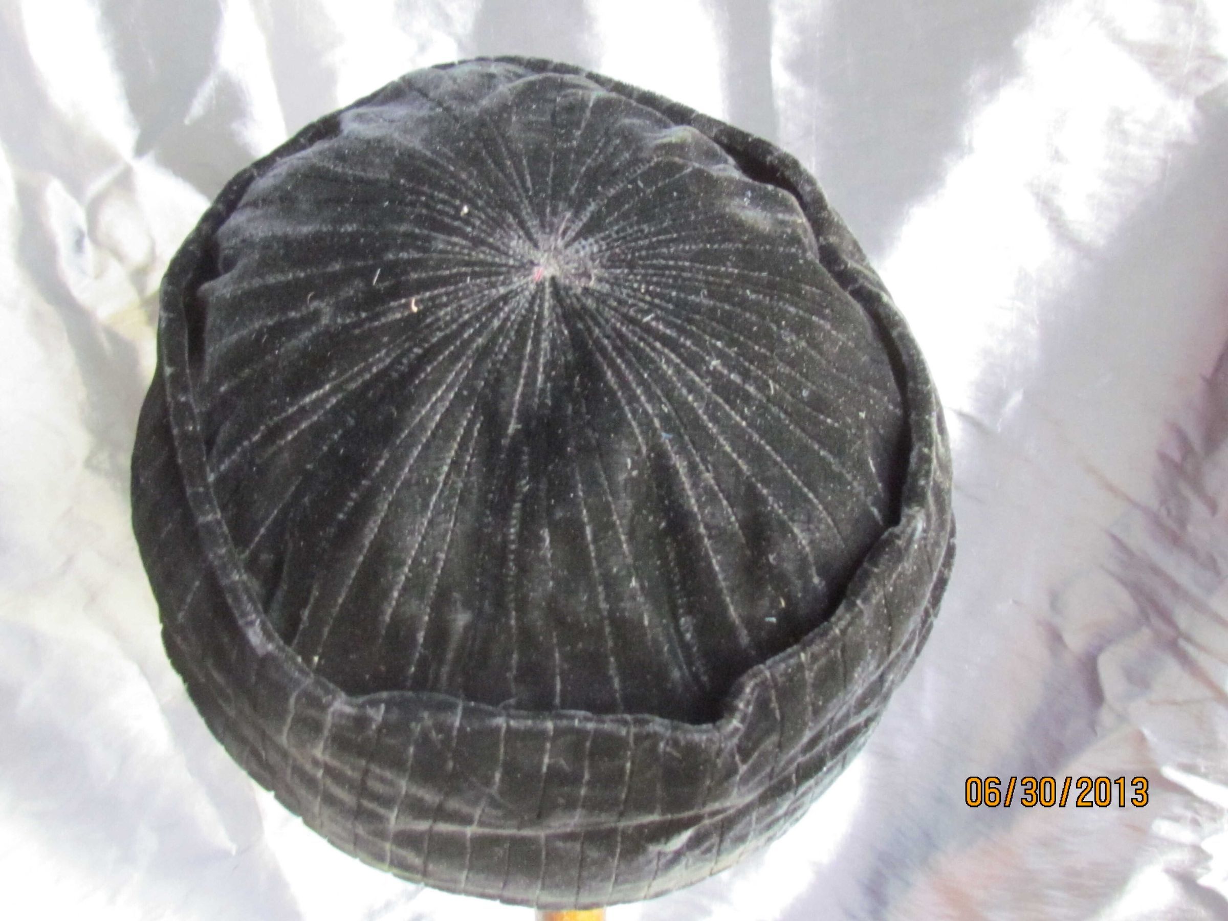 Hat, beret, black velvet with channel stitching with sun ray channel stitching on crown. Lined inside with netting. Label states, "The White House San Francisco Paris New York" and size label "22".Collection
