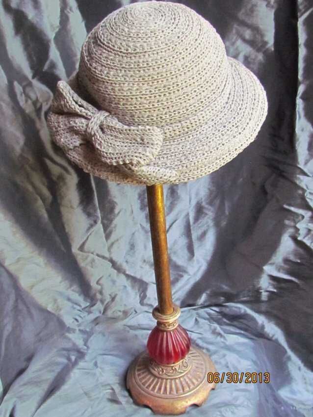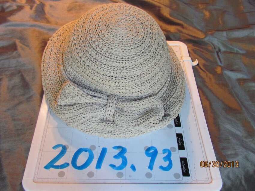 2013.93 Hat, gray knitted raffia with bow embellishment, small brim picture or portrait hat, label says "Cooney of California Original by Everitt Patented",Collection