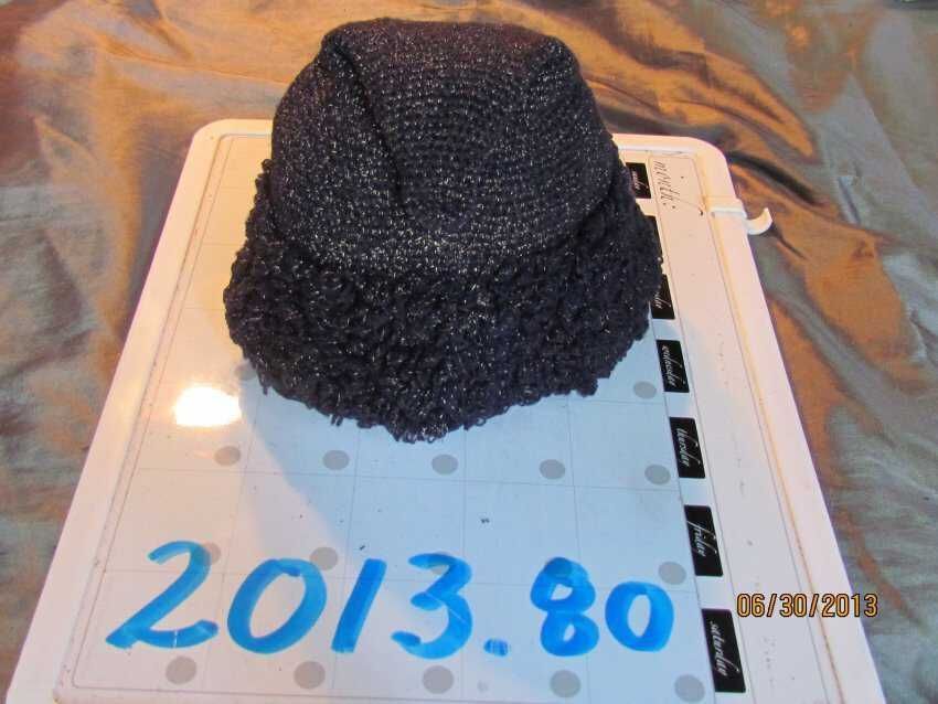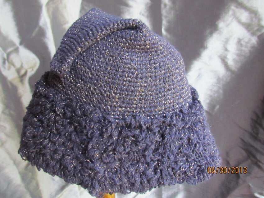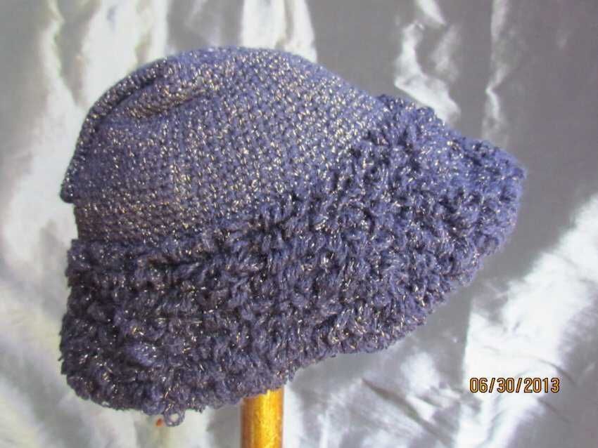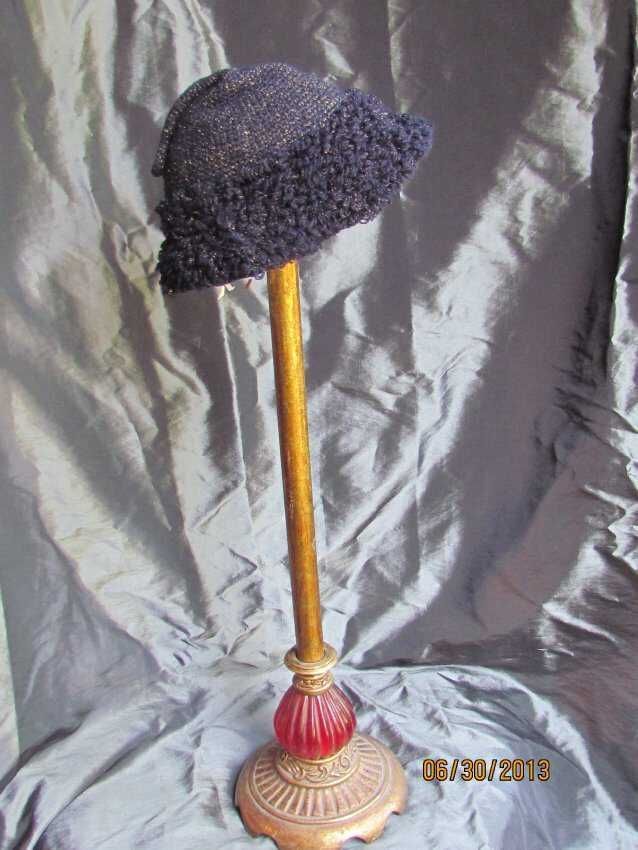 Hat, small blue peaked crocheted hat, loopy 2inch crocheted embellishment label says " 60% Woolp40% metal, Made in Italy, W.P.L 10121;