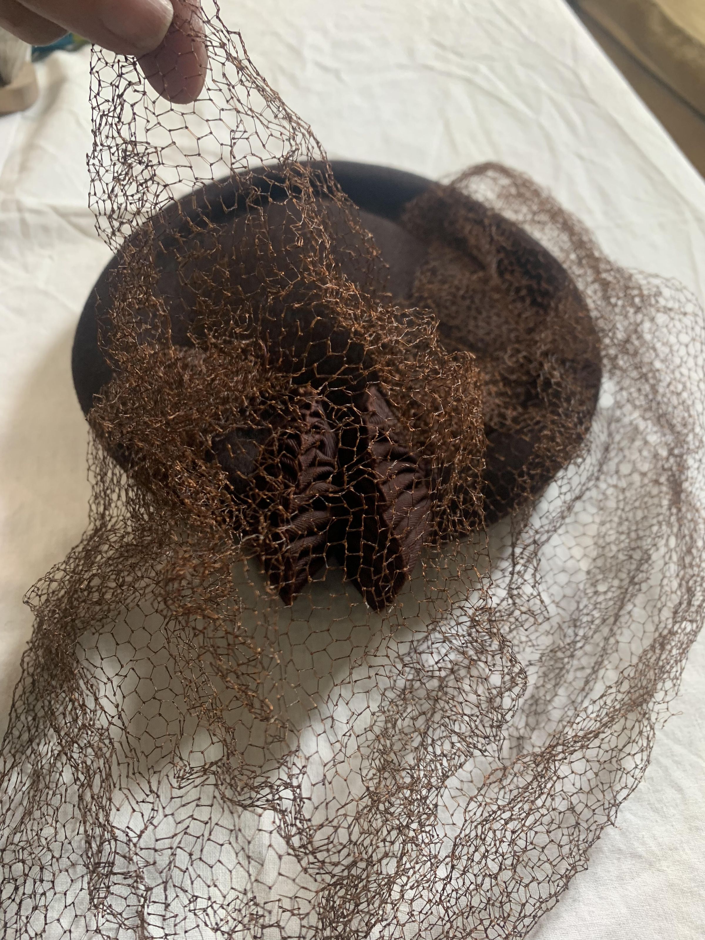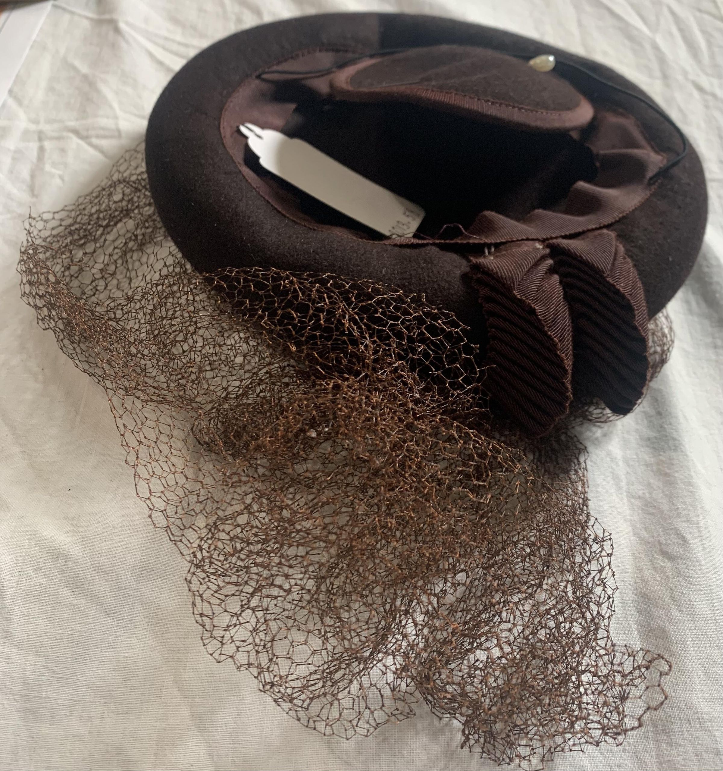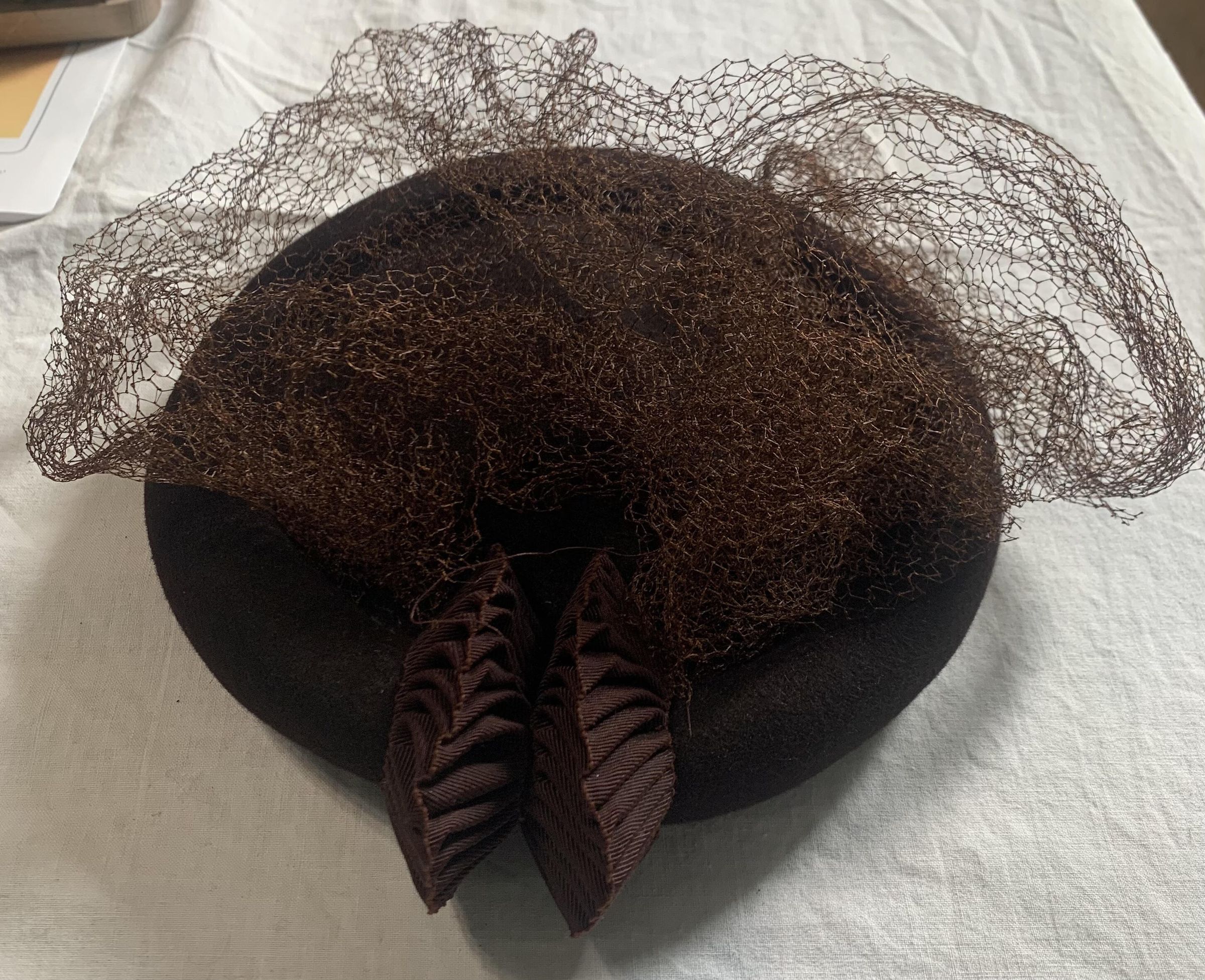 Hat, cocktail hat, brown felt with brown veiling, two pleated shell-like embellishment, elastic headband, petersham ribbon, brown bumper brim; 1930s-40sCollection