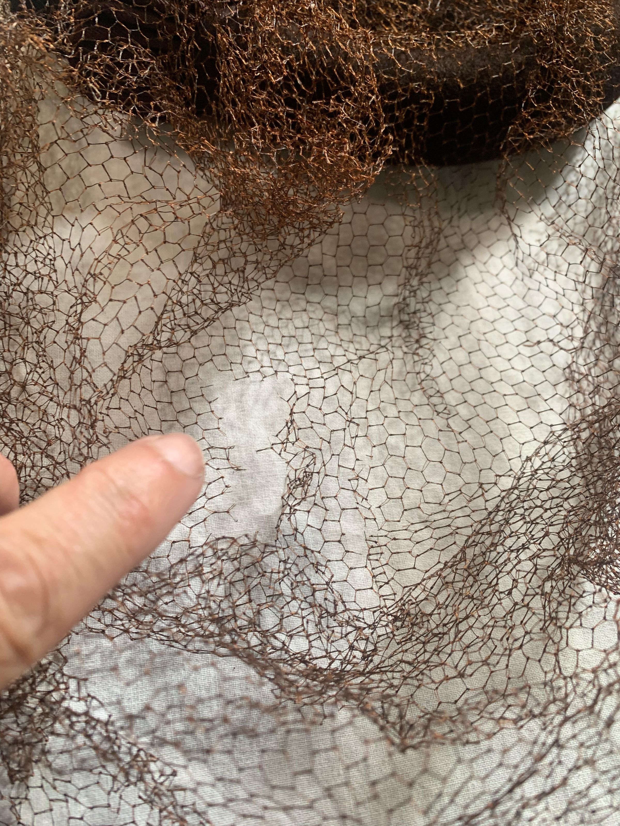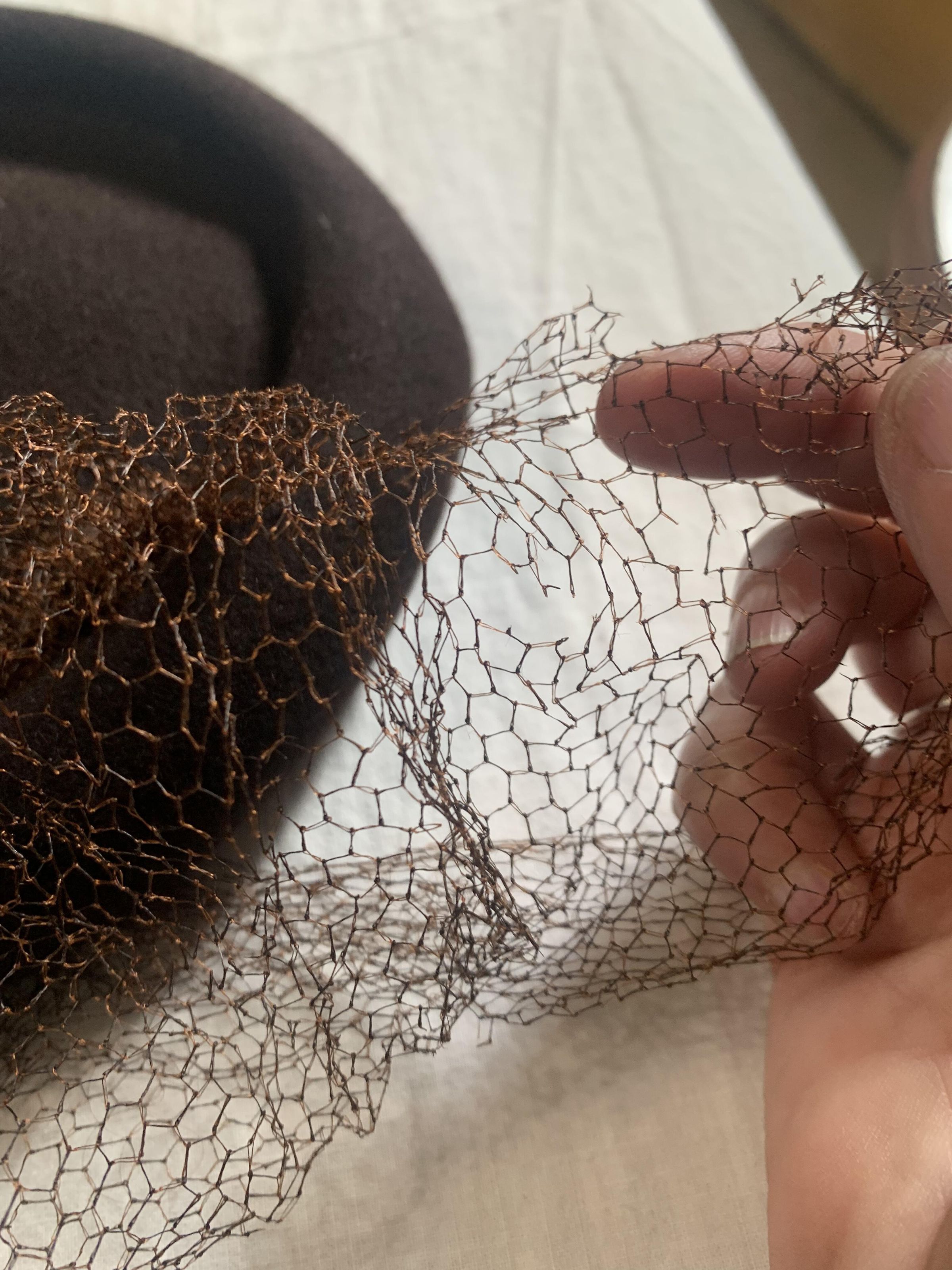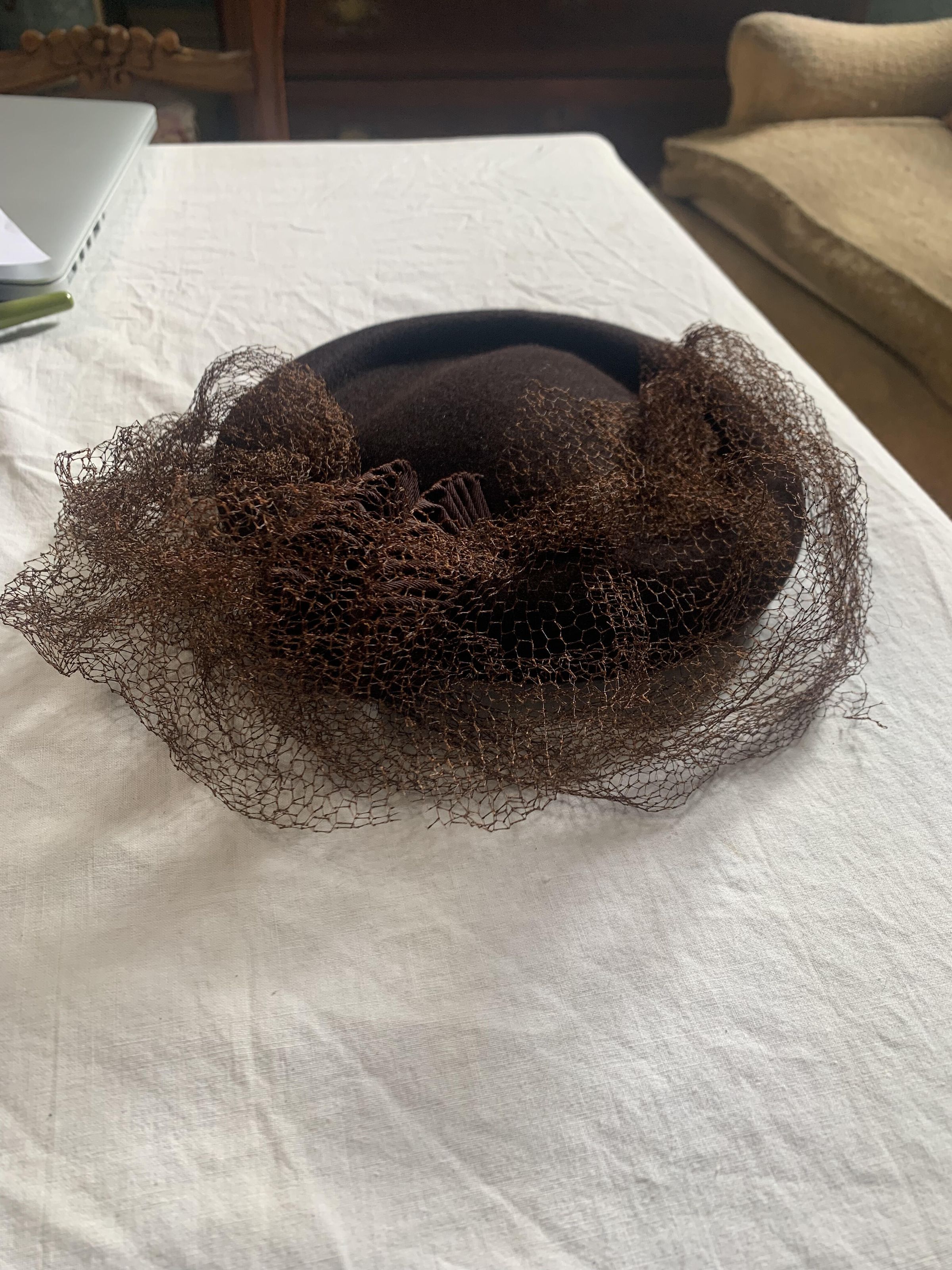 Hat, cocktail hat, brown felt with brown veiling, two pleated shell-like embellishment, elastic headband, petersham ribbon, brown bumper brim; 1930s-40sCollection