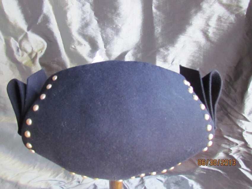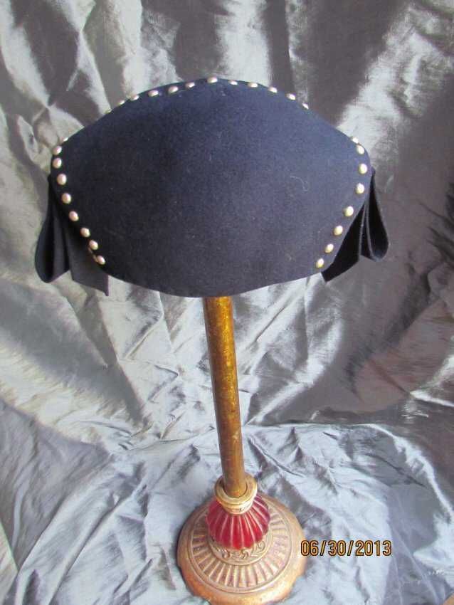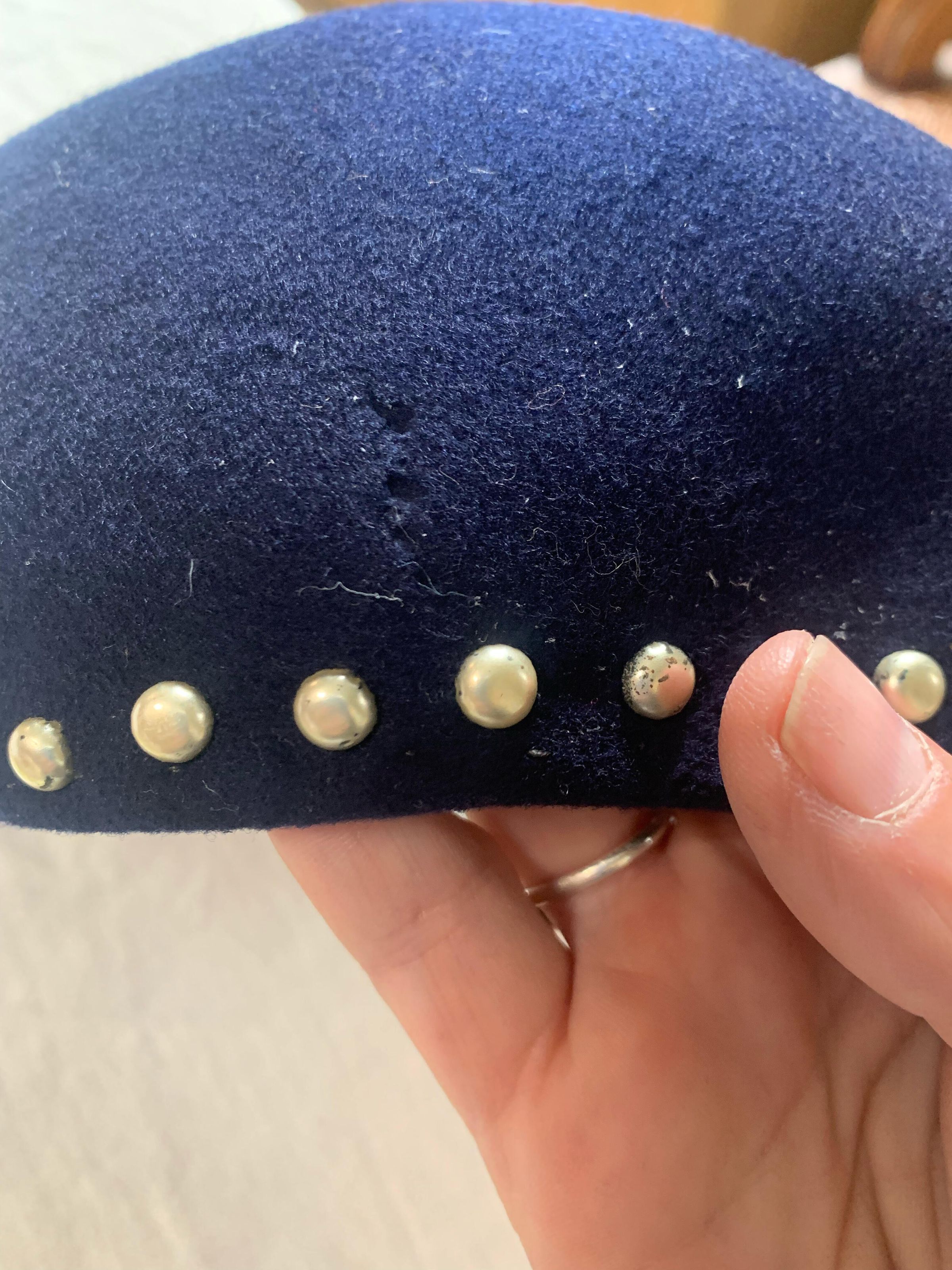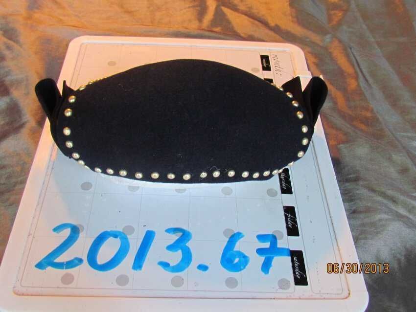 Hat, navy blue caplet made with wool and apalac felt with metal rivets with folded felt embellishments on sides. Maker label stamped inside: Merrimac Hat Corp, Made in the USA, 94% Wool 6% Apalac".Collection