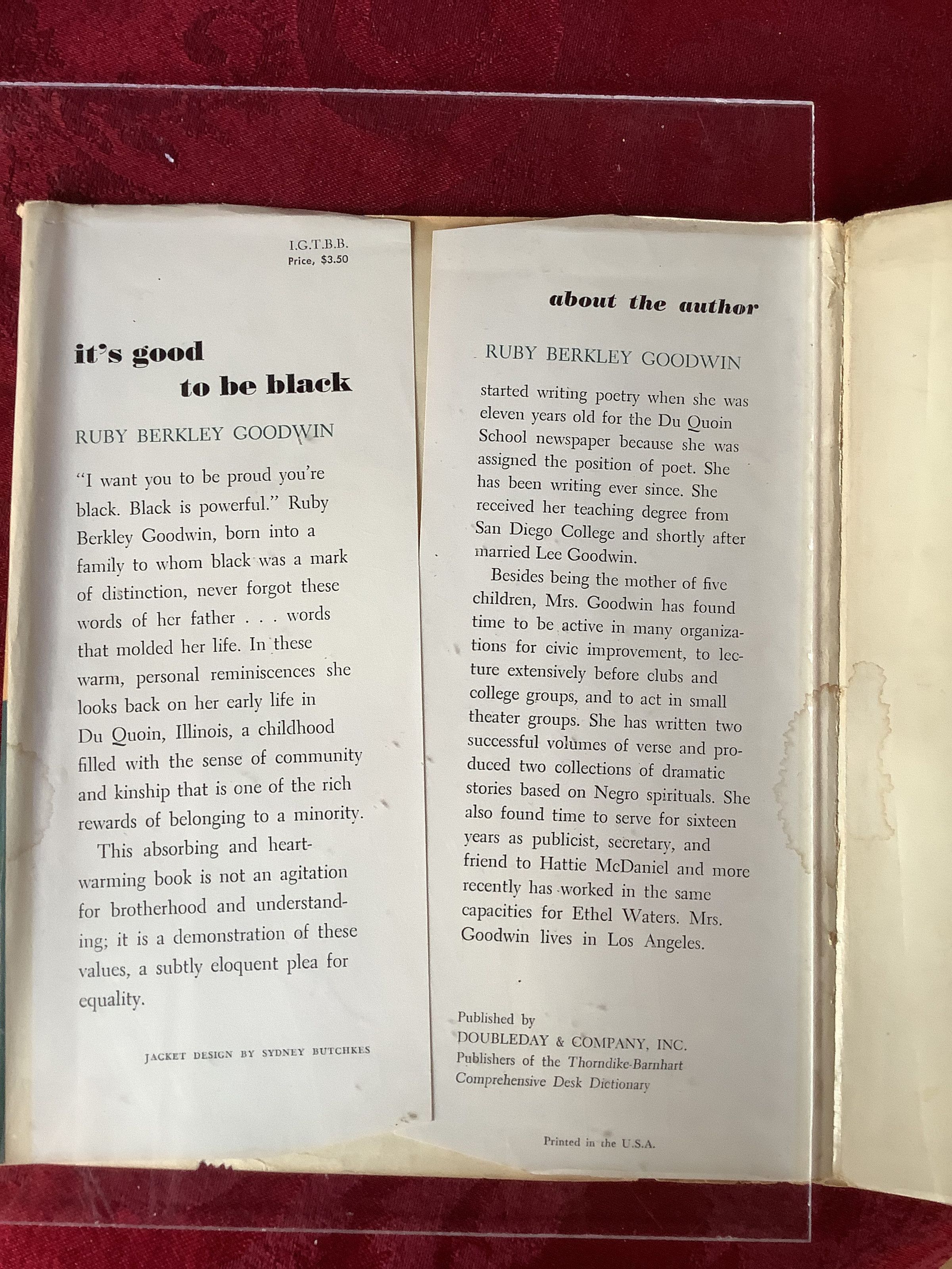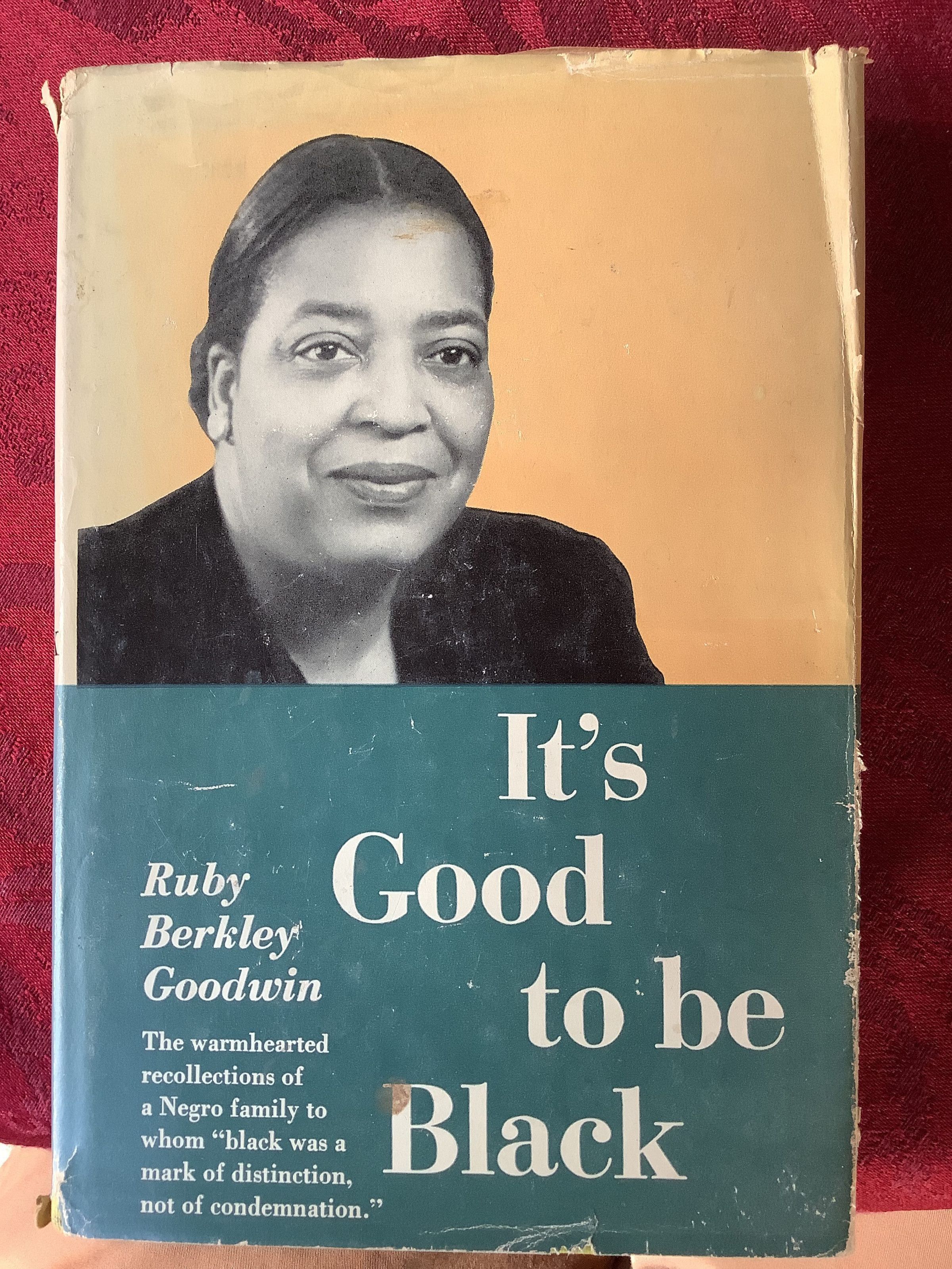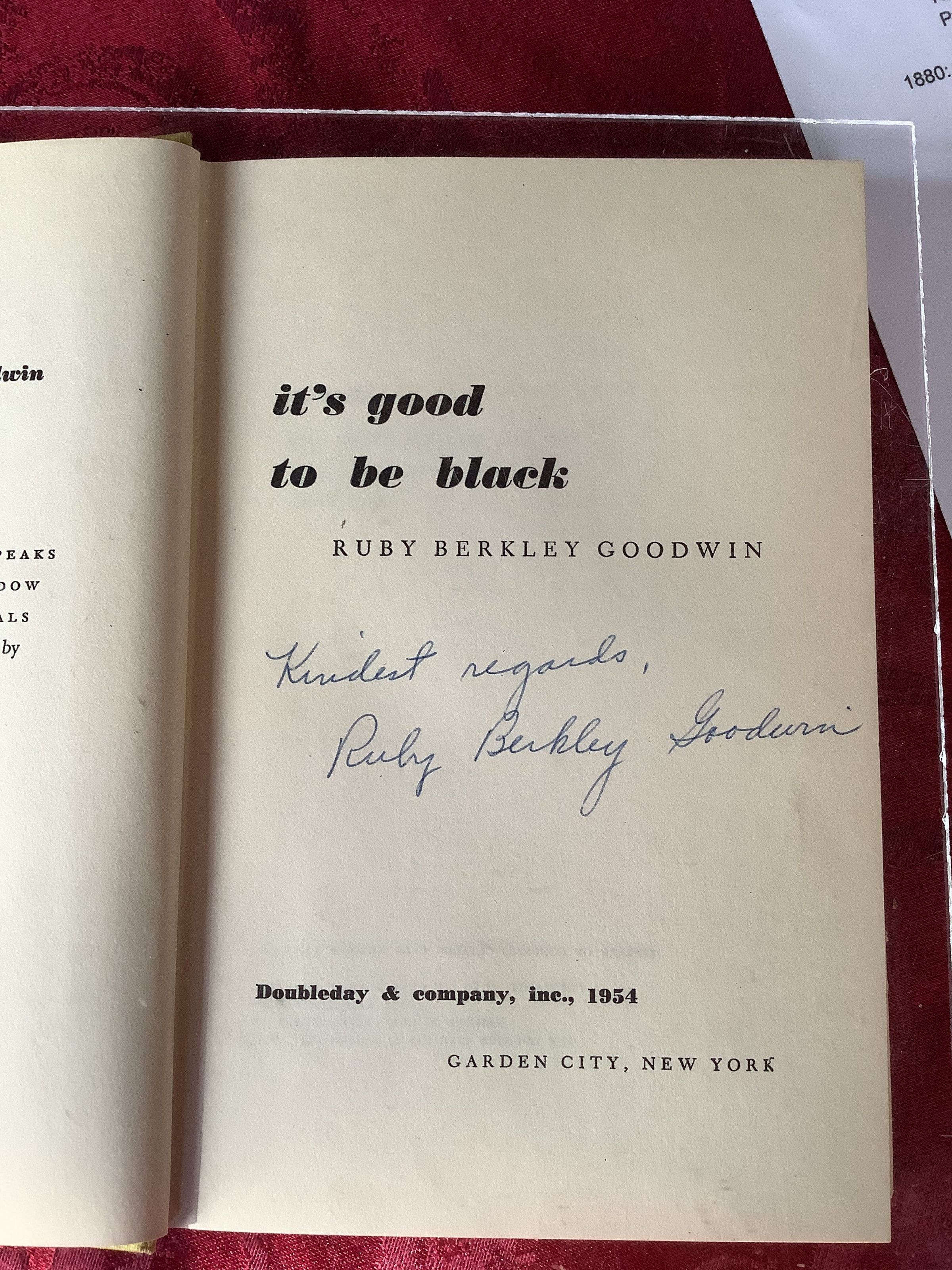 “Is it good to be black? To Ruby Berkley Goodwin it was....The black she writes about has nothing to do with skin color, but it does have a great deal to do with self images, values, spiritual strength, and most of all love. Unlike the contradicting definitions of blackness we see reflected in today's crime statistics, movies, television, newspapers, political speeches, advertisements, and sociological reports, Ruby Berkley Goodwin's definition of blackness is simple and to the point: black is good. It's Good to be Black is more than the story (history) of a black family living in Du Quoin, Illinois, during the early 1900s; it is a reaffirmation for all of us who know in our hearts that there is still good in the world and that some of that good is black.” - Preface, via Google BooksInscription/Signature/Marks