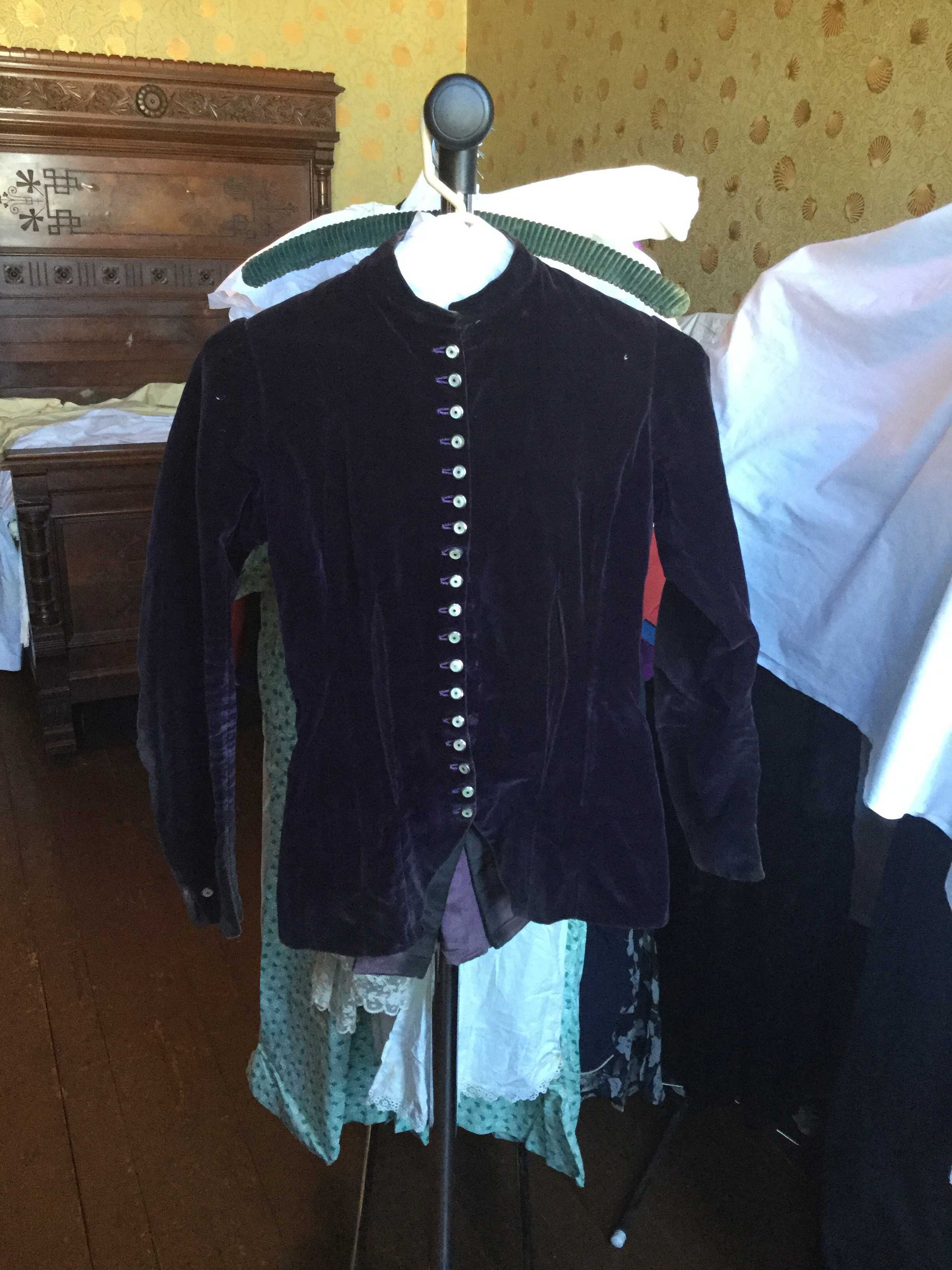 purple velvet jacket, flat lined, lining sewn into seams cotton velvet. boning in sides, mother of pearl and metal button