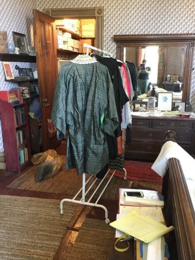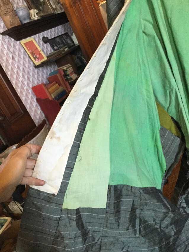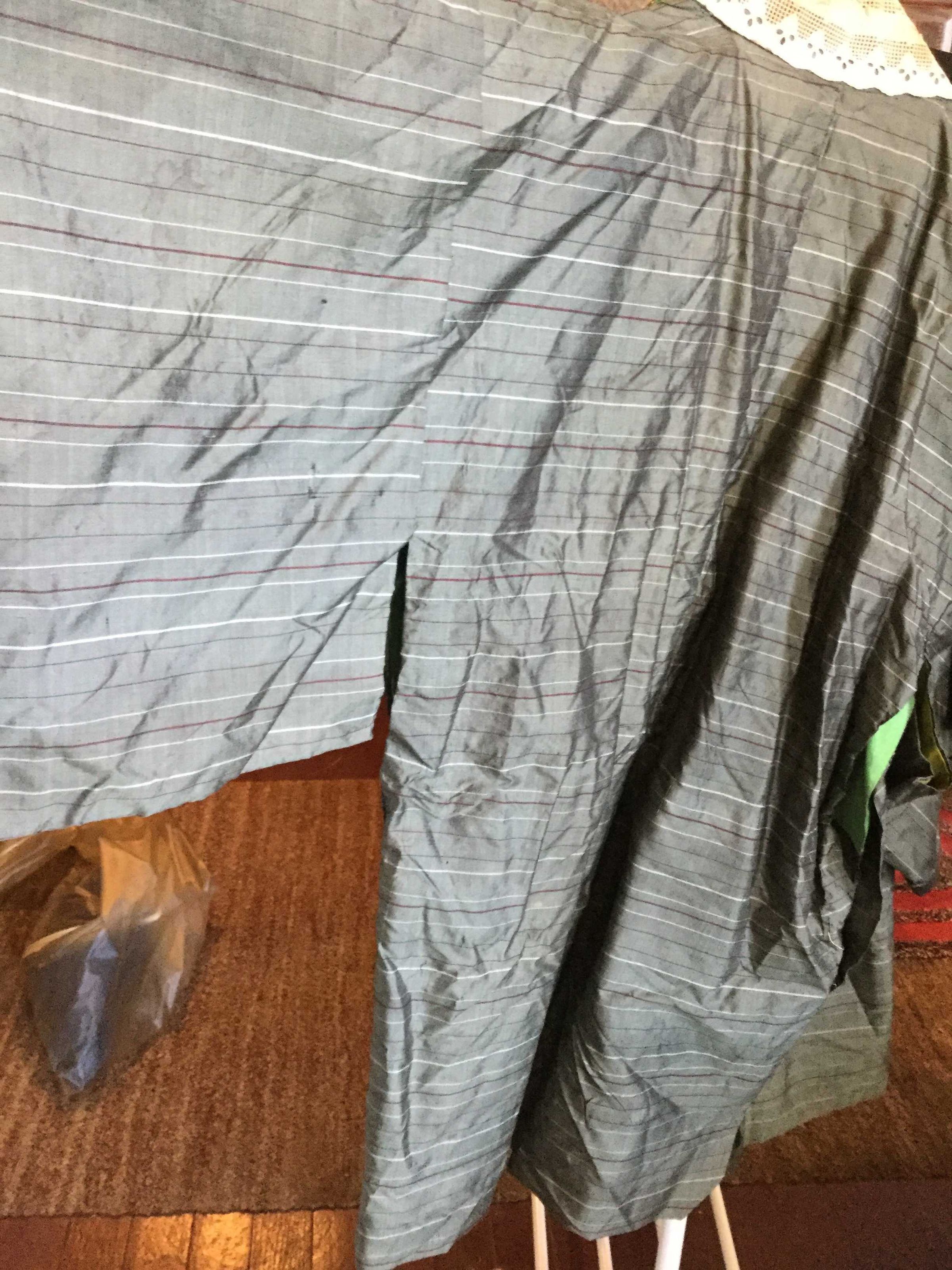 jacket, kimono style, silk Chantung, green gray with burgundy stripes, eyelet collar green cotton liningCollection