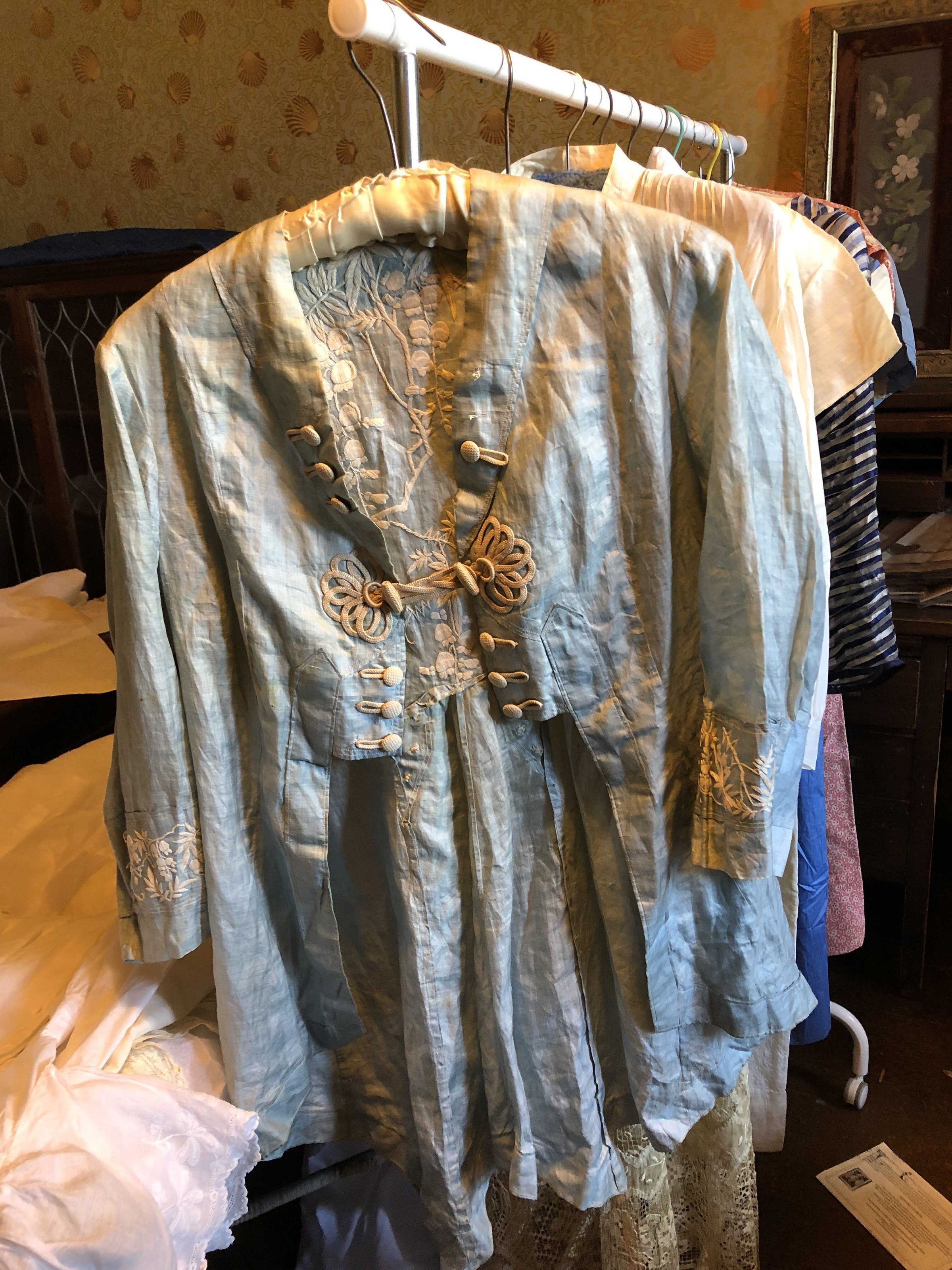 Pale Blue Jacket Linen? Silk? 3/4 sleeves, embroidery on back and on cuffs, Ornamental frog closure on front