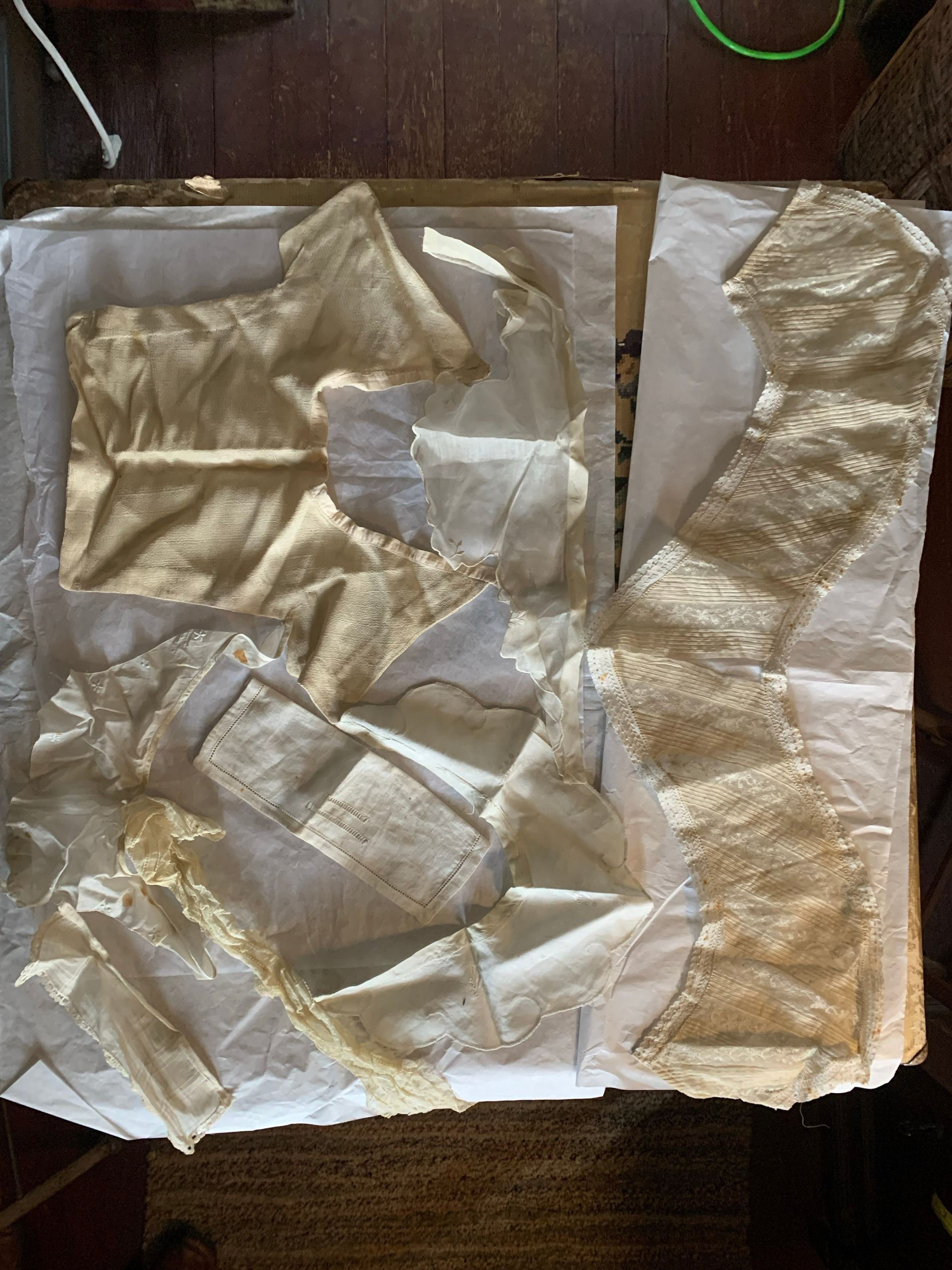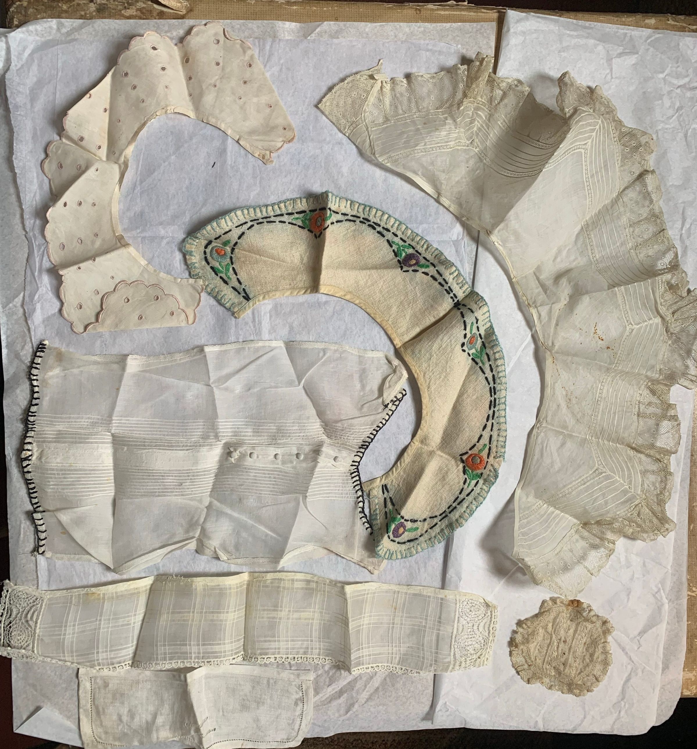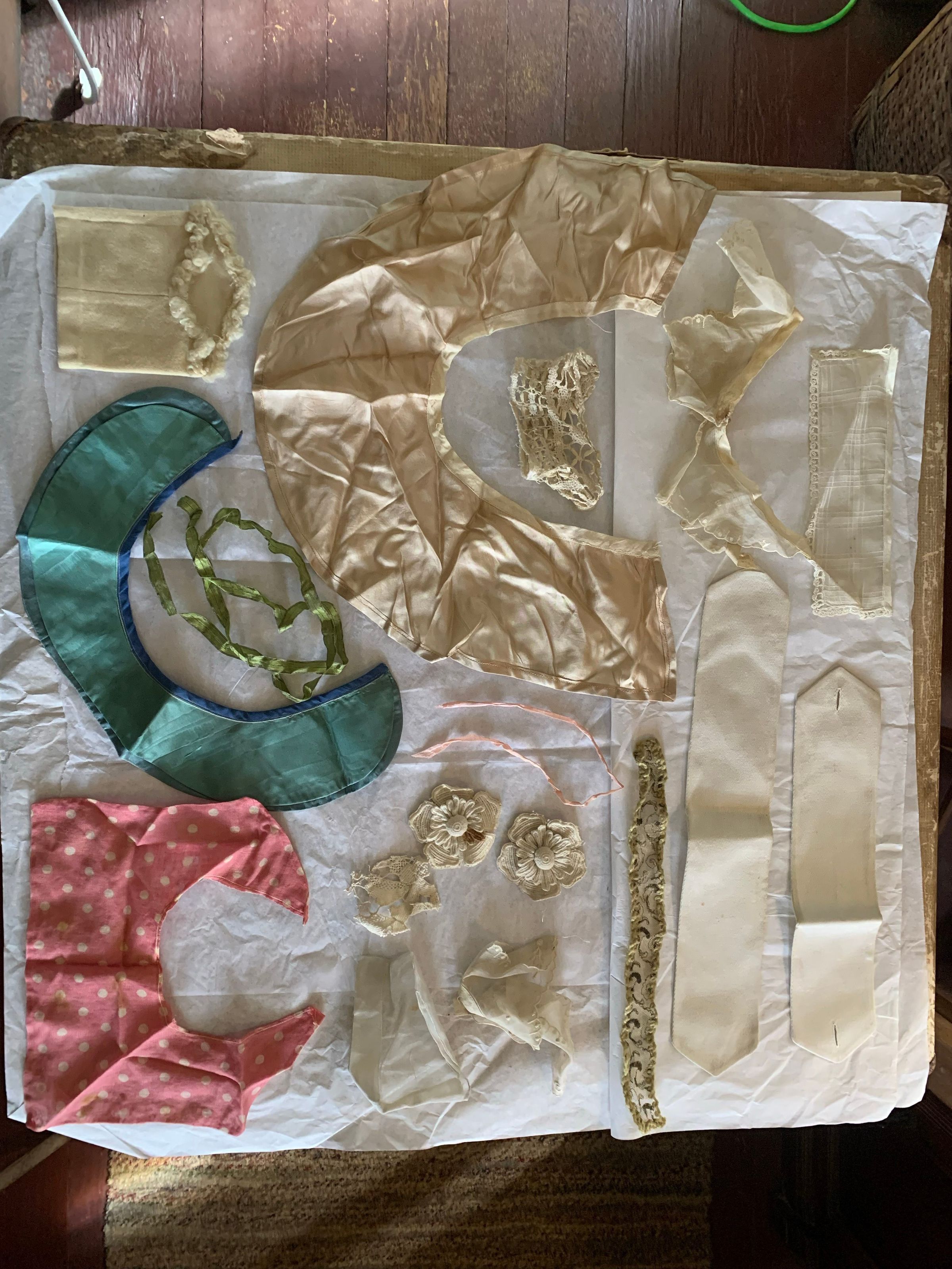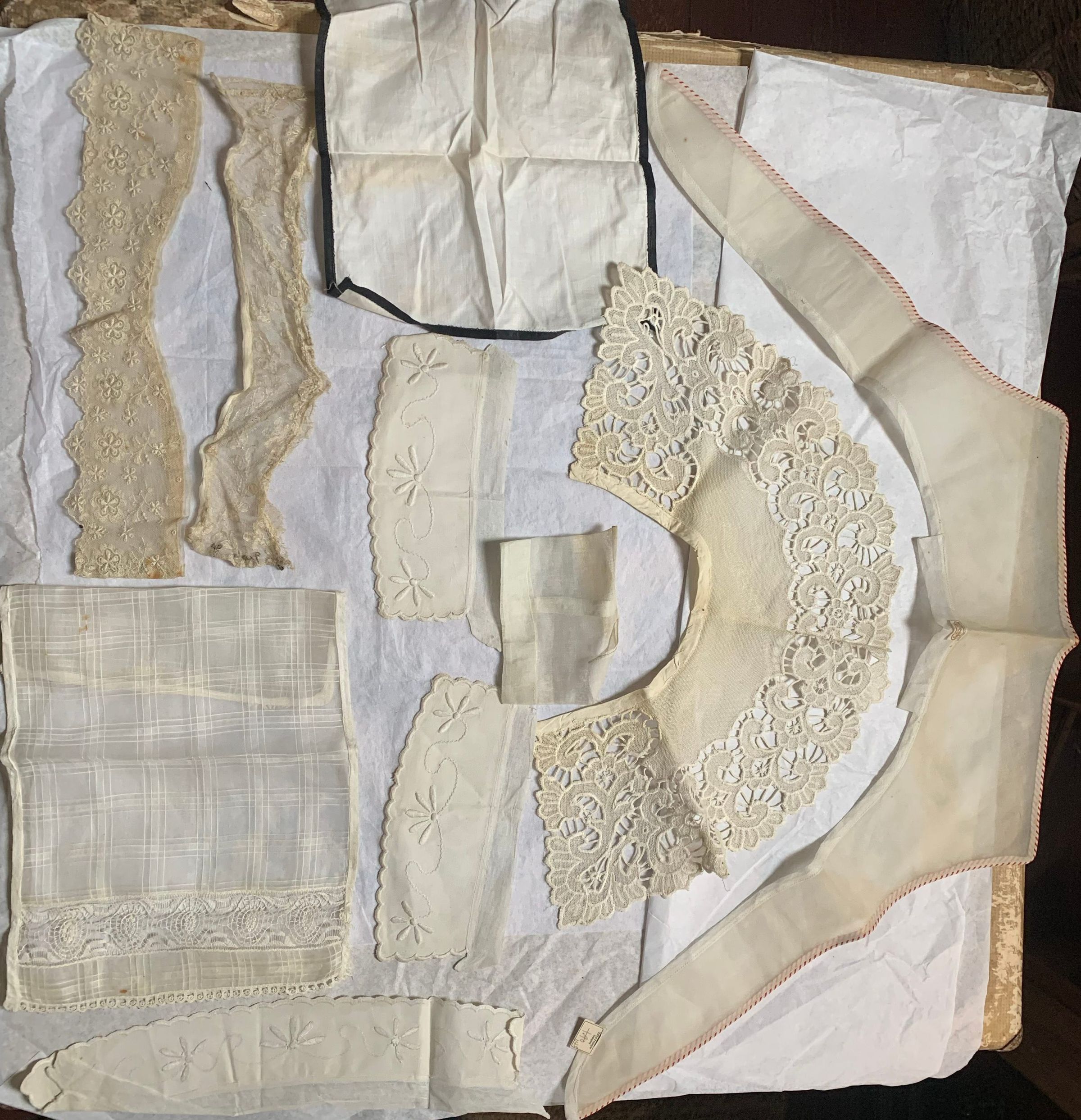 Box of lace and fabric neckwear, including other scraps and cut pieces. There is babydoll clothes patterns included with the box. Some of the textile has embroidery and patterns. The color has faded, and there seems to be considerable fold marks on the textiles, but overall condition has been preserved.Inscription/Signature/Marks
