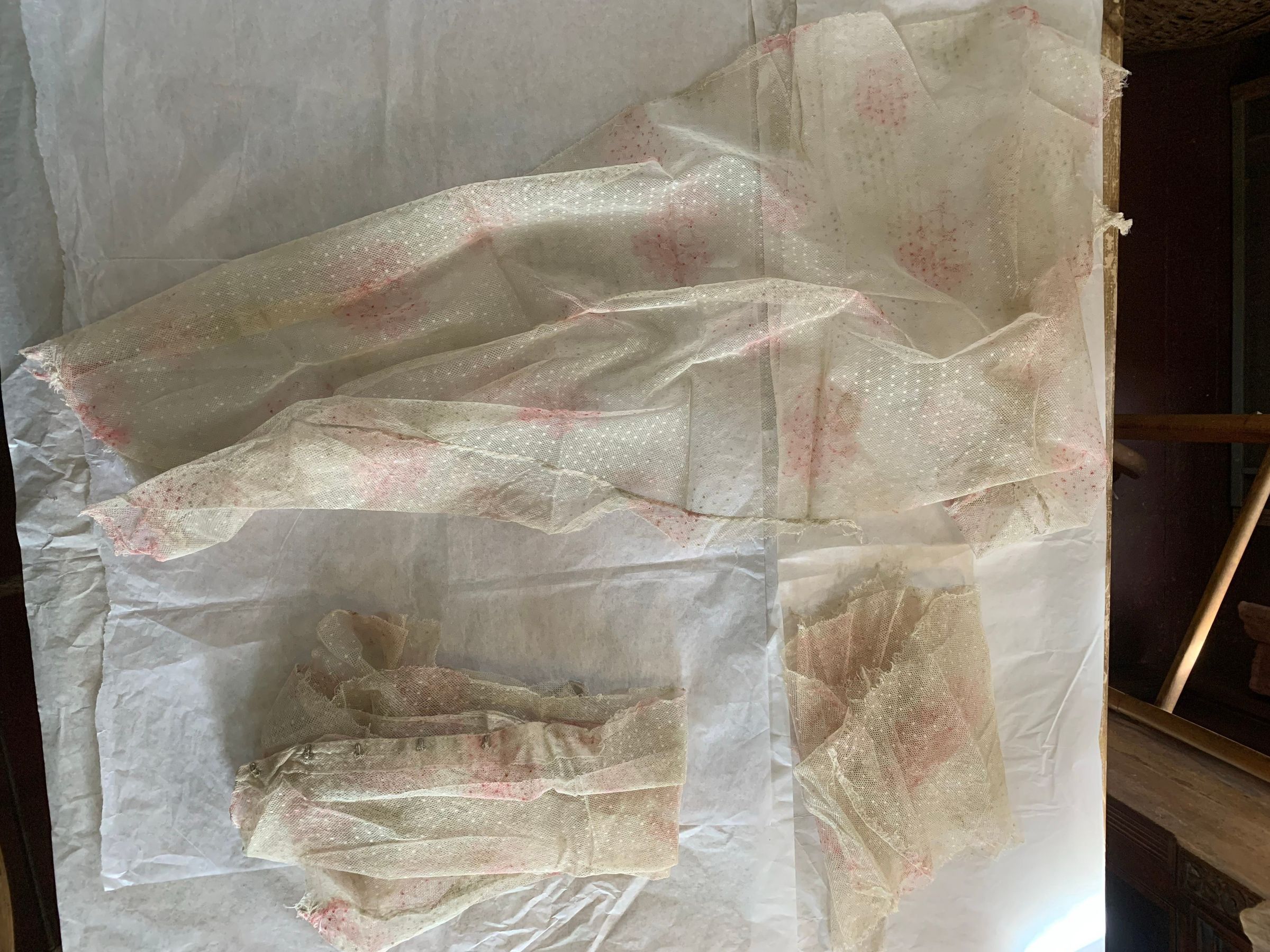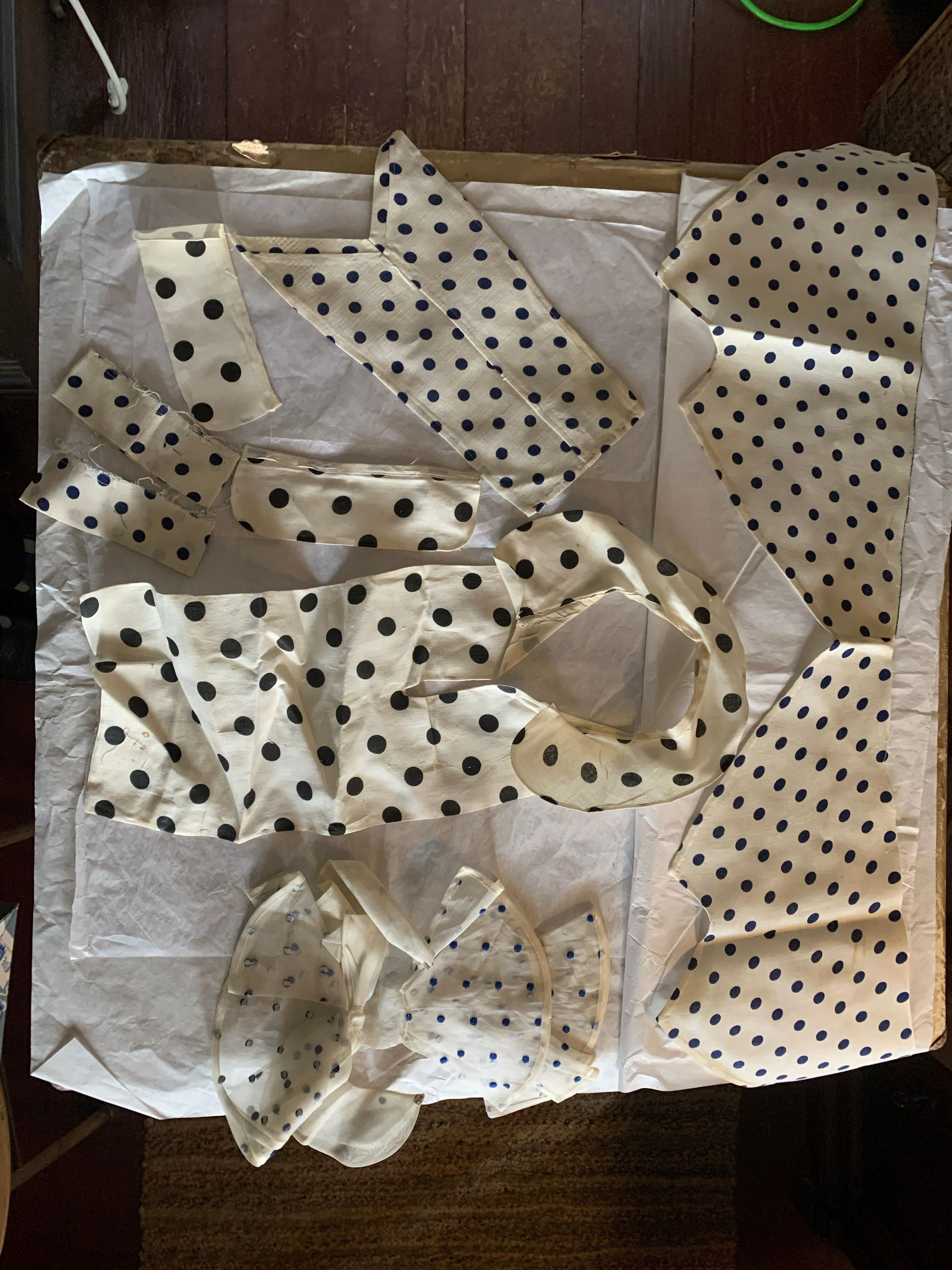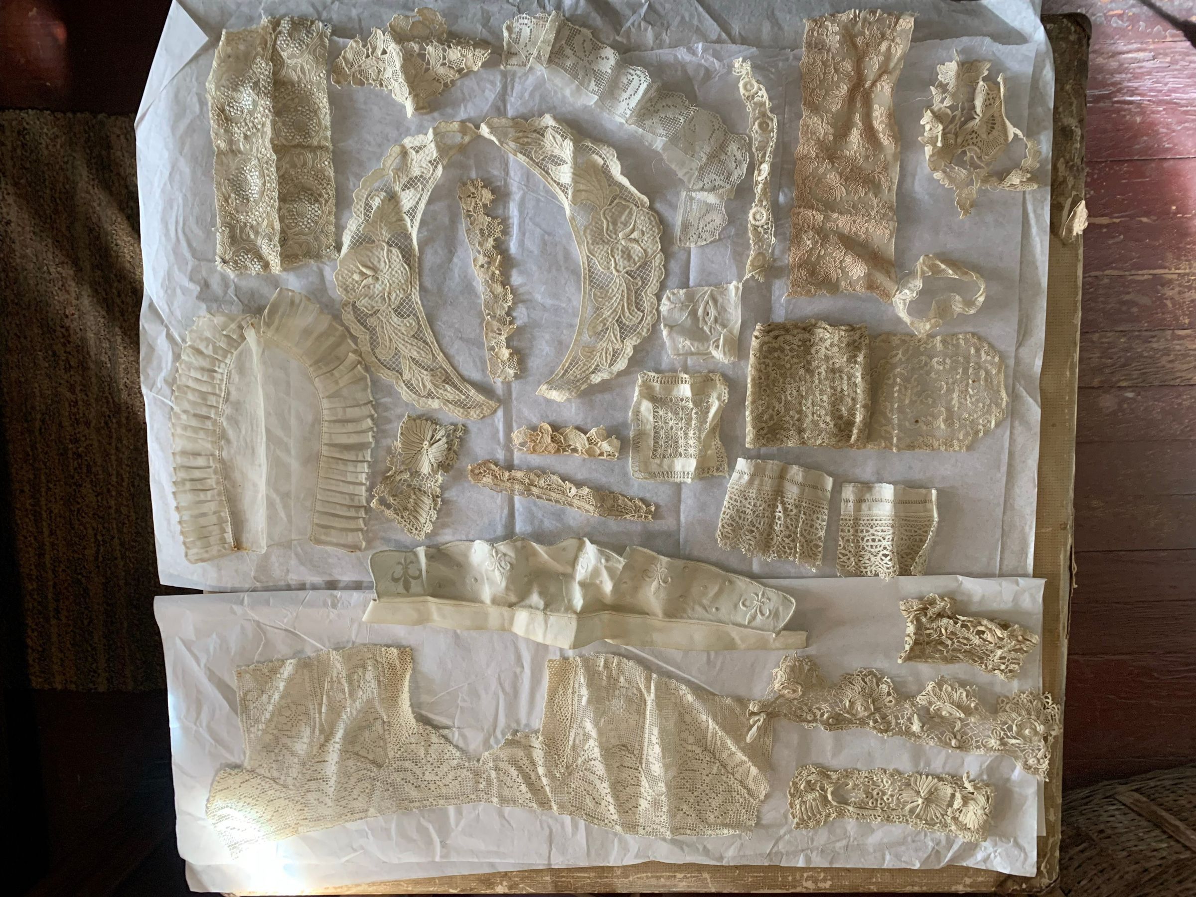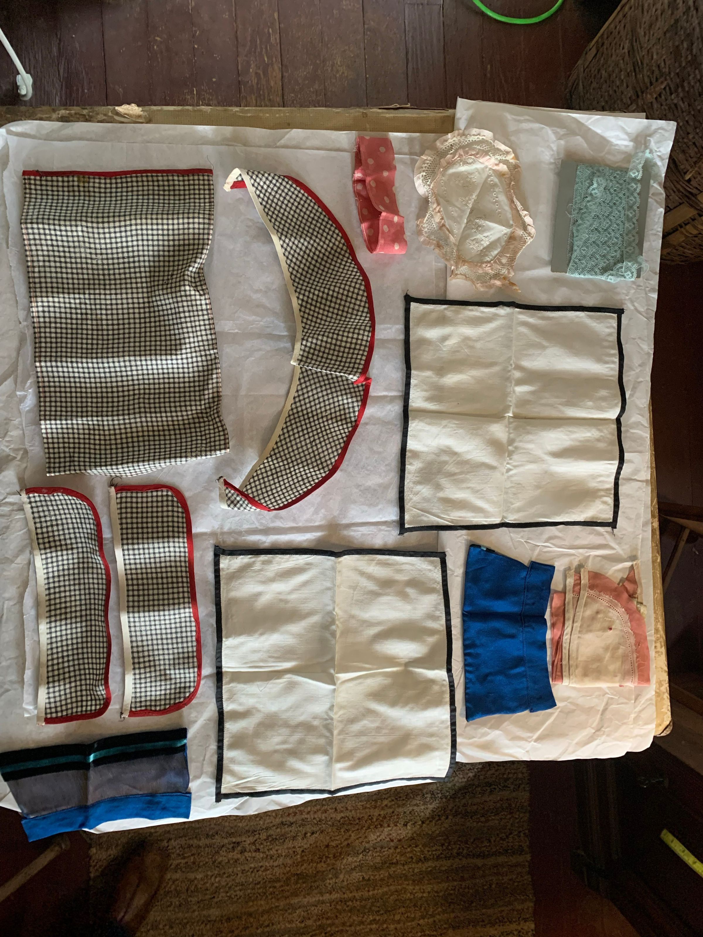 Box of lace and fabric neckwear, including other scraps and cut pieces. There is babydoll clothes patterns included with the box. Some of the textile has embroidery and patterns. The color has faded, and there seems to be considerable fold marks on the textiles, but overall condition has been preserved.Inscription/Signature/Marks