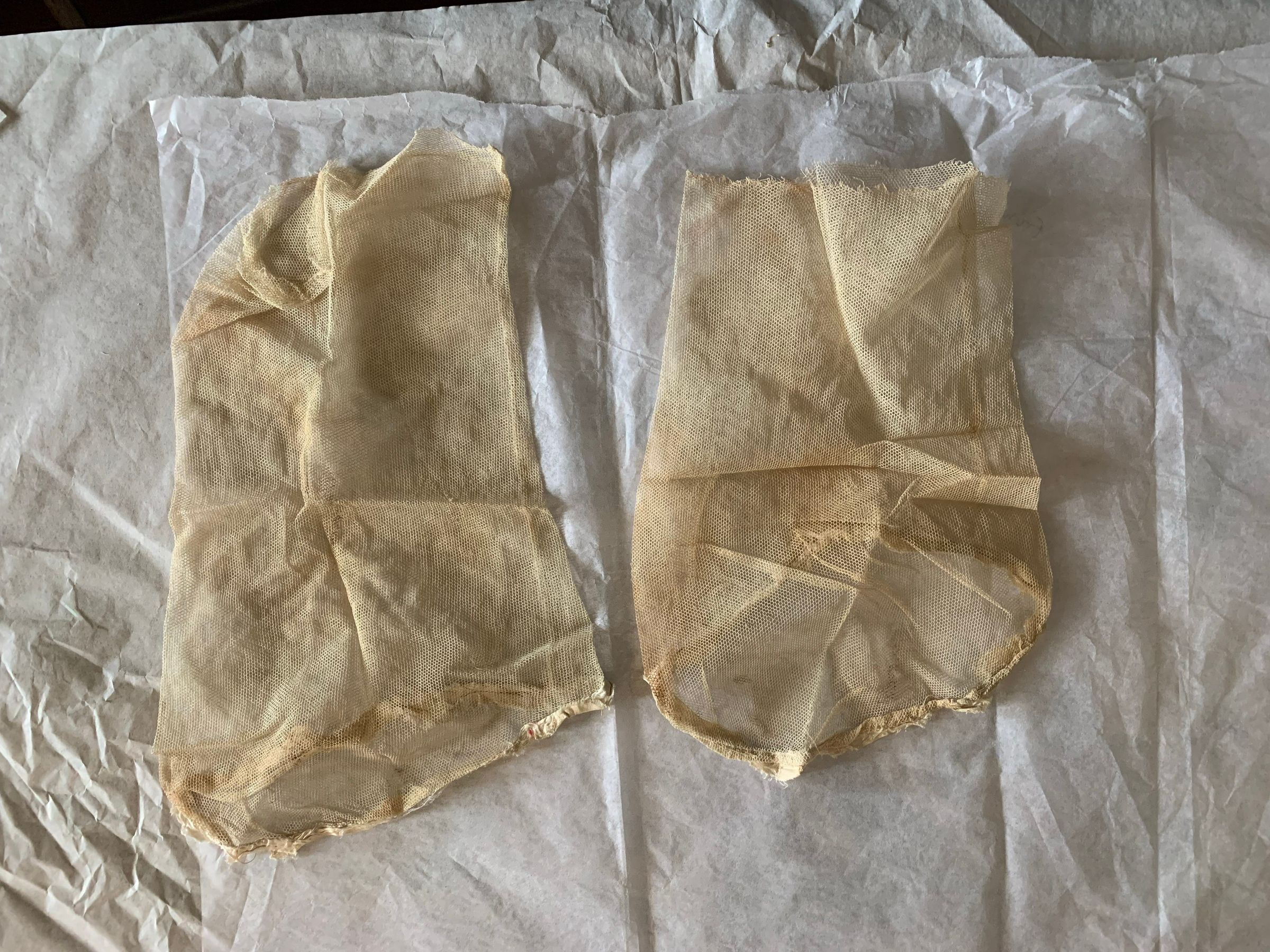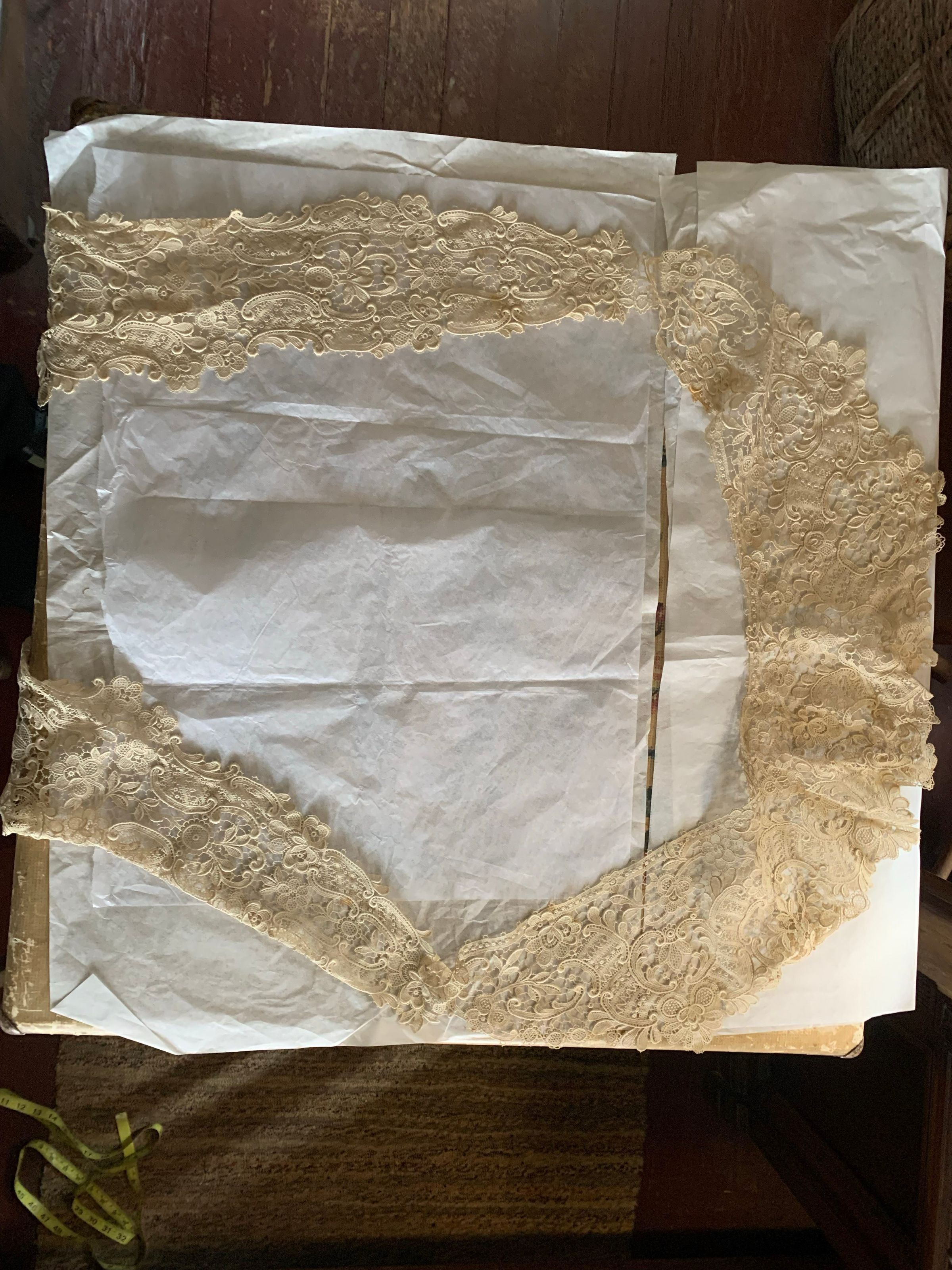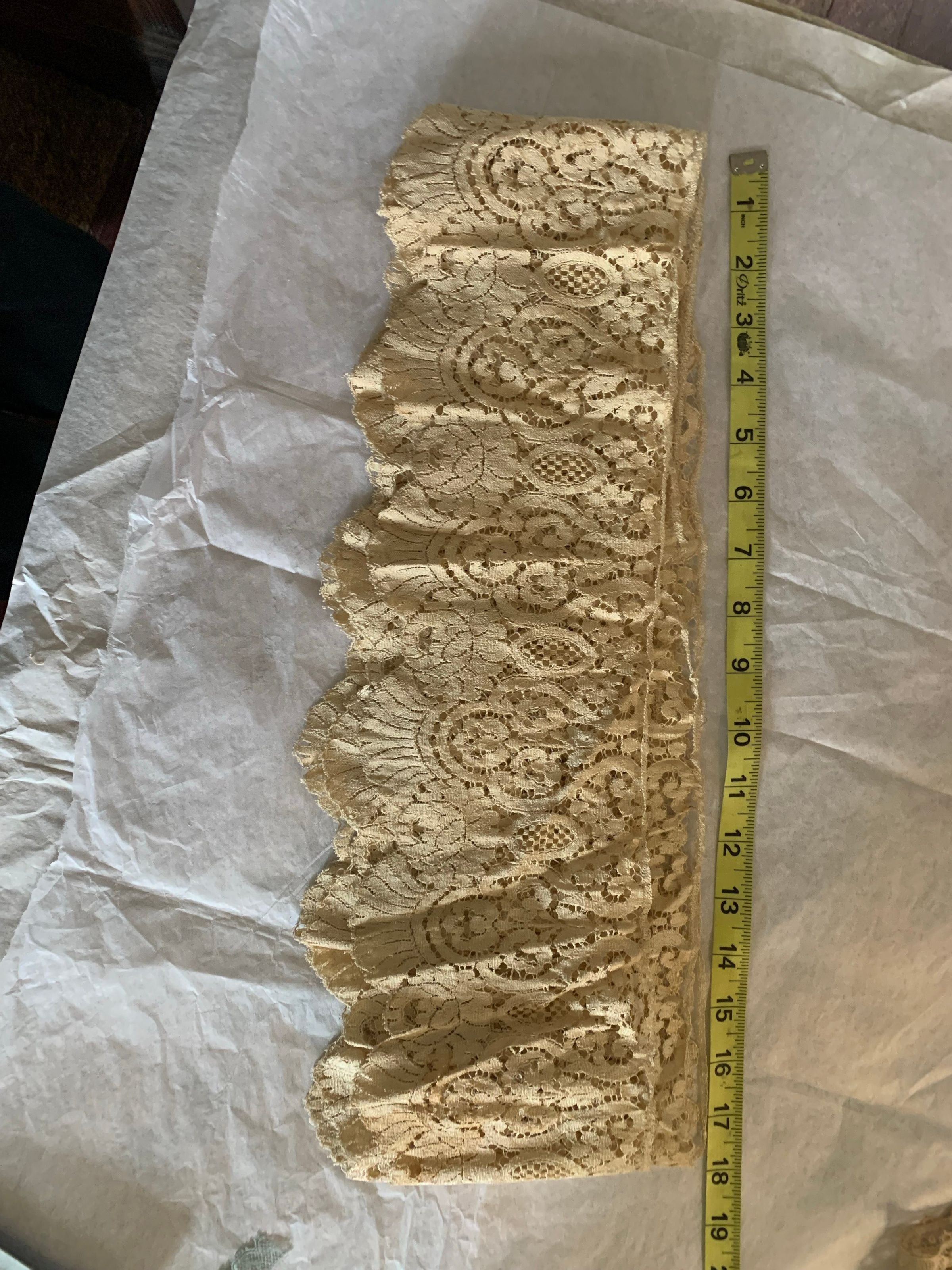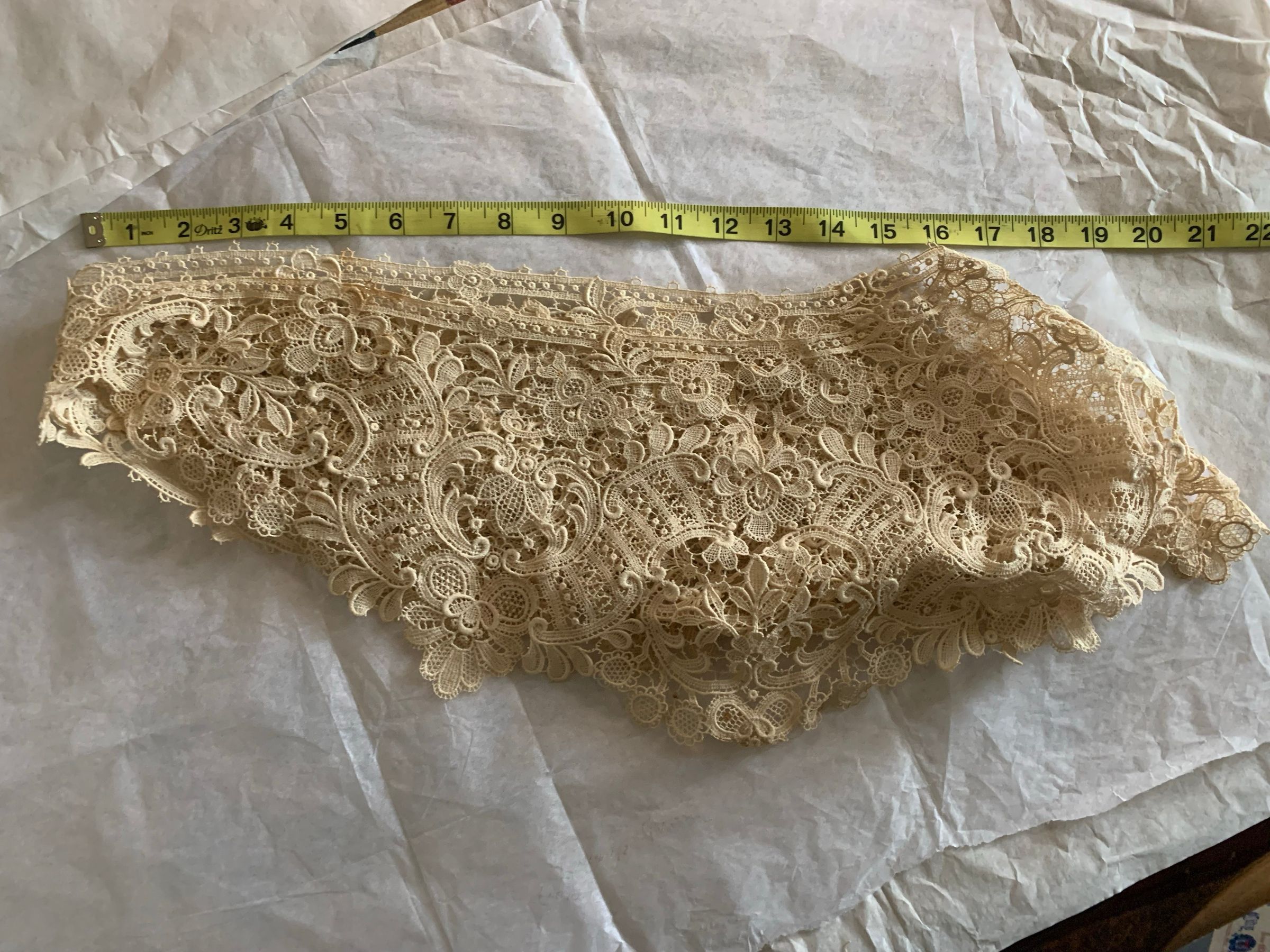Box of lace and fabric neckwear, including other scraps and cut pieces. There is babydoll clothes patterns included with the box. Some of the textile has embroidery and patterns. The color has faded, and there seems to be considerable fold marks on the textiles, but overall condition has been preserved.Inscription/Signature/Marks