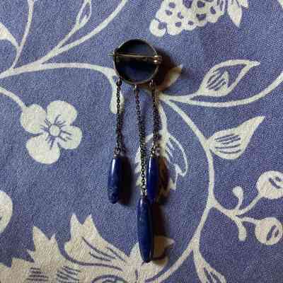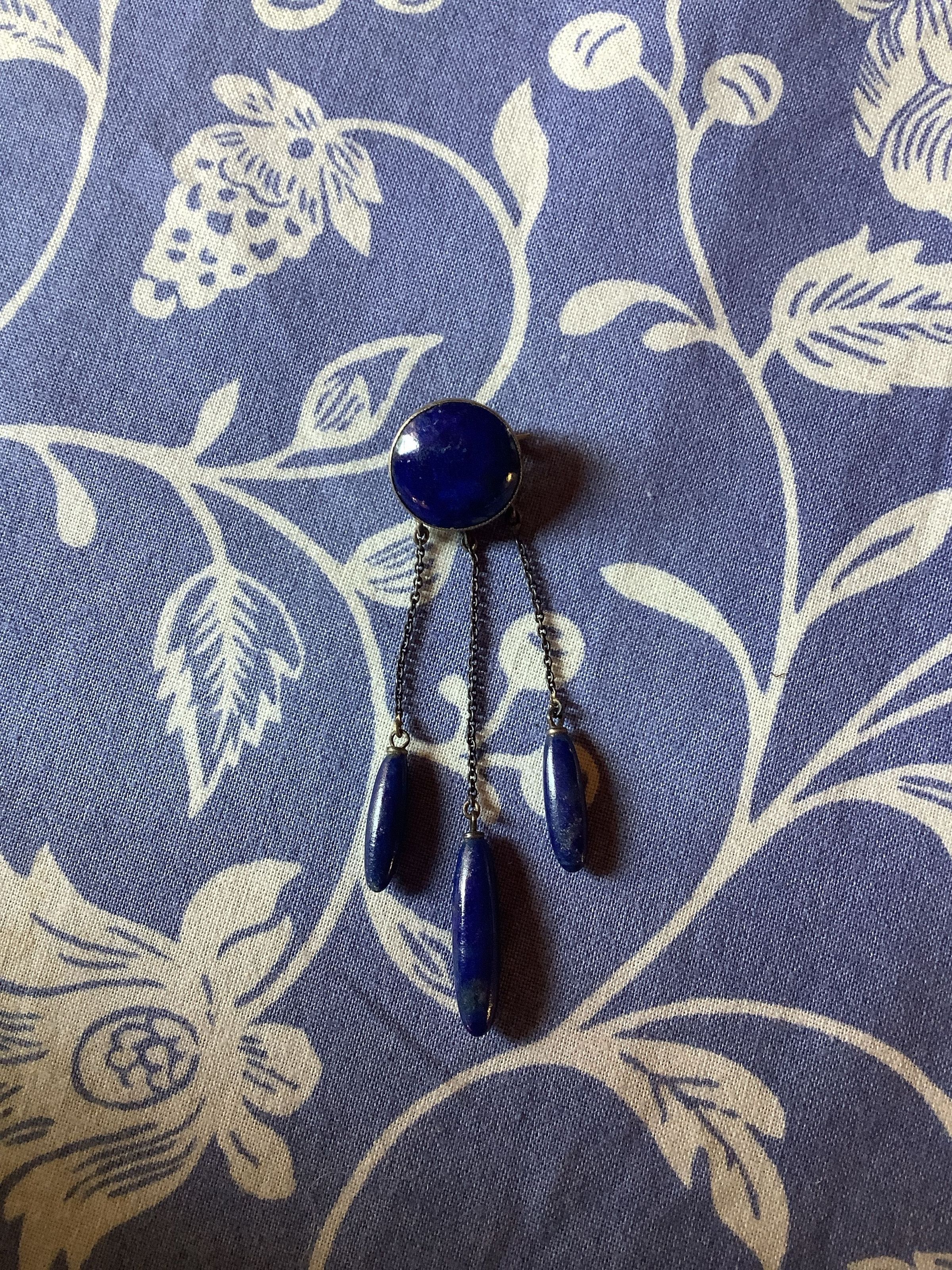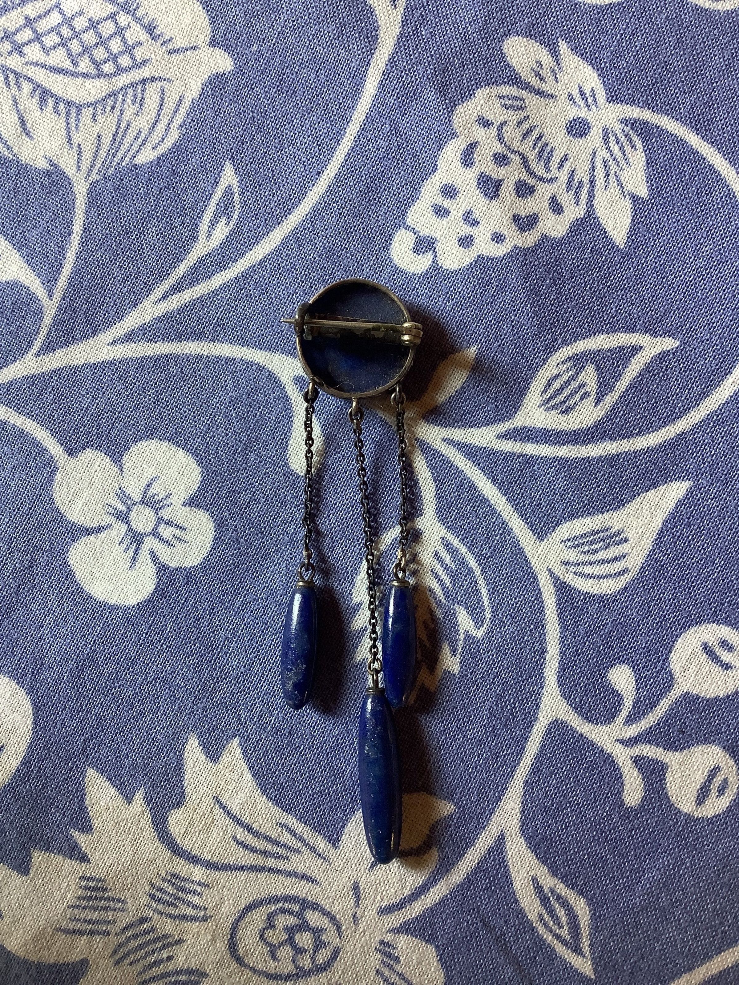 A brooch with a circular lapis lazuli stone connected to three lapis lazuli oblong pendants hanging from a fine, silver toned chain.