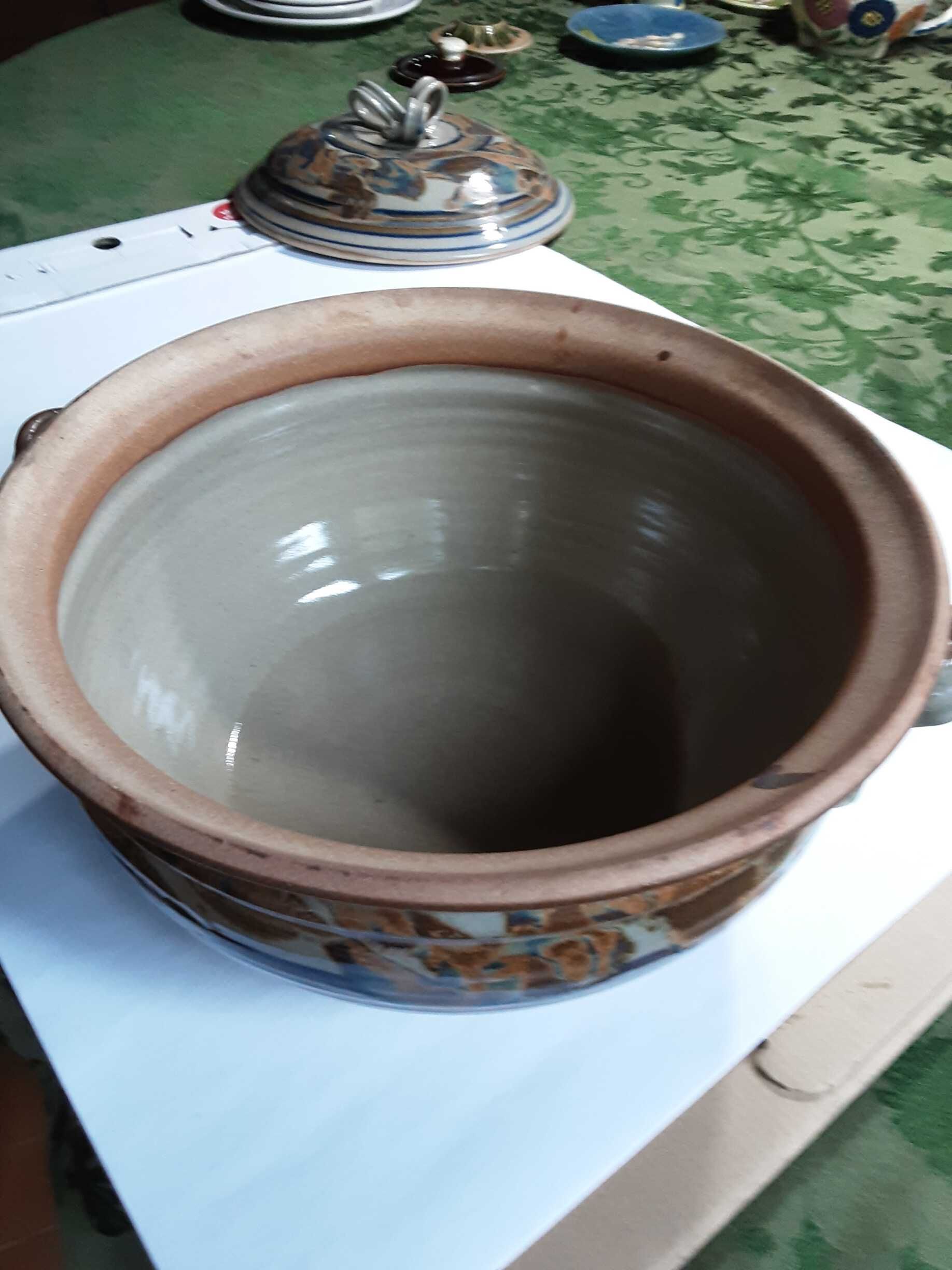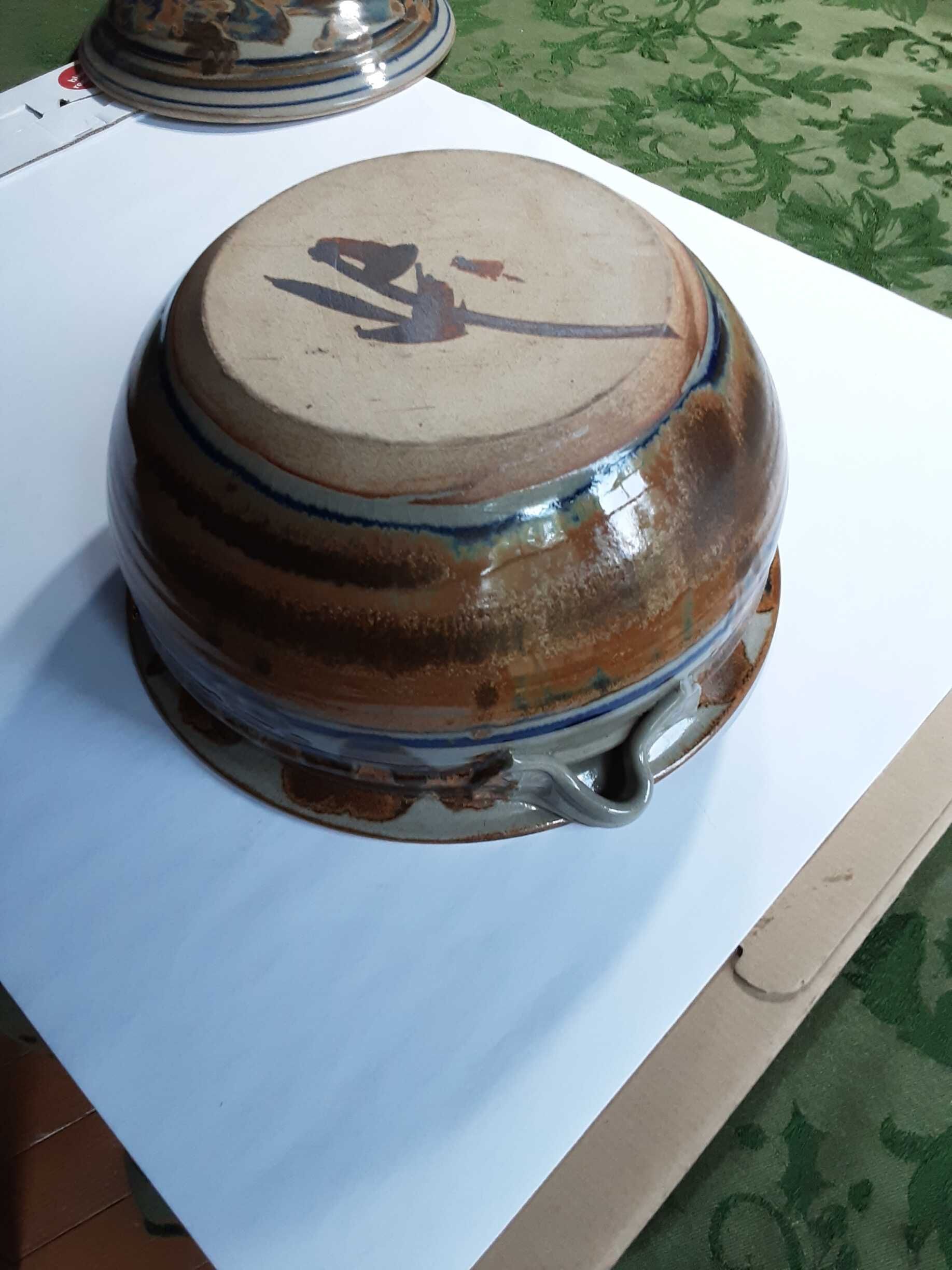 Deep round ceramic casserole dish with matching lid (three ribbons of ceramic as a handle on the lid), mostly light gray on the inside with a rim of light brown, and designs along the sides in a theme of browns and bluesInscription/Signature/Marks