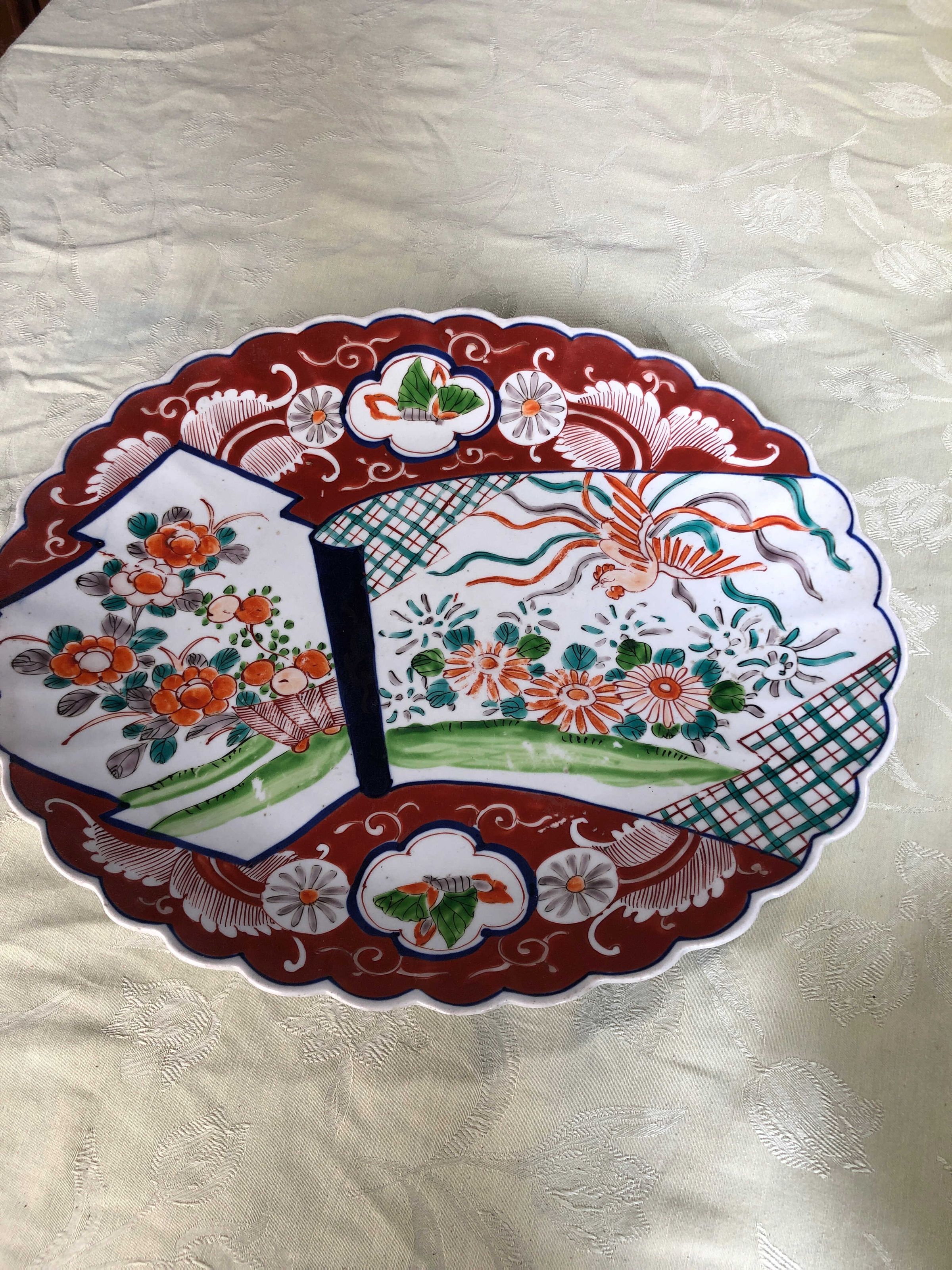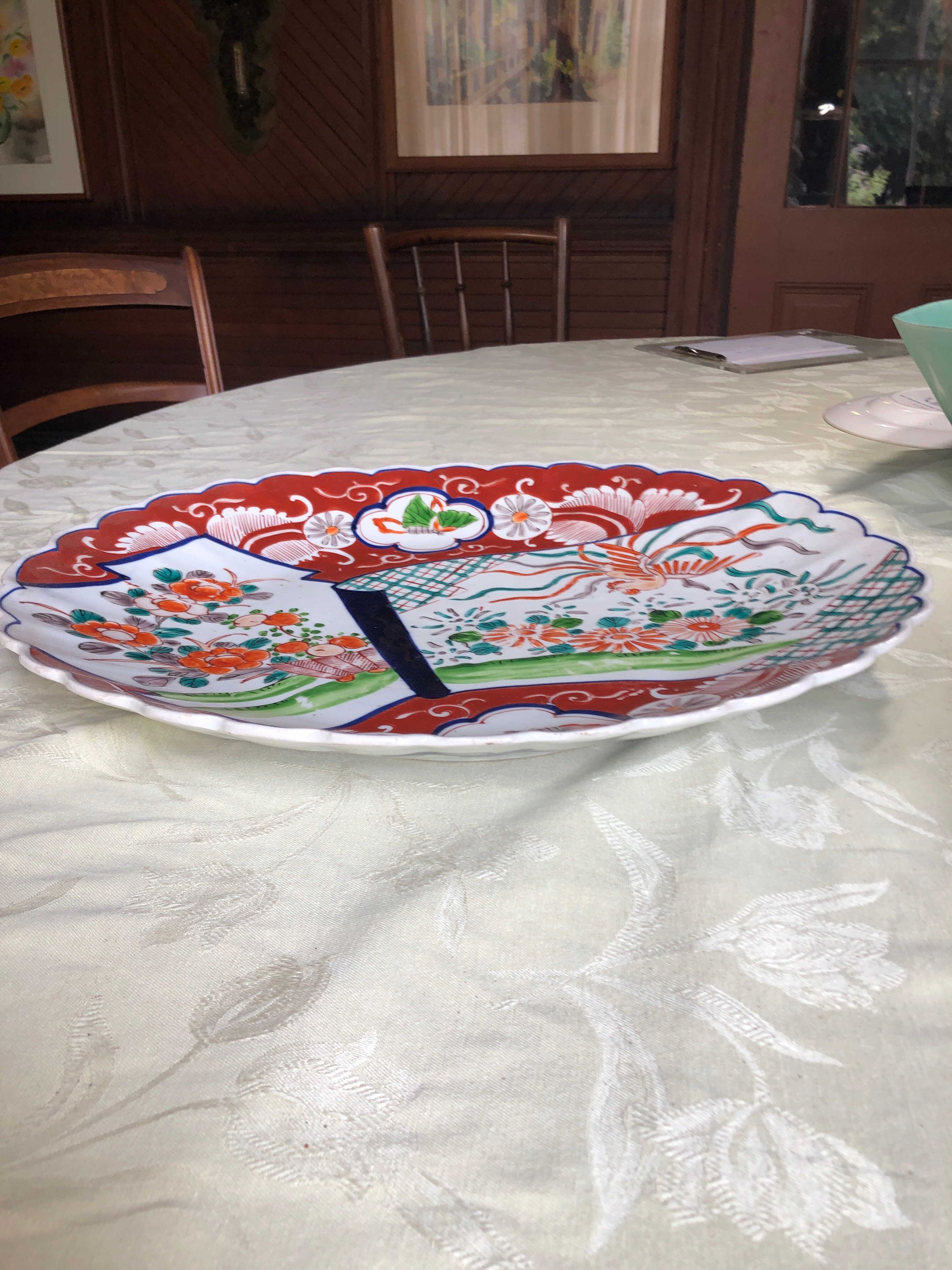 Large ceramic serving platter with scalloped edge, red background with white curlicues and leaves, and white foreground painted with a lively pattern of sections of blue and orange plaid, flowers in orange and blue with a bird trailing ribbons of orange, blue and gray. Bottom has four equidistant markings of dark blue thick solid lines with curves thin lines, as well as blue concentric circles in the middle.Create Date