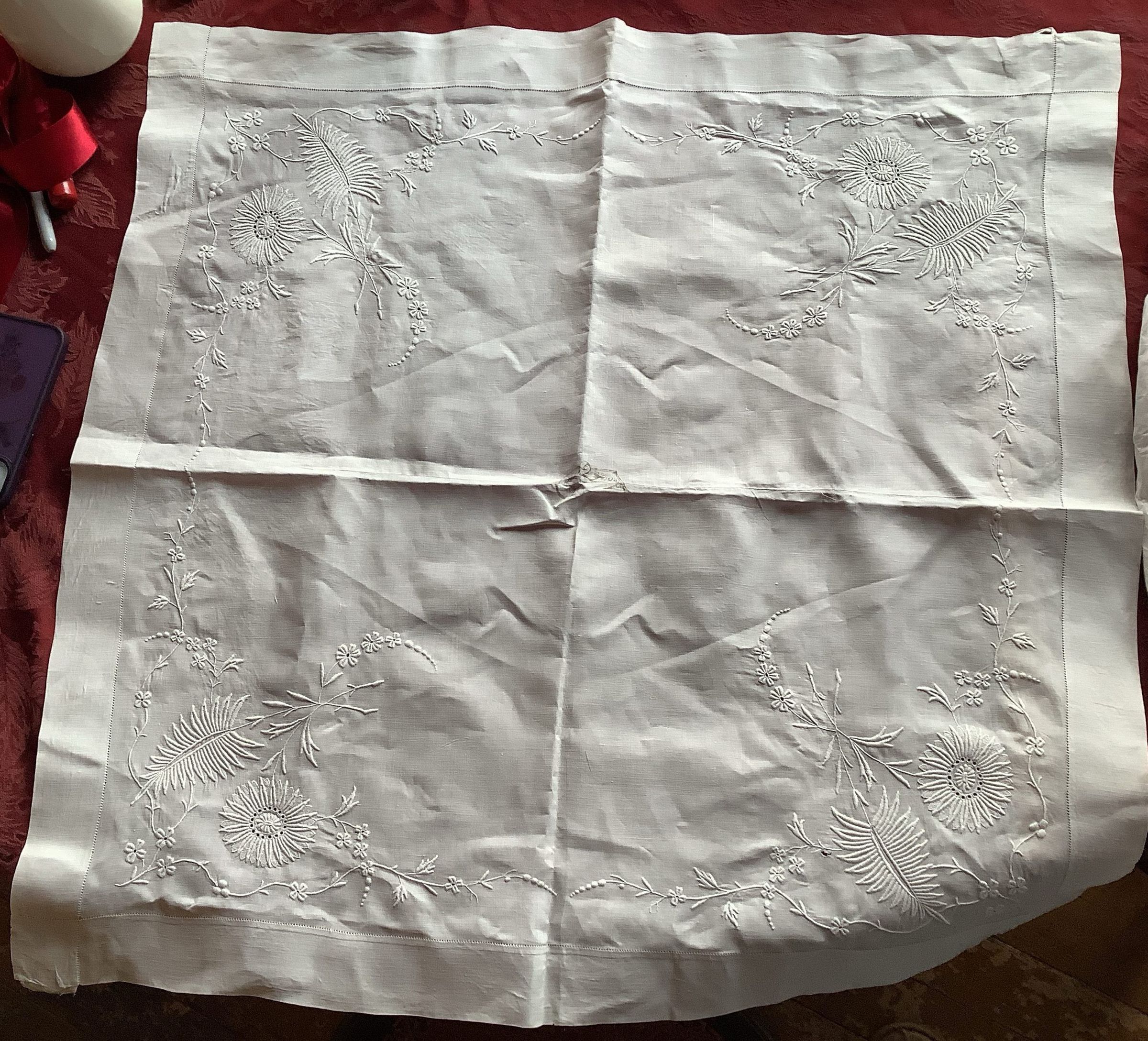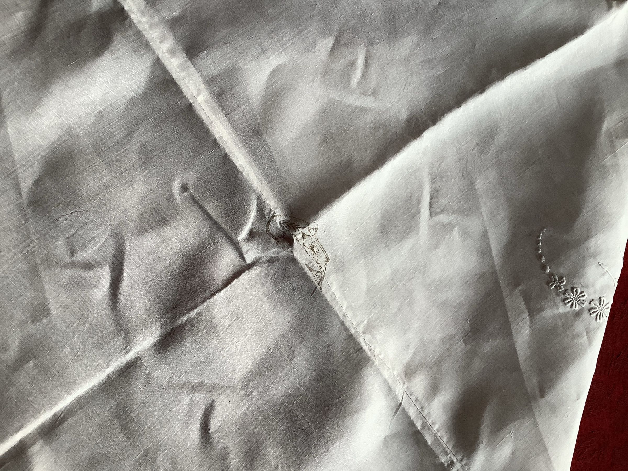 This is a large rectangular textile with flowers and germs embroidered in the corners. There is a small printed “C” design in the very middle, the “C” takes place right where the sewn seam is and has been distorted. There is some significant creasing. There is a sewn seam down the middle that stops before reaching the edges.Create Date