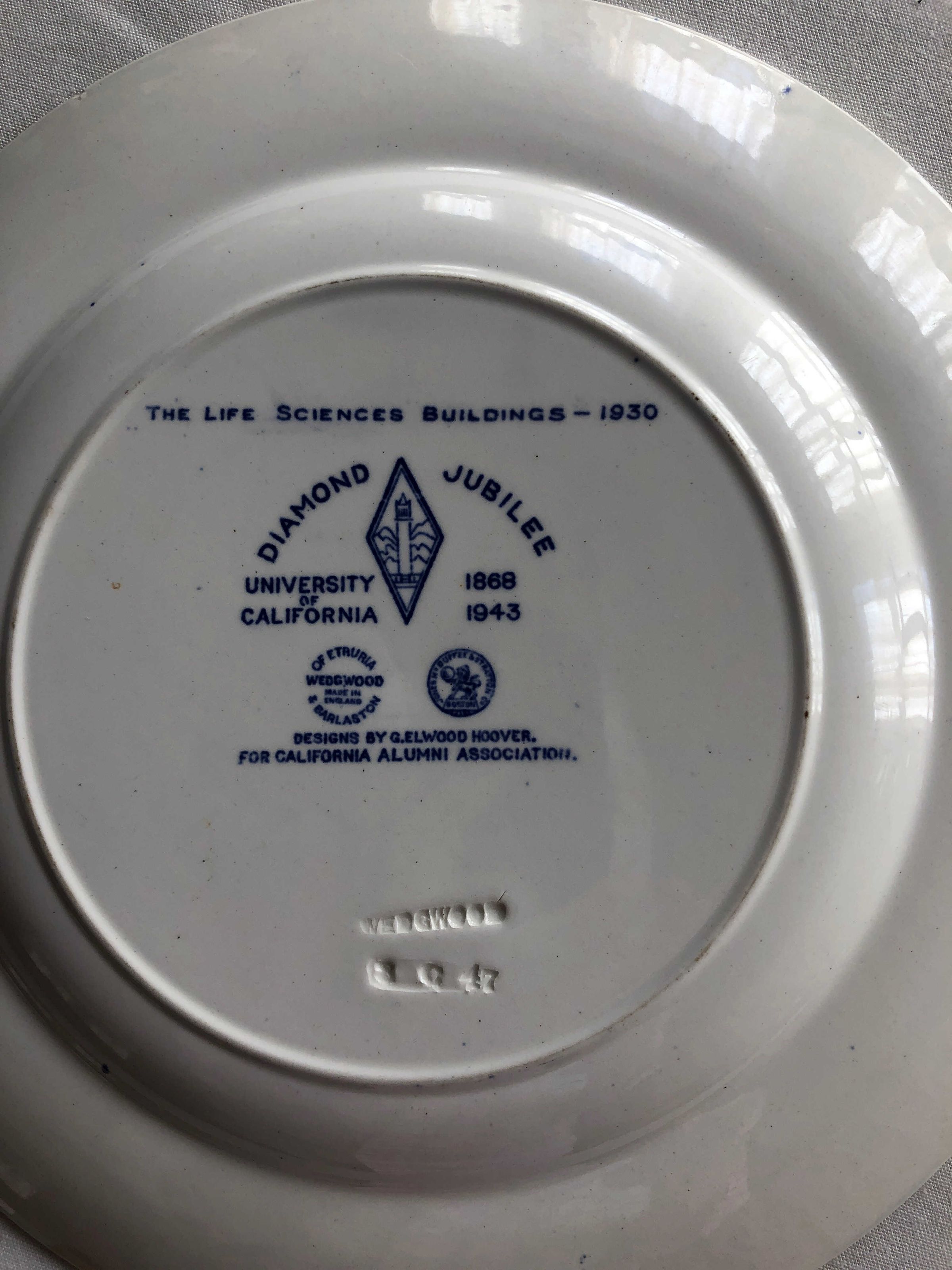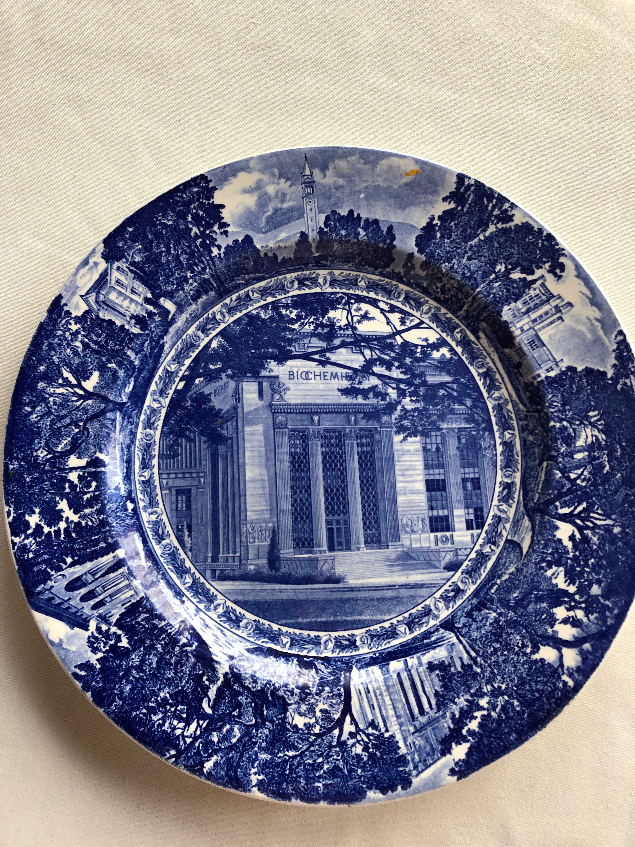 Ceramic plate done in blues on white background, issued by the University of California Berkeley, depicting the Life Sciences Building and several other notable buildings on campus.Inscription/Signature/Marks