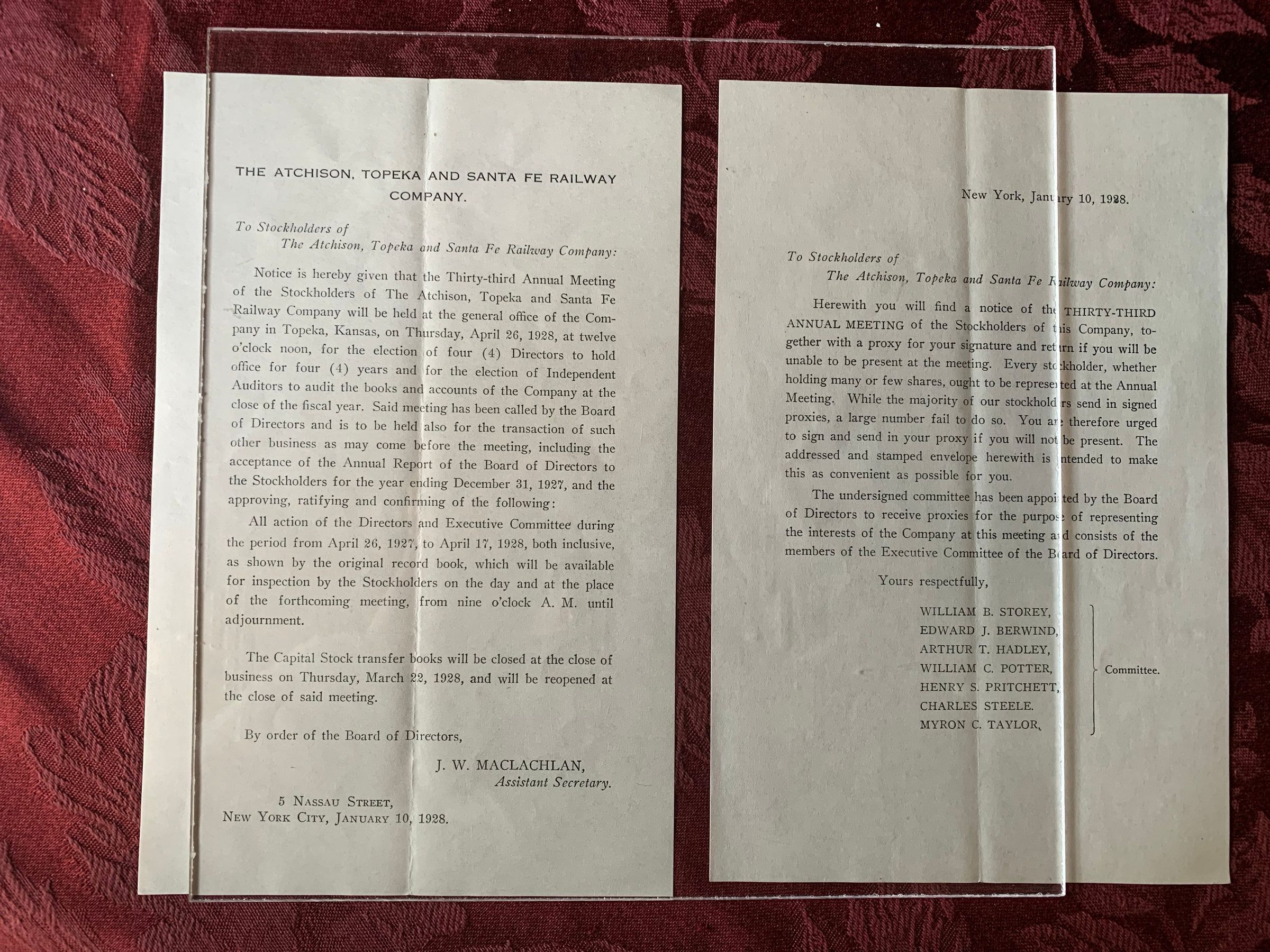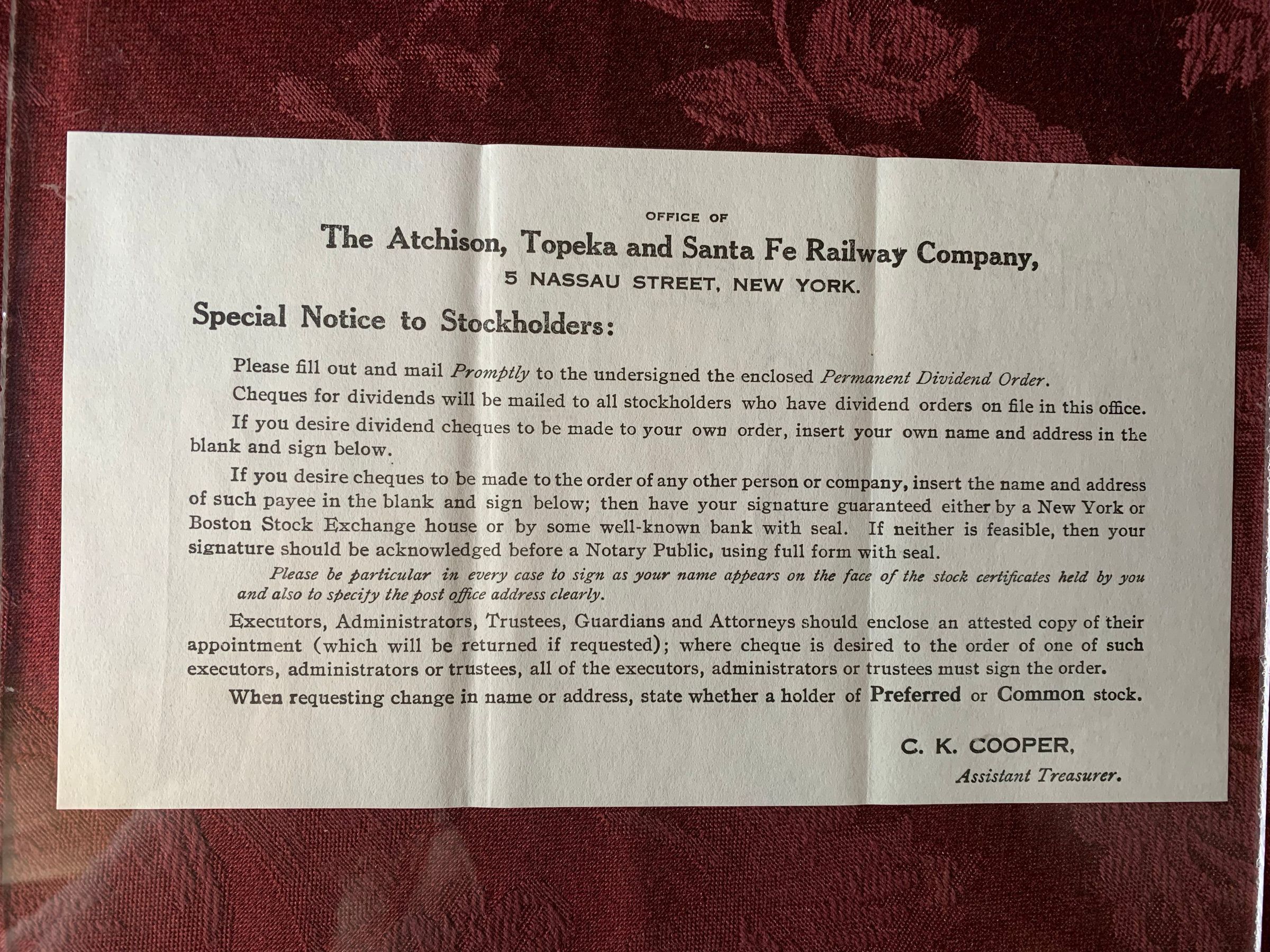 Letter from The Atchison, Topeka and Santa Fe Railway Company. Containing stockholder meeting information, dated from January 10, 1928. Includes a special notice to stockholders.Create Date