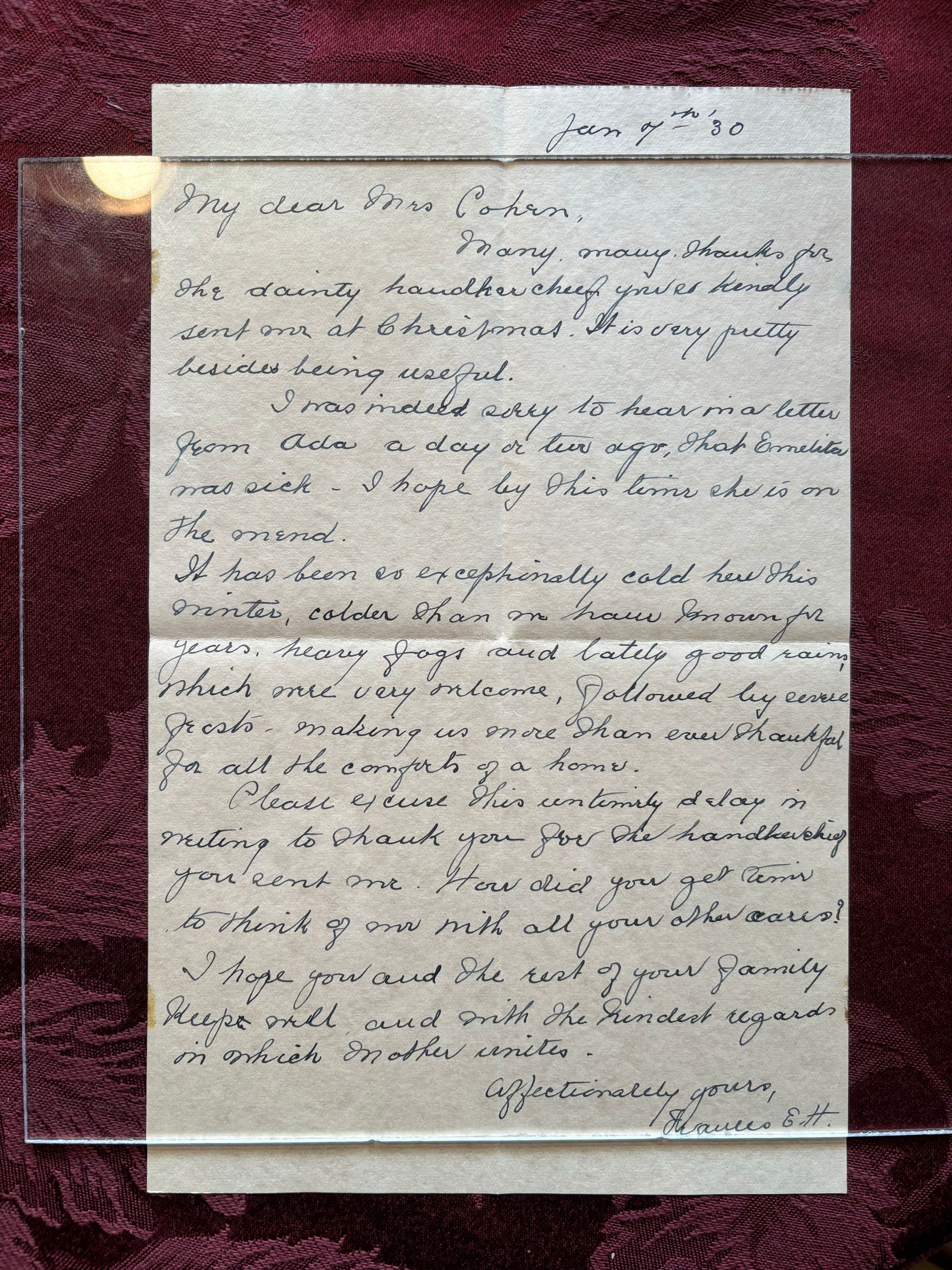 This is a letter from one of Emma's friends Frances E. H. she is thanking Emma for the handkerchief Christmas gift, and writing about the cold weather. She also hopes for Emelita's recovery from her illness.Create Date