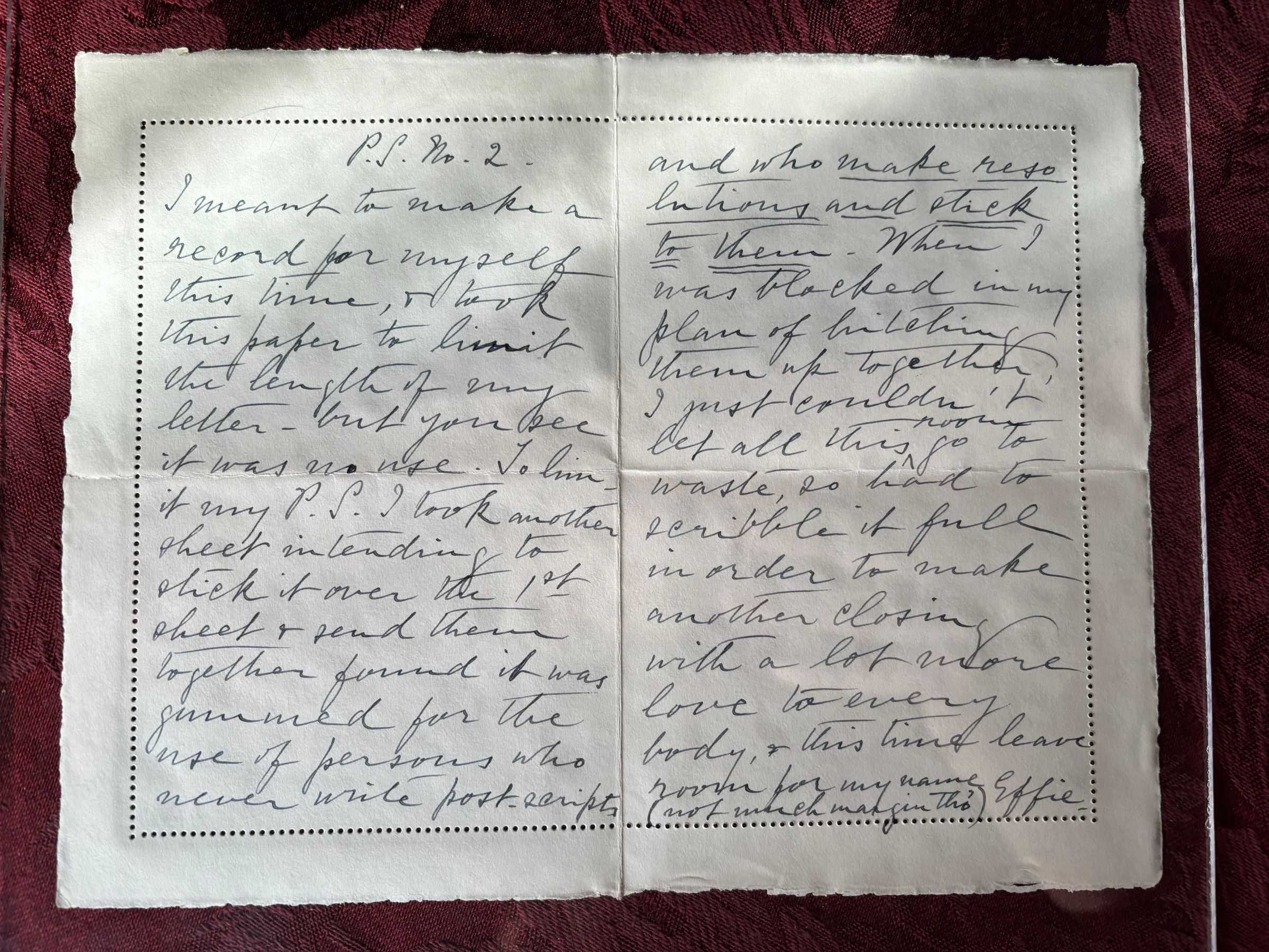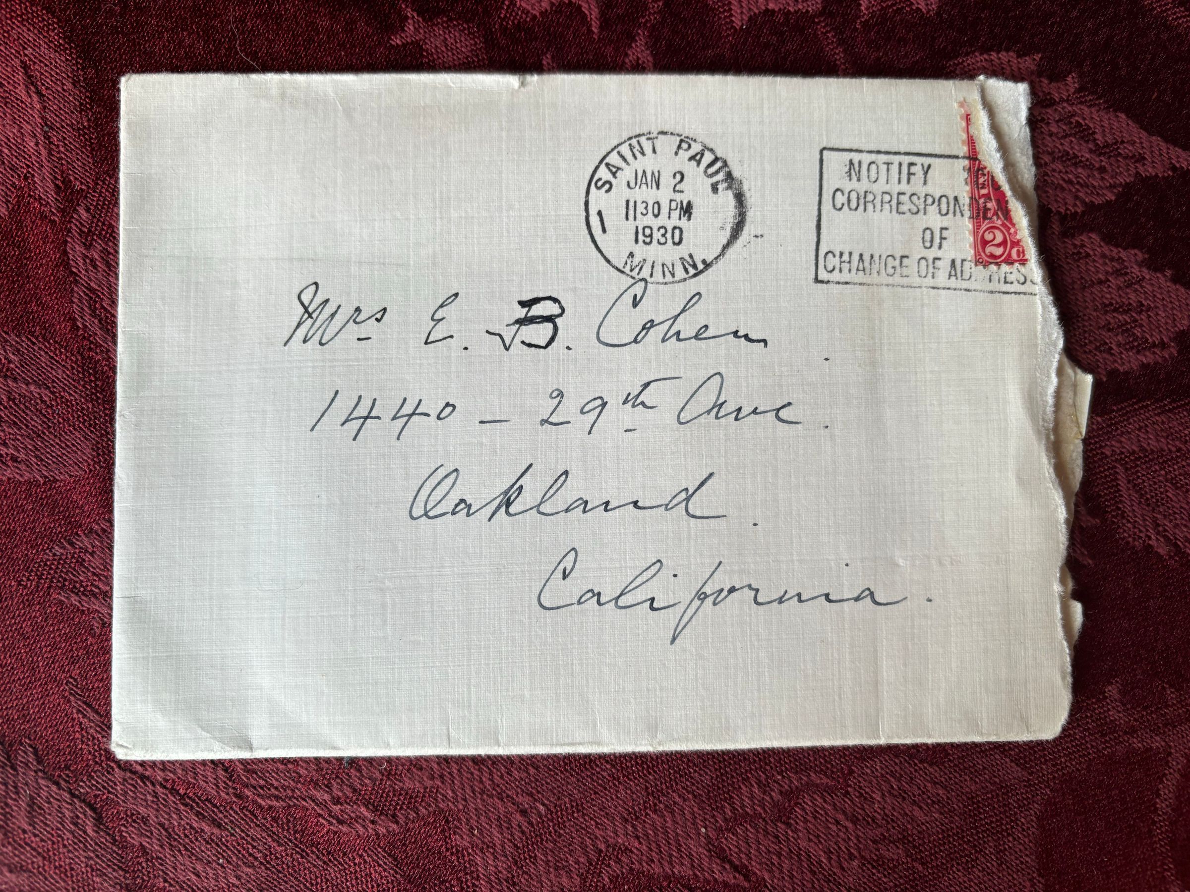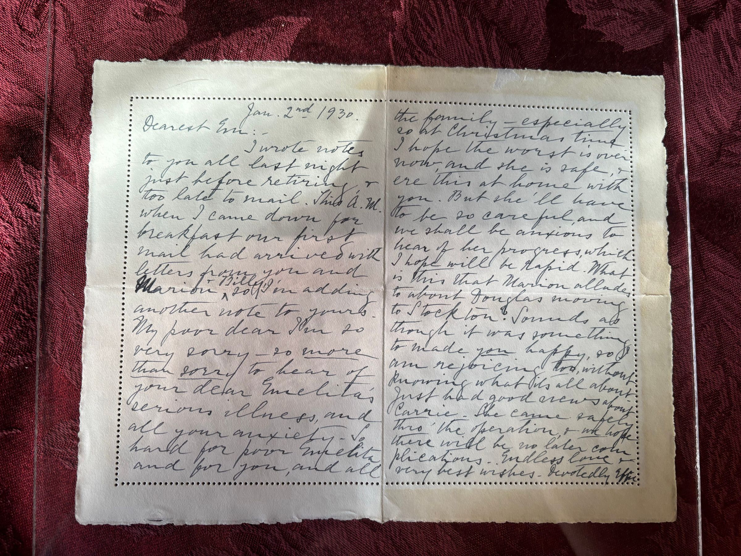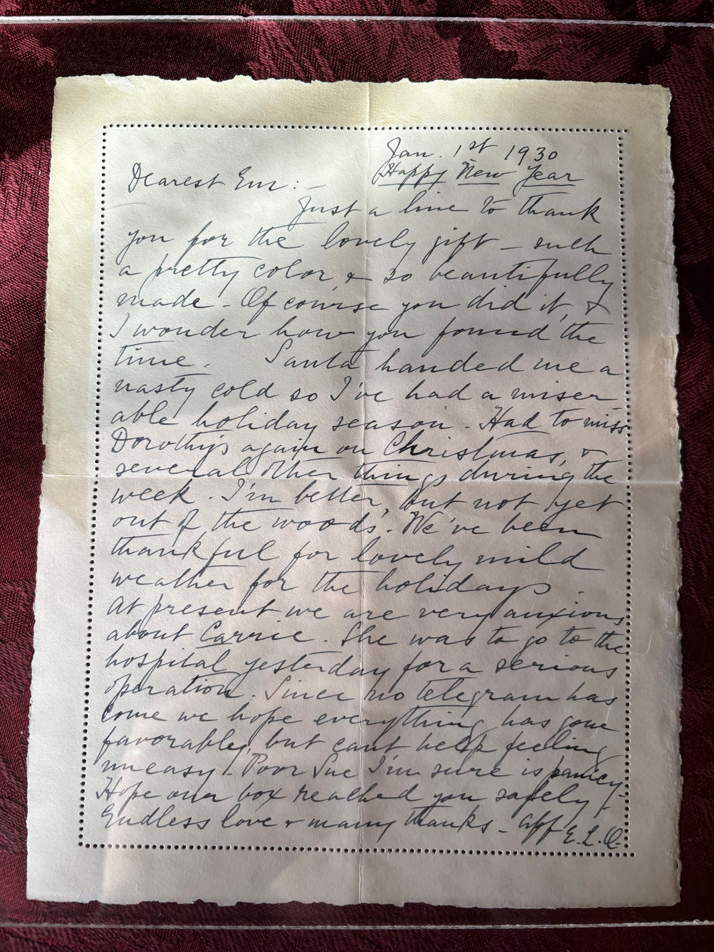 There are 2 different letter from Effie in this envelope, one is dated Jan. 1st, 1930 and the other is Jan 2nd, 1930. The first contains information about Effie having a cold and thanking Emma for her Christmas gift that she gave her. The second is Effie wishing for Emelita's health and recovery after hearing of her illness.Create Date