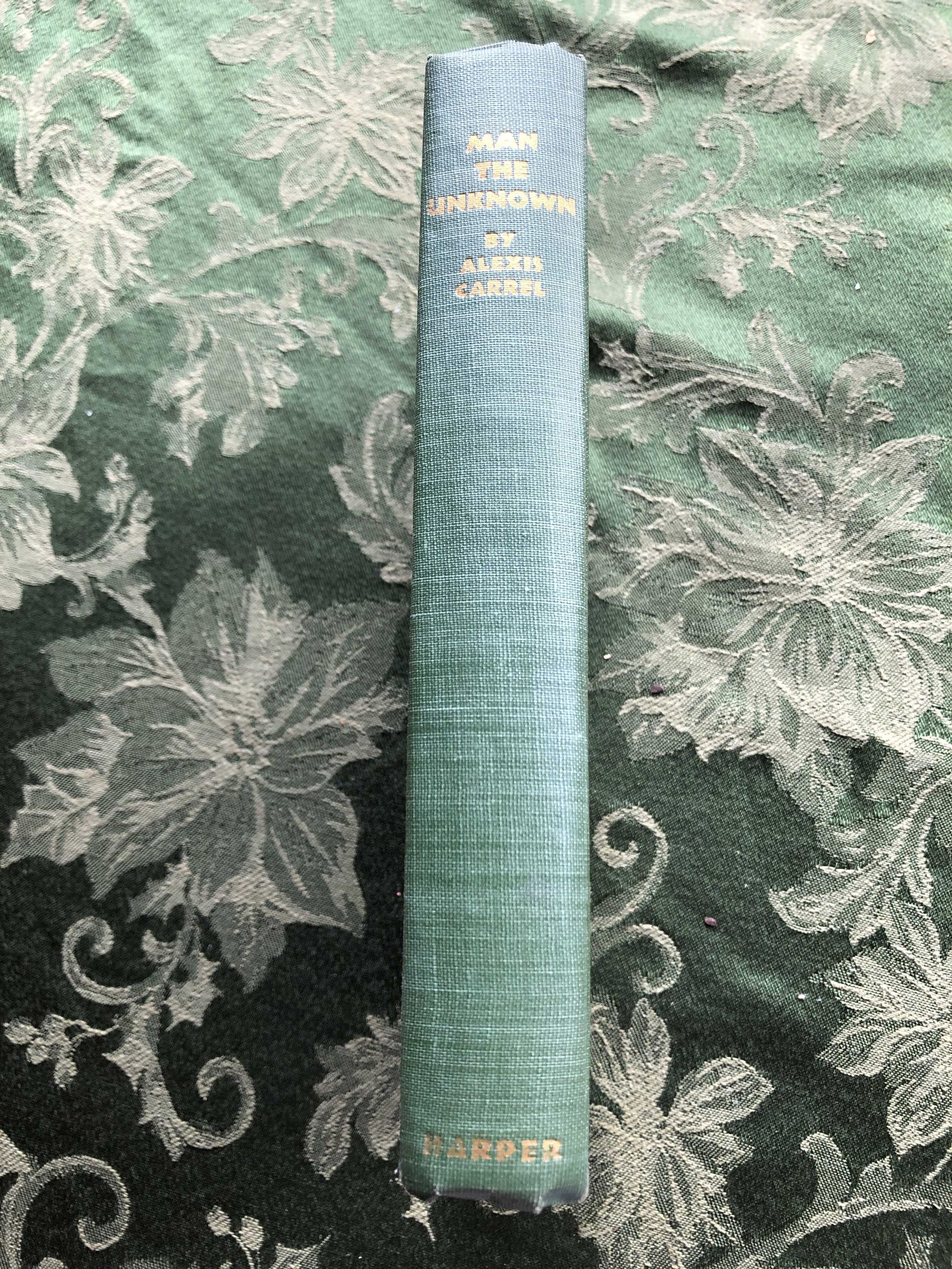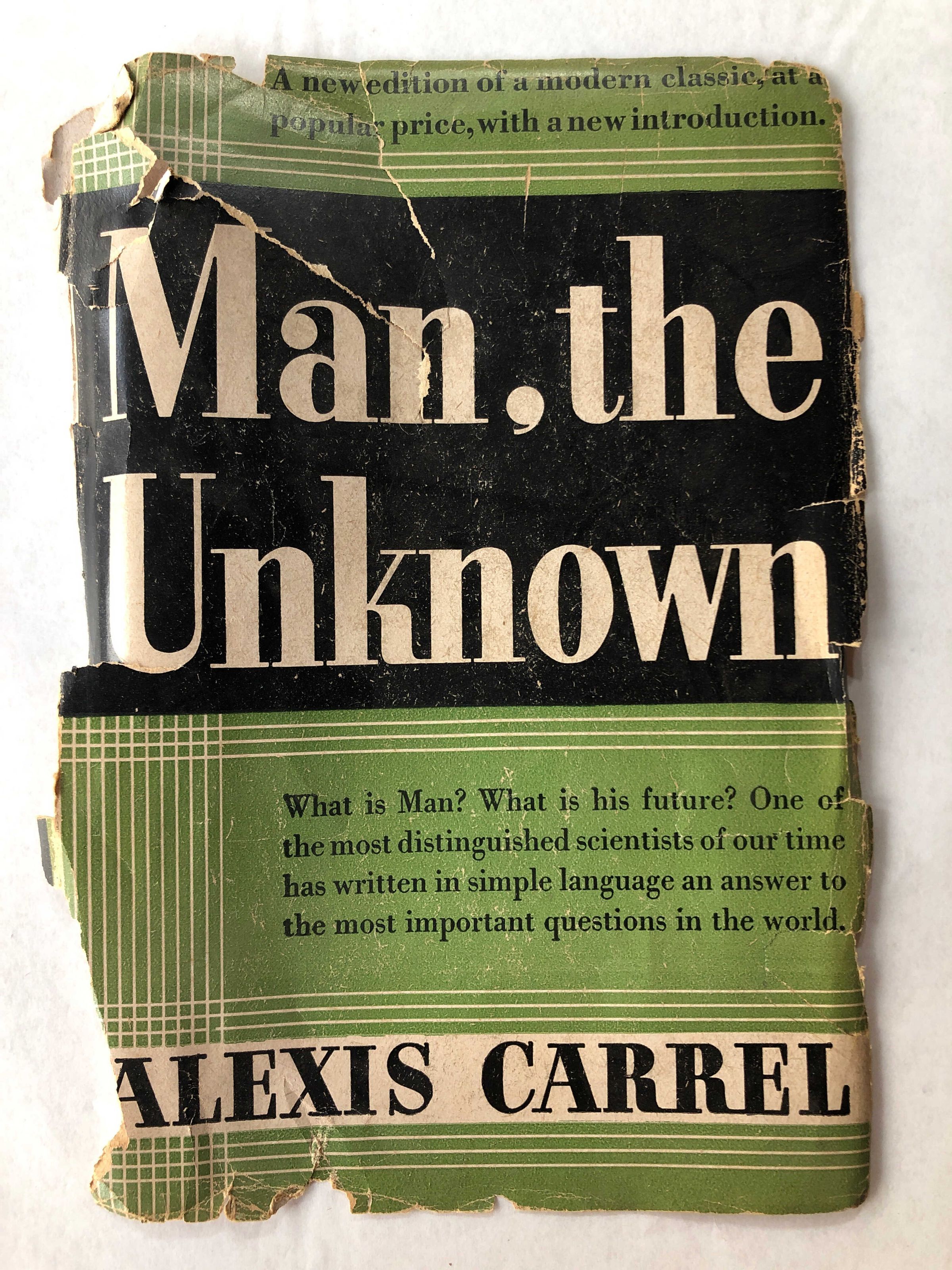Man, the Unknown (L'Homme, cet inconnu) is a best-selling[1] 1935 book by Alexis Carrel in which he endeavours to outline a comprehensive account what is known and, more importantly, unknown of the human body and human life. The book elucidates problems of the modern world and possible routes to a better life for human beings. It is specifically known for its advocacy of eugenics and euthanasia. -WikipediaInscription/Signature/Marks