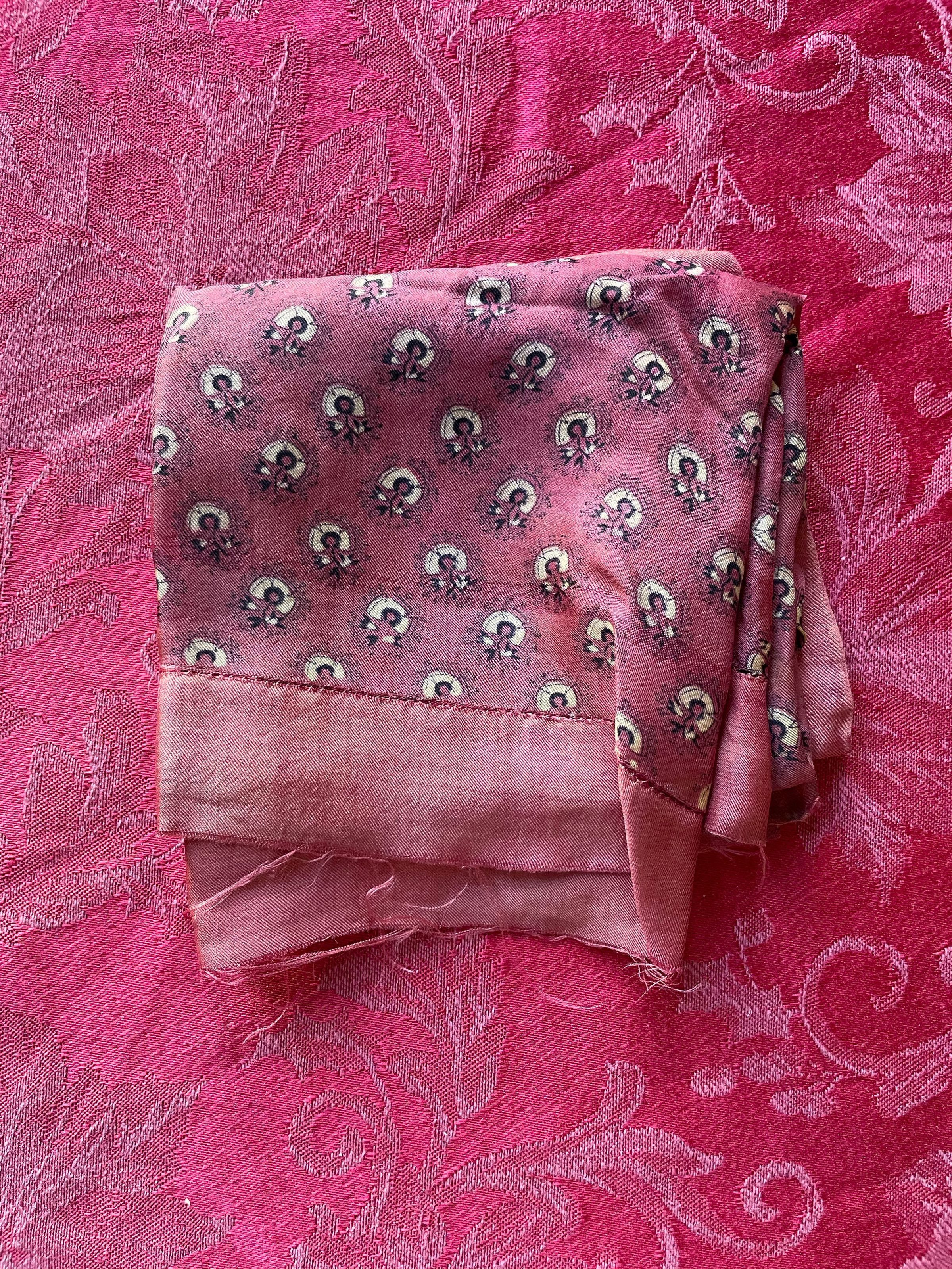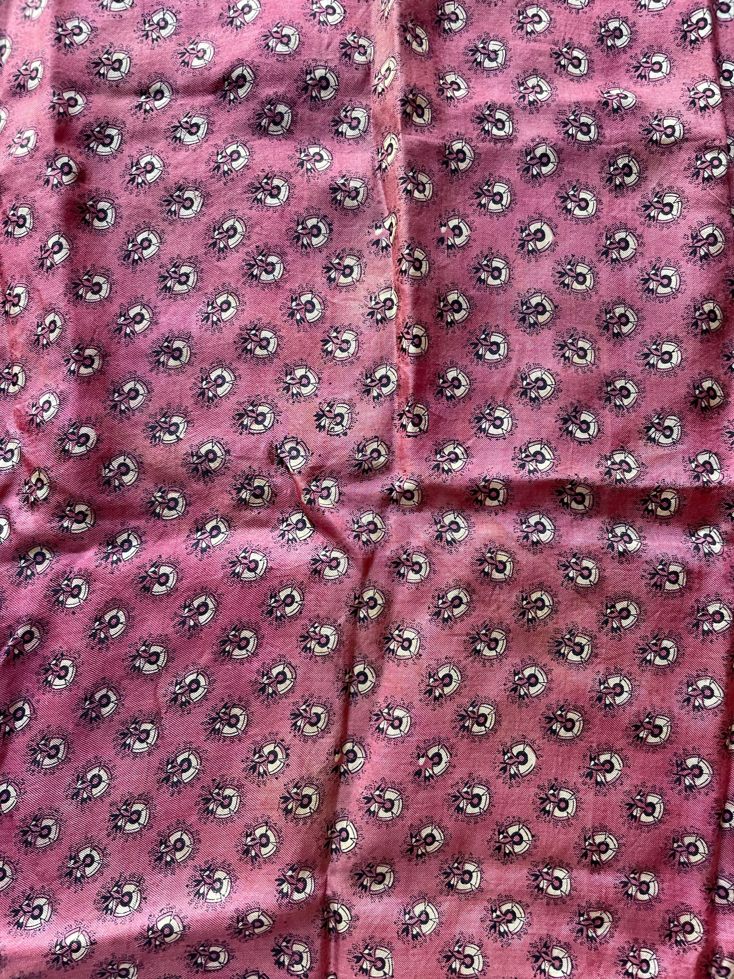 A maroon scarf with an indiscernible pattern littered throughout. It could be a flower, a person, or some other kind of image. There’s a stitched border, followed by a patternless stretch of maroon lining the edges.Create Date