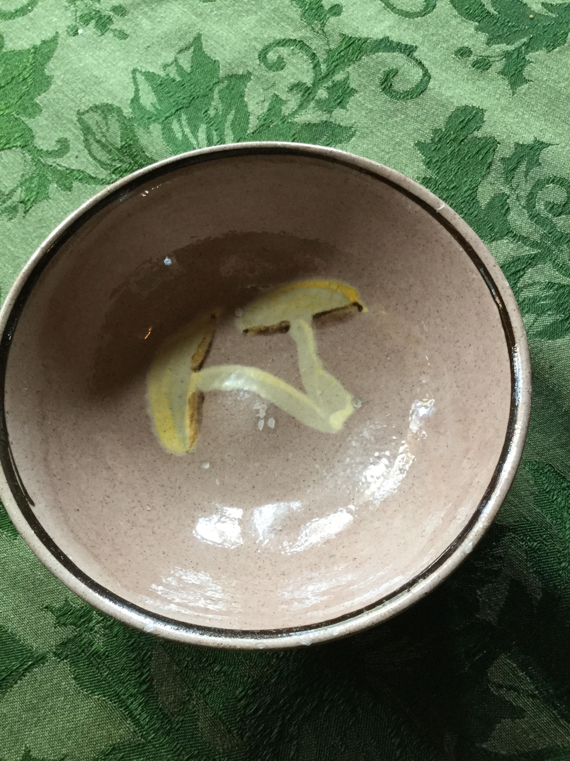 Mushroom brown bowl with dark brown edging and yellow mushrooms painted in the center