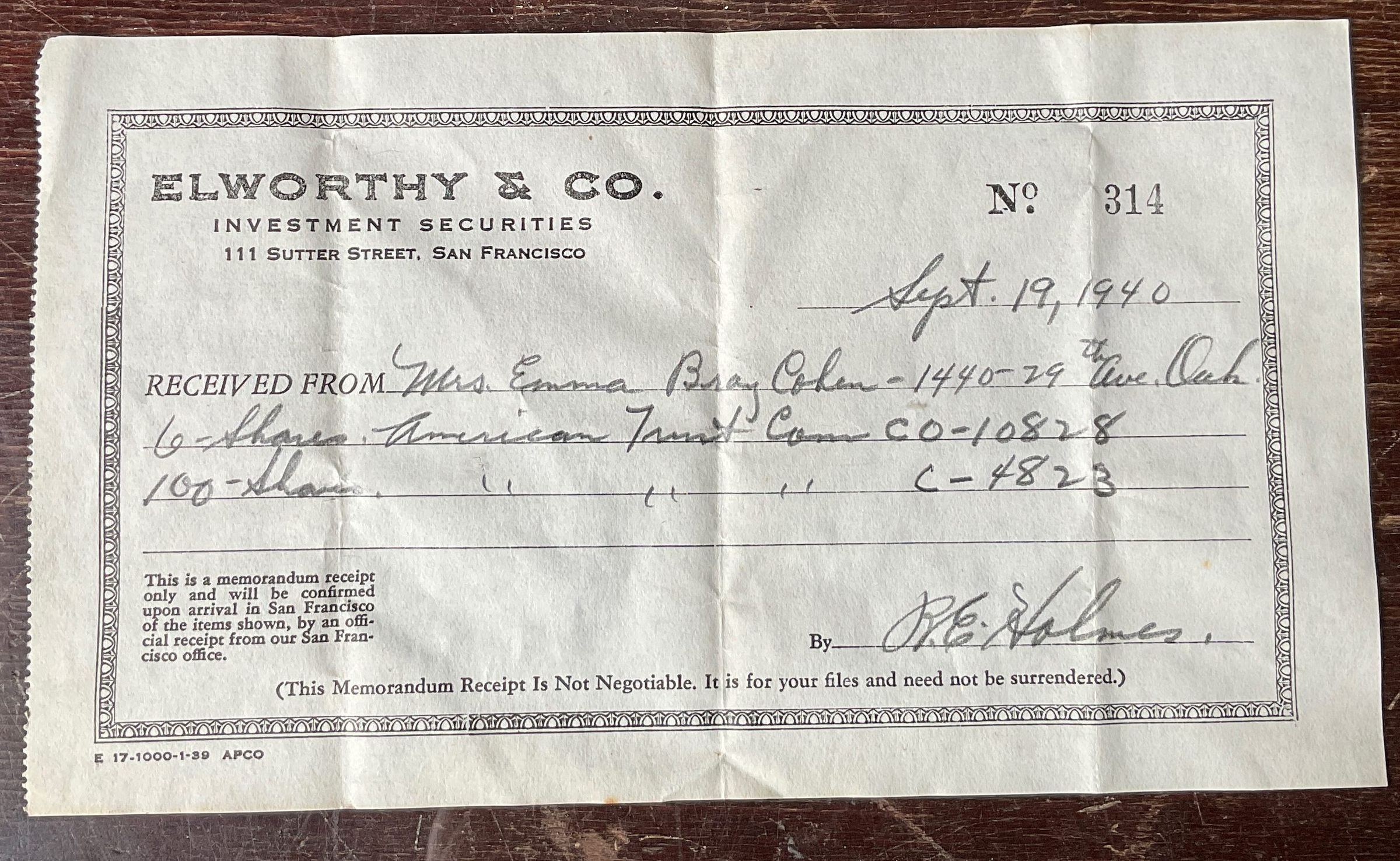 Elworthy & Co Investment Securities memorandum receipt. Received from Emma Bray Cohen