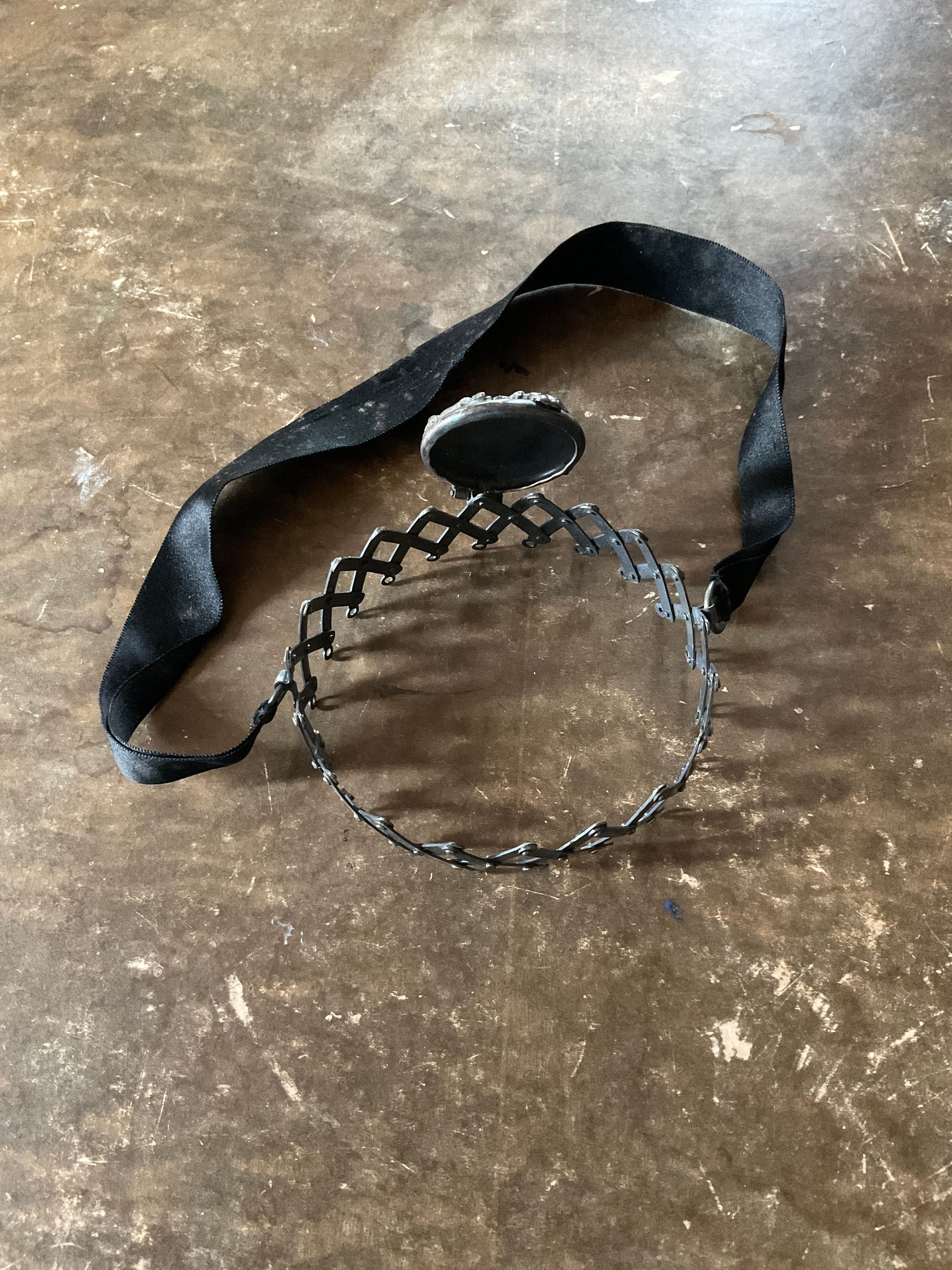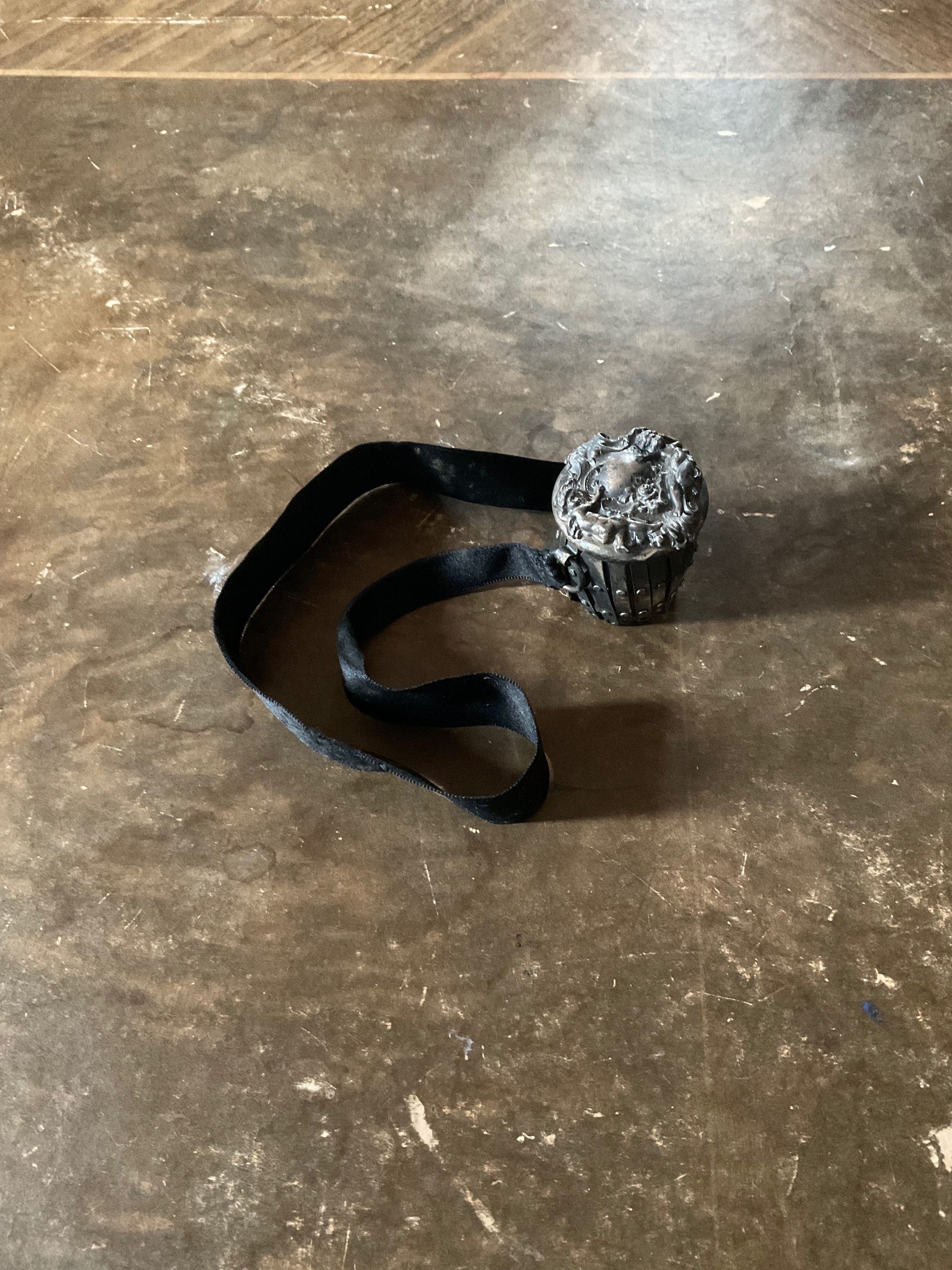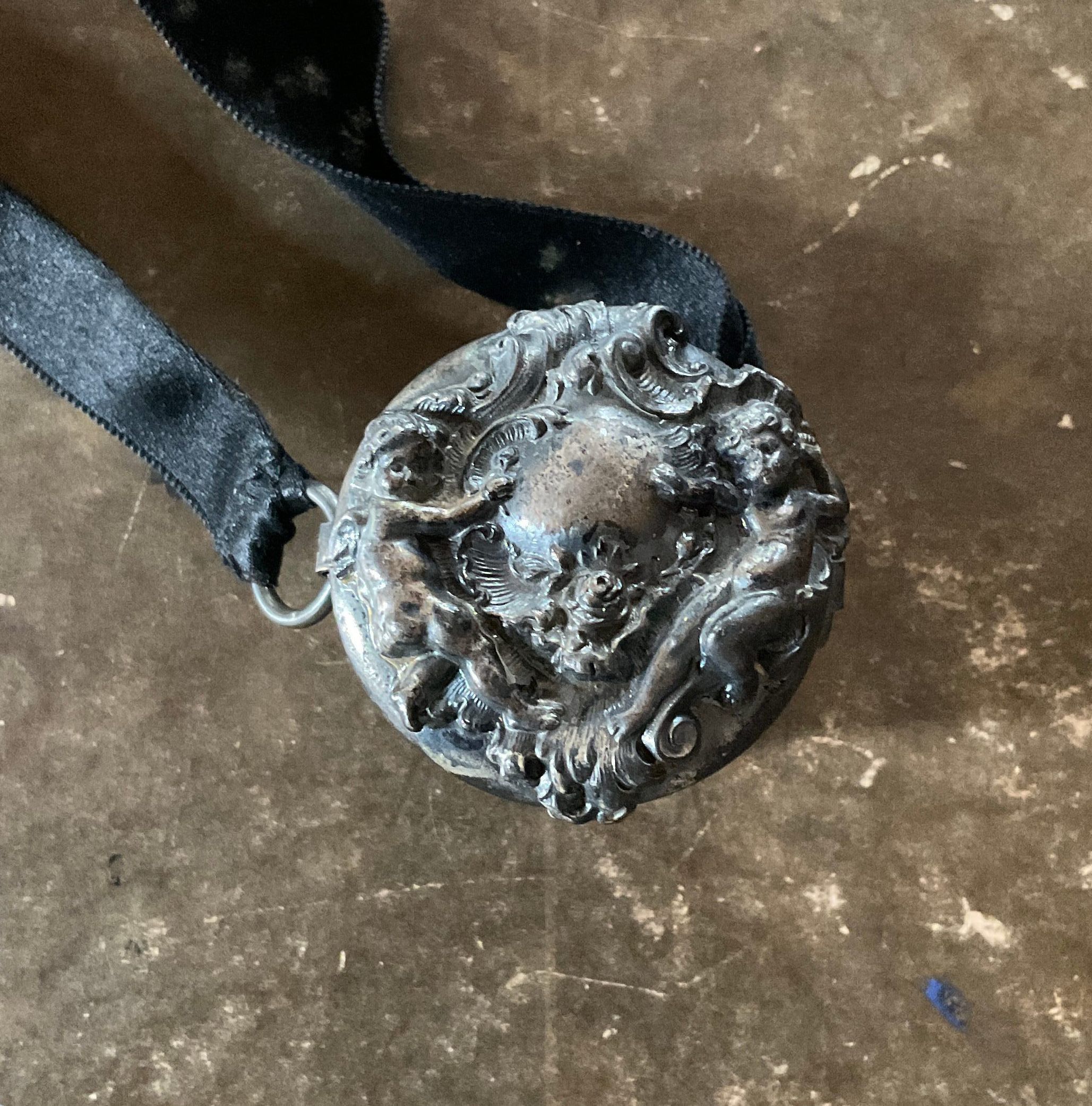 Metal hardware that opens and stretches out. The top lid has cherubs on it as well as some flowers and wind like imagery. When you open the lid you can stretch out the sides, making a larger circular opening. There is a ribbon attached to the sides which acts like a handle.Collection