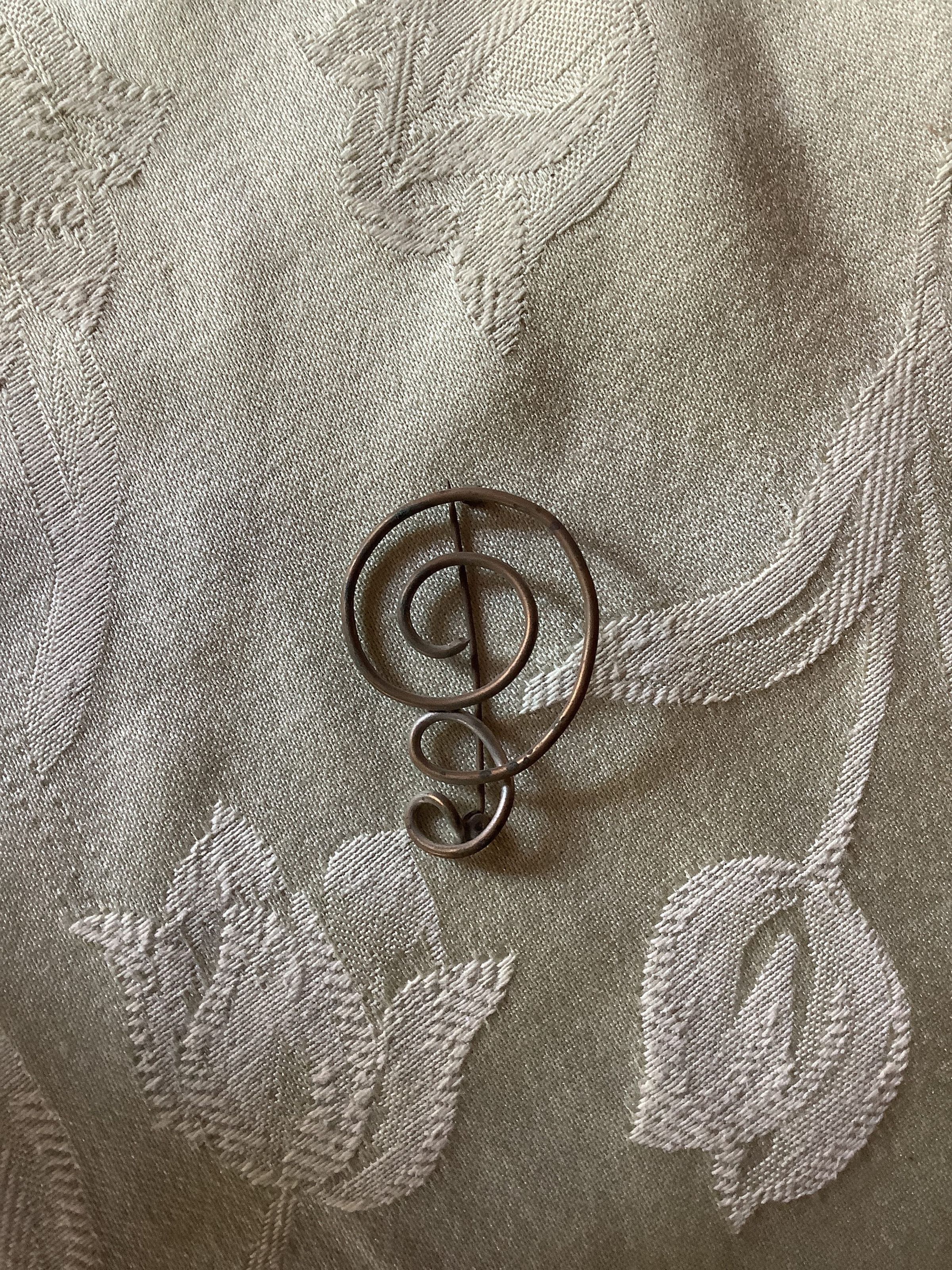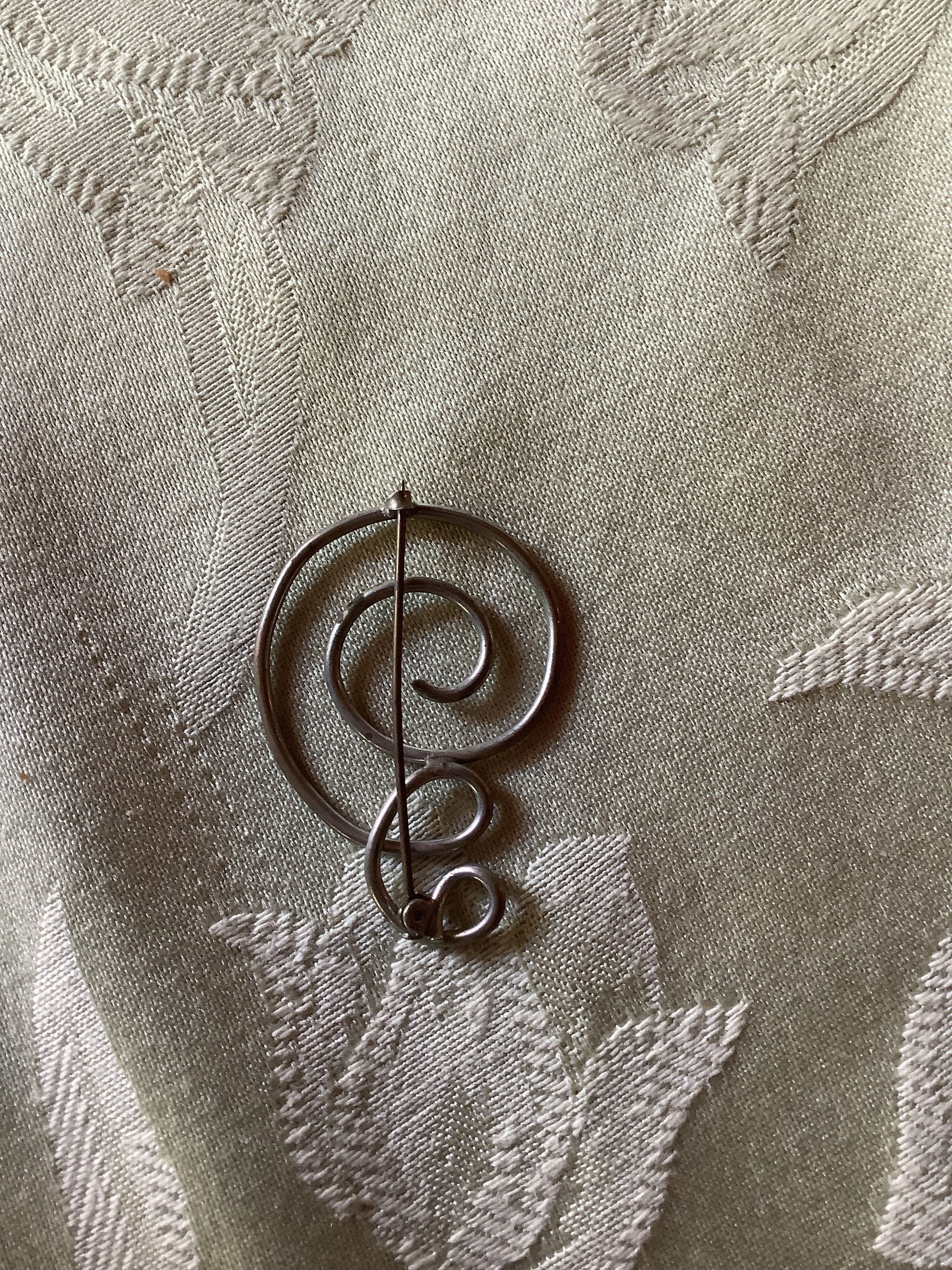 Tarnished bronze tinged, silver metal, spiral shaped pin with bar pin on back.Collection