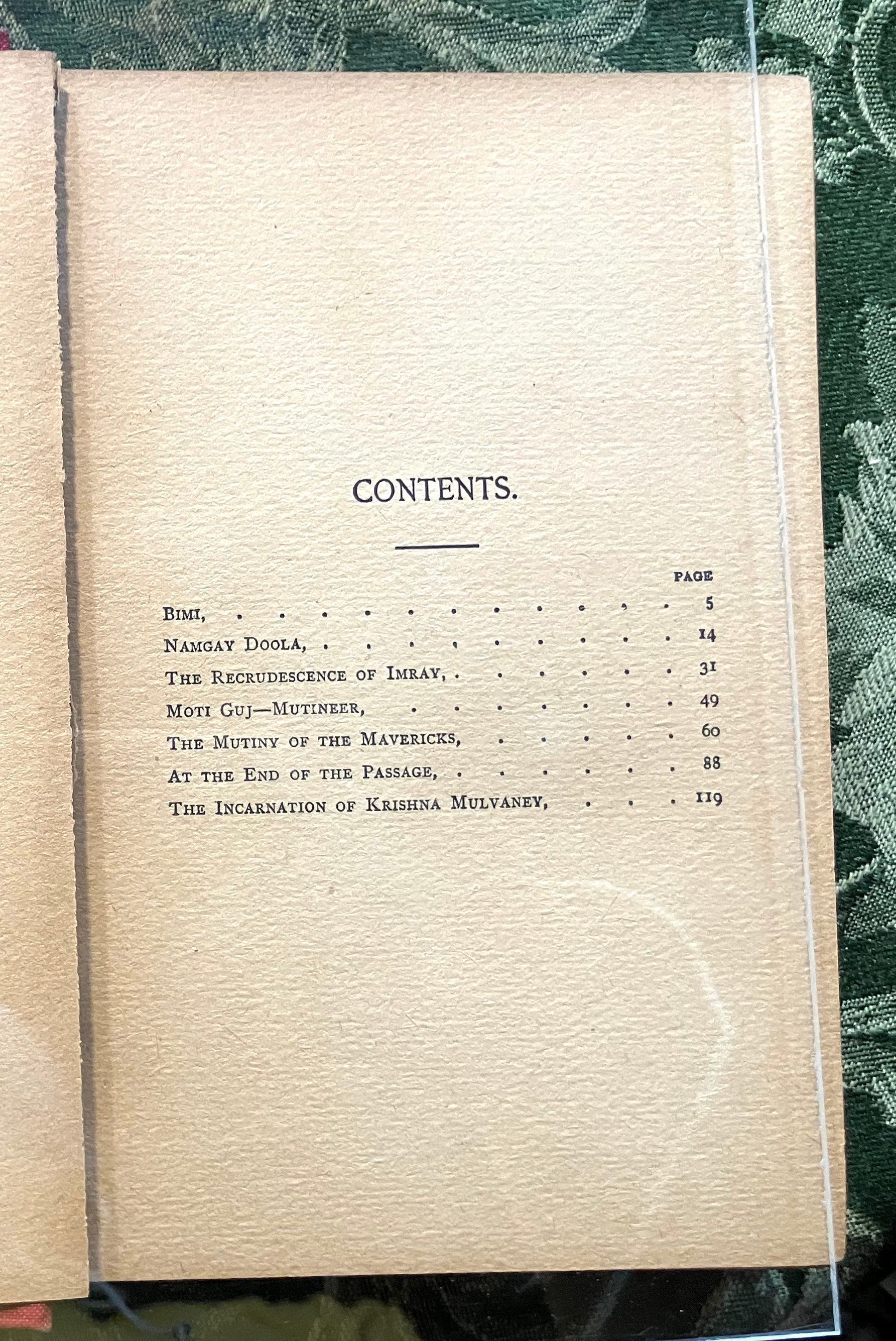 Collection of stories: Bimi -- Namgay Doola -- The recrudescence of Imray -- Moti Guj, mutineer -- The mutiny of the mavericks -- At the end of the passage -- The incarnation of Krishna Mulvaney -- The man who was -- On Greenhow Hill.Collection