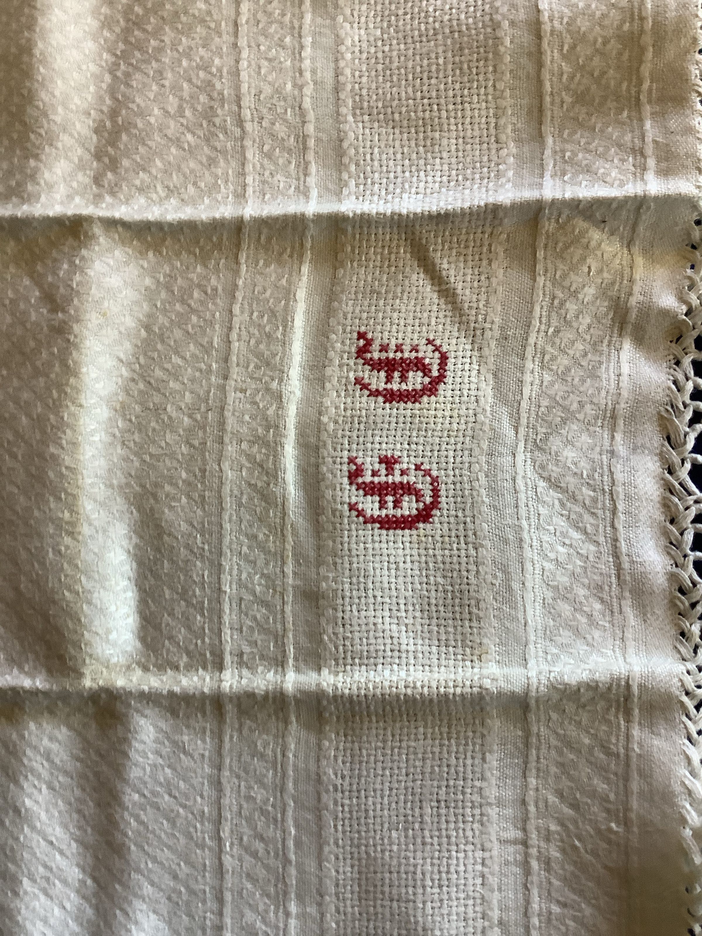 Handtowel with red monogrammed embroidery. There is tassels on two edges.