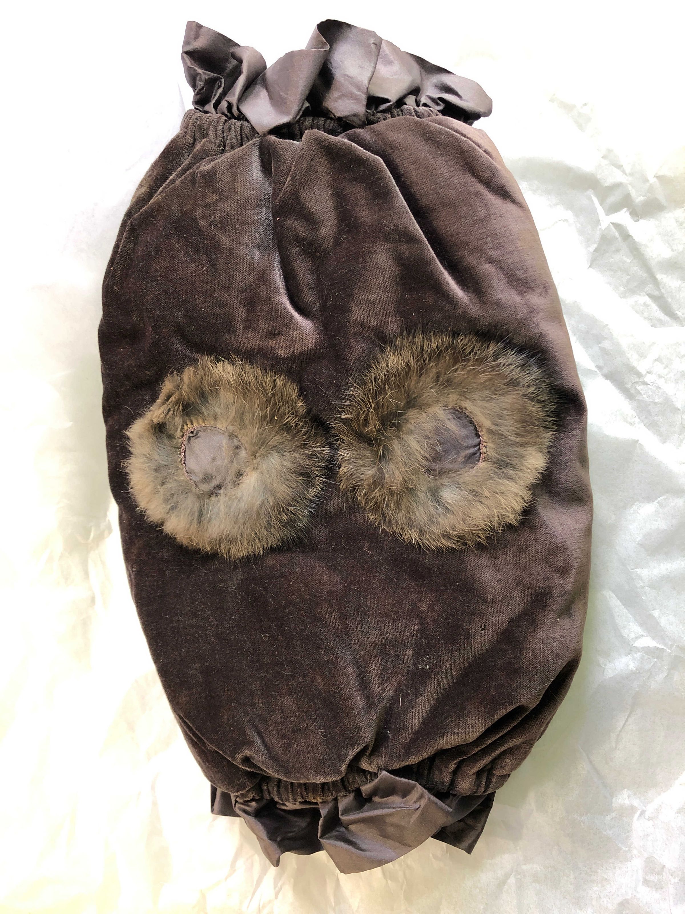 Matching velvet and silk trimmed muff that goes with neck piece. Beaver fur circles on body. Silk trim inside.Made/Created