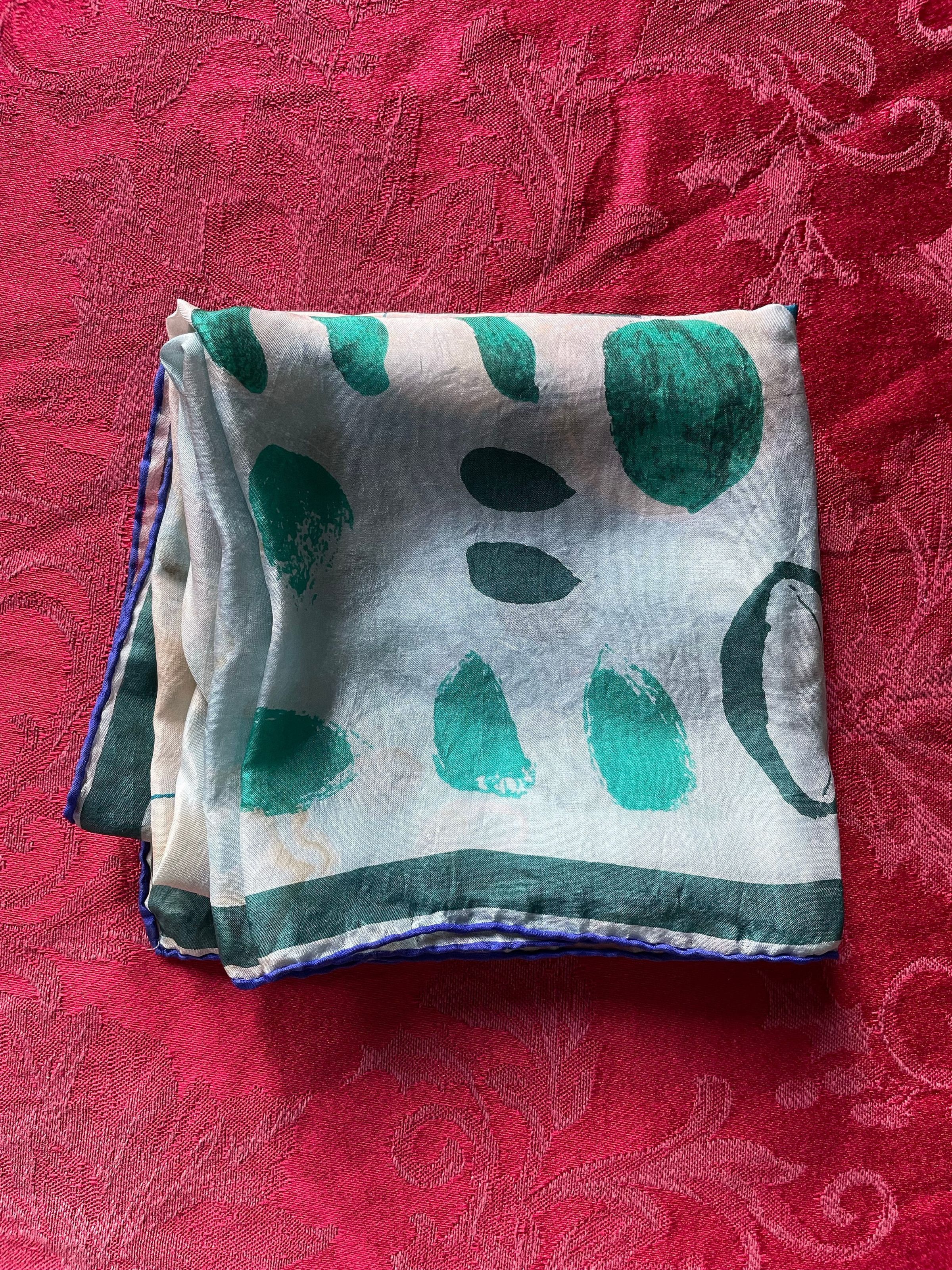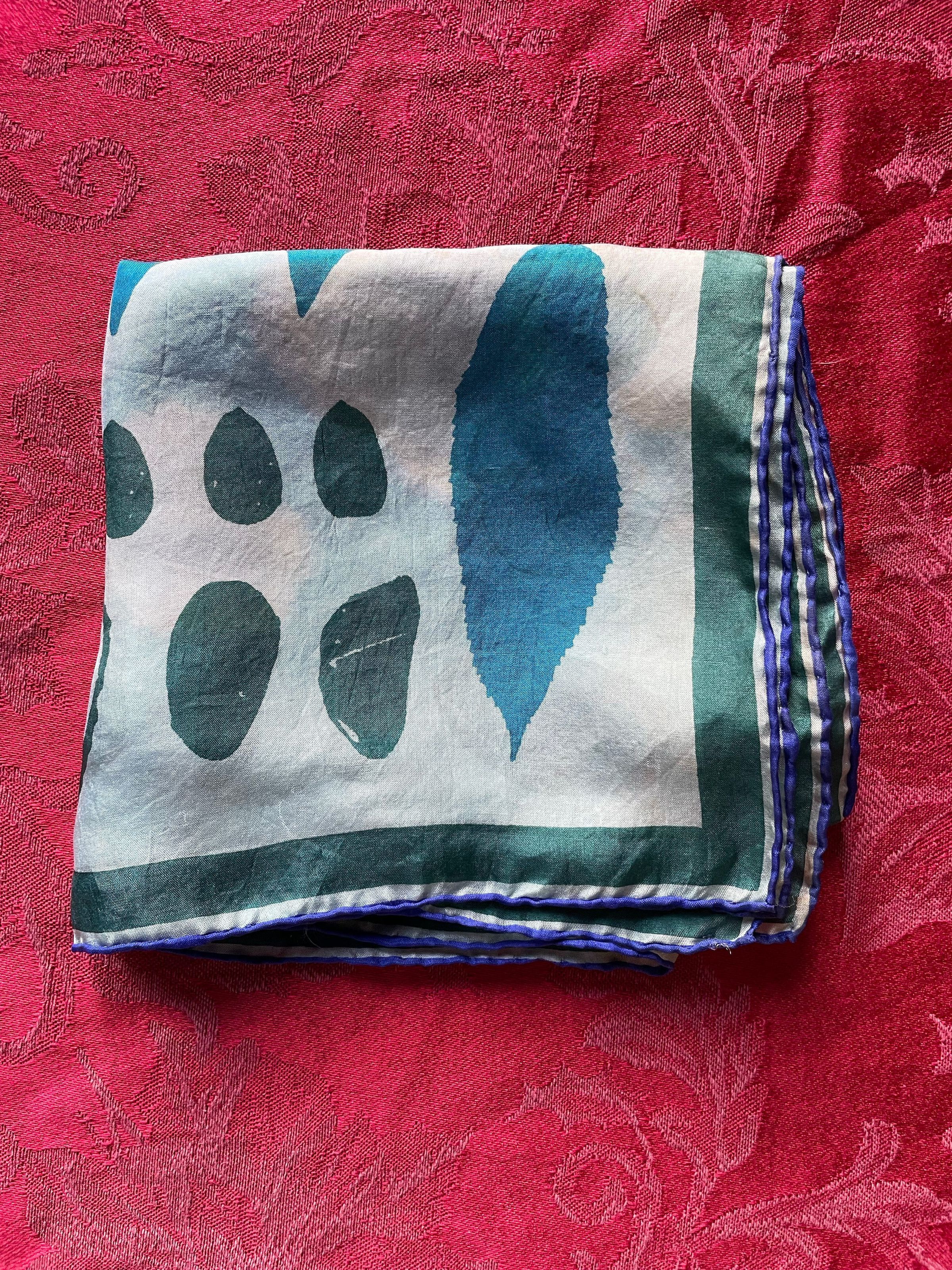 A multicolored patterned scarf in all cool colors with some floral and leaf designs.