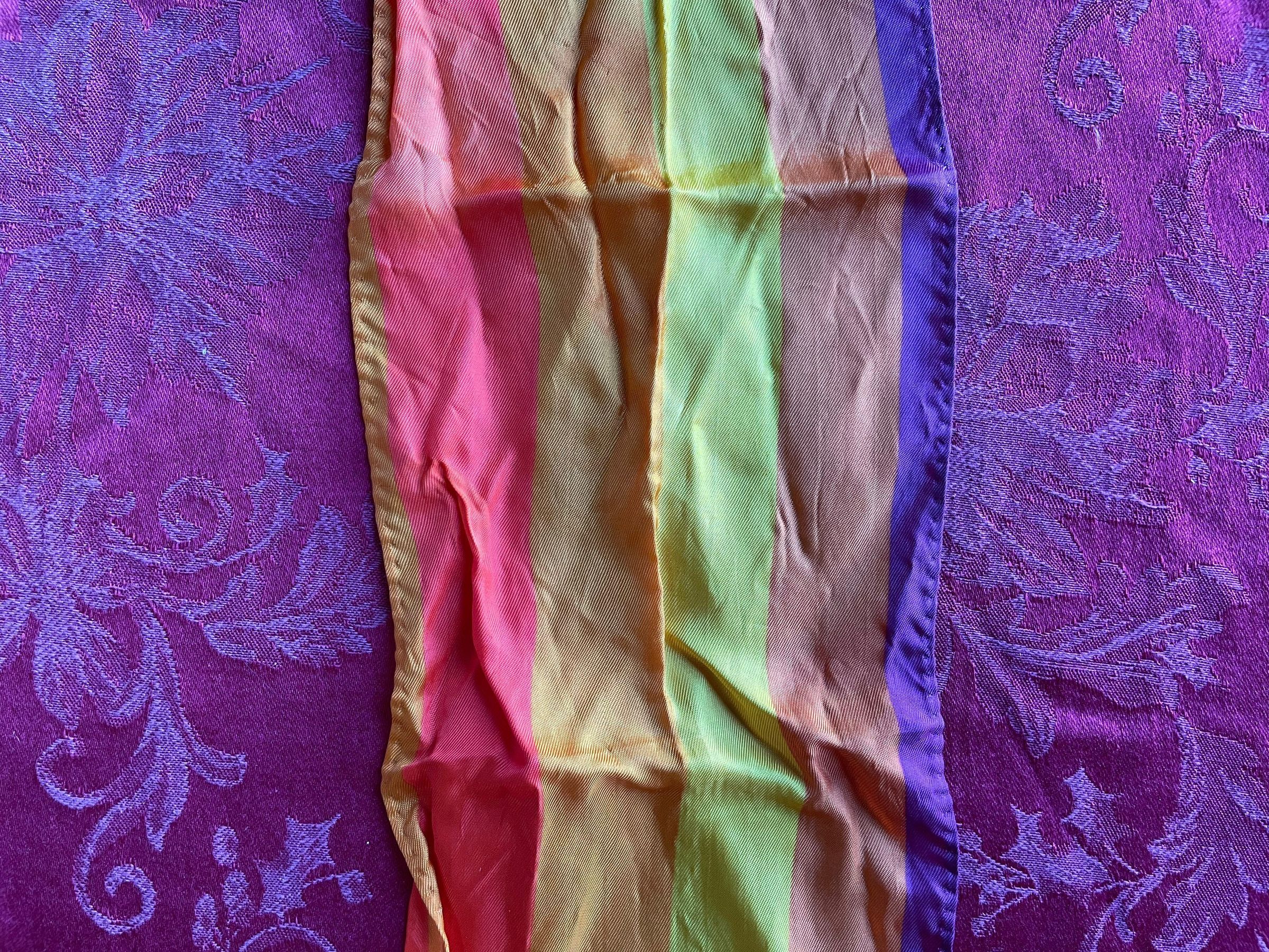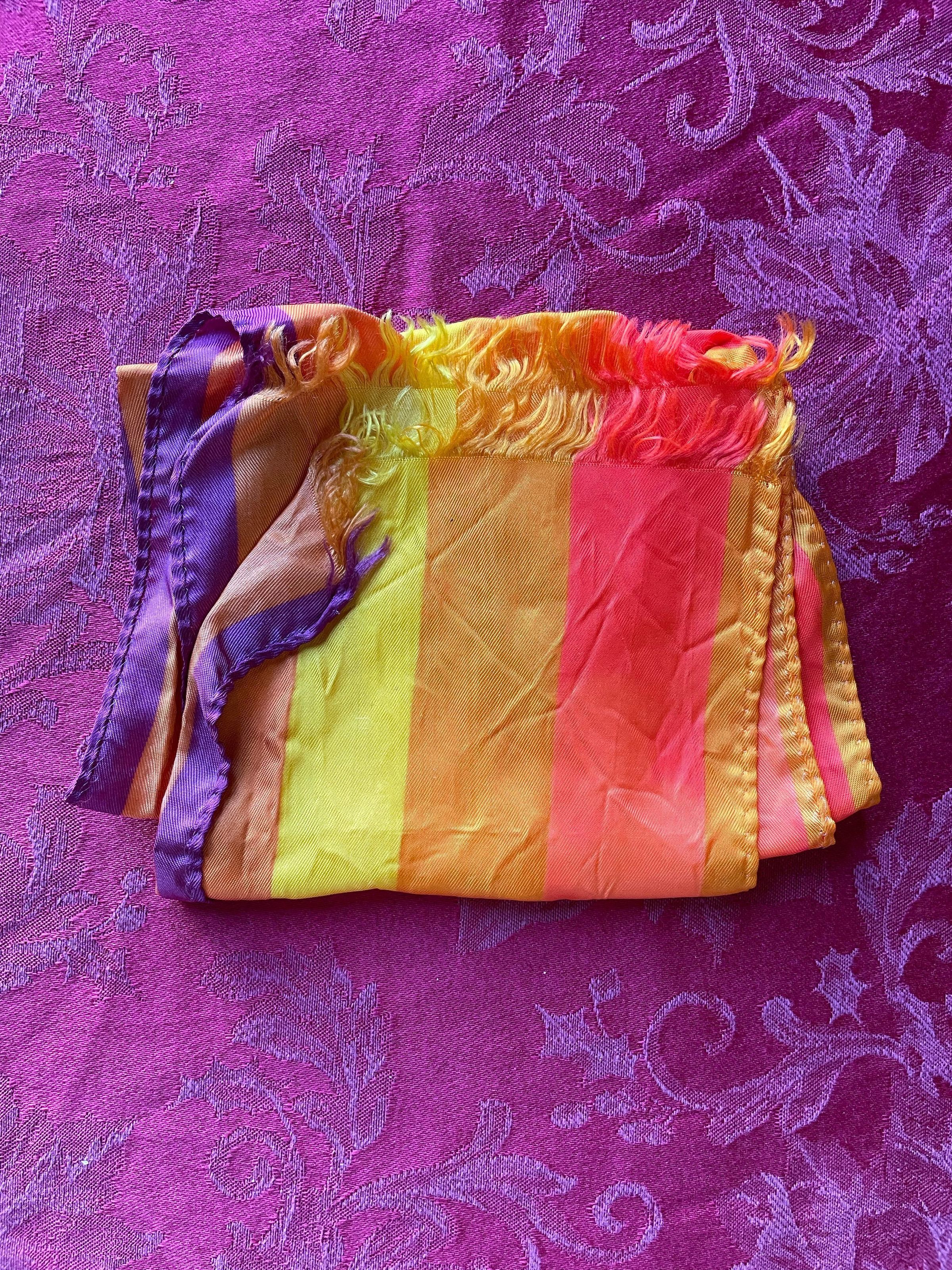 A rainbow-colored scarf with red, orange, yellow, and purple. It’s quite a bit longer in terms of general scarf design. It might’ve been looped around the neck a few times over.Color