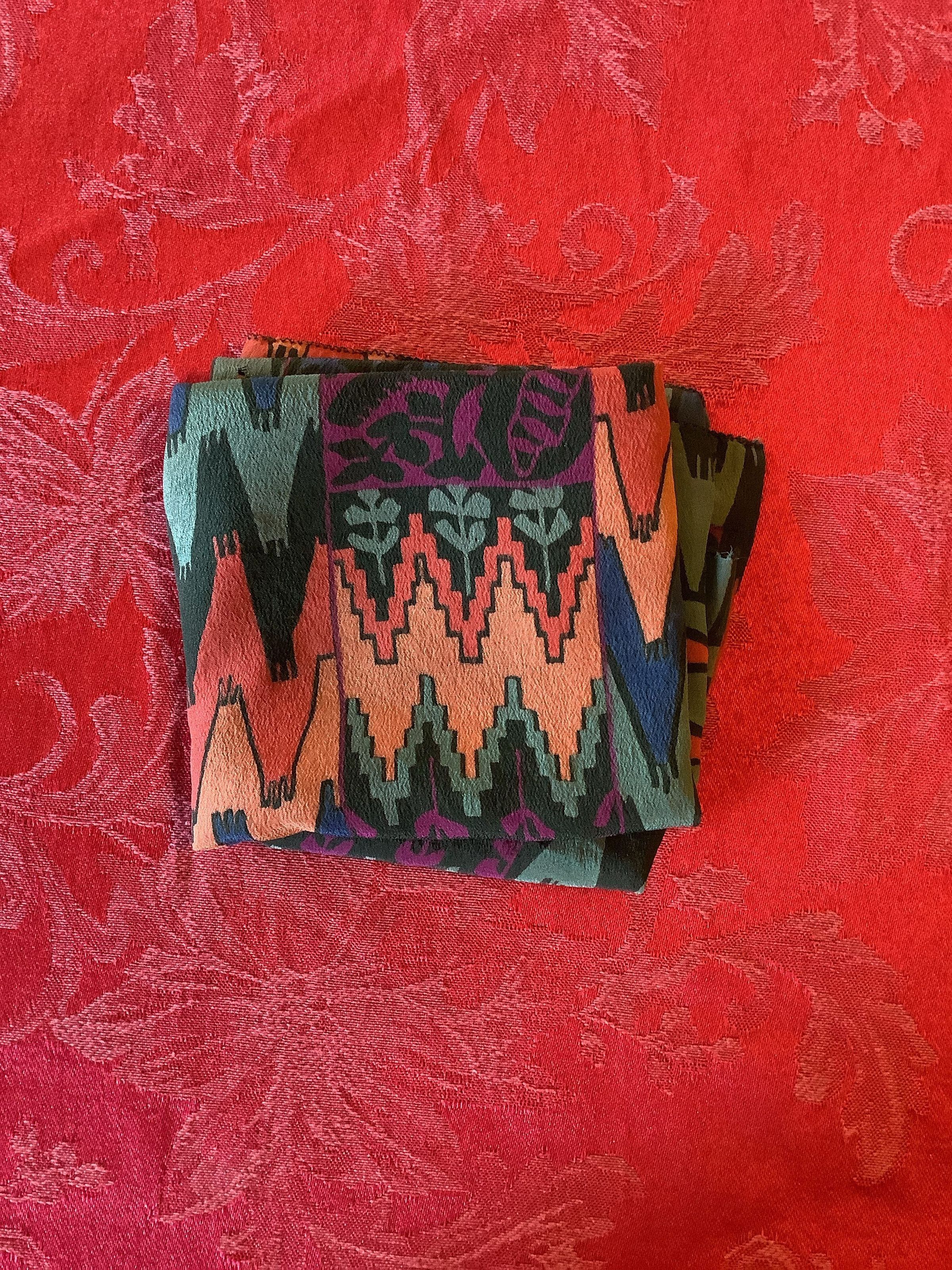 A multicolored patterned scarf that has depictions of plants and jagged, tiered structures that may be representing the old, indigenous edifices of various Central and South American cultures. The colors range from black to light blue, with orange, purple, red, and green also strewn throughout. The maker is unknown.Create Date