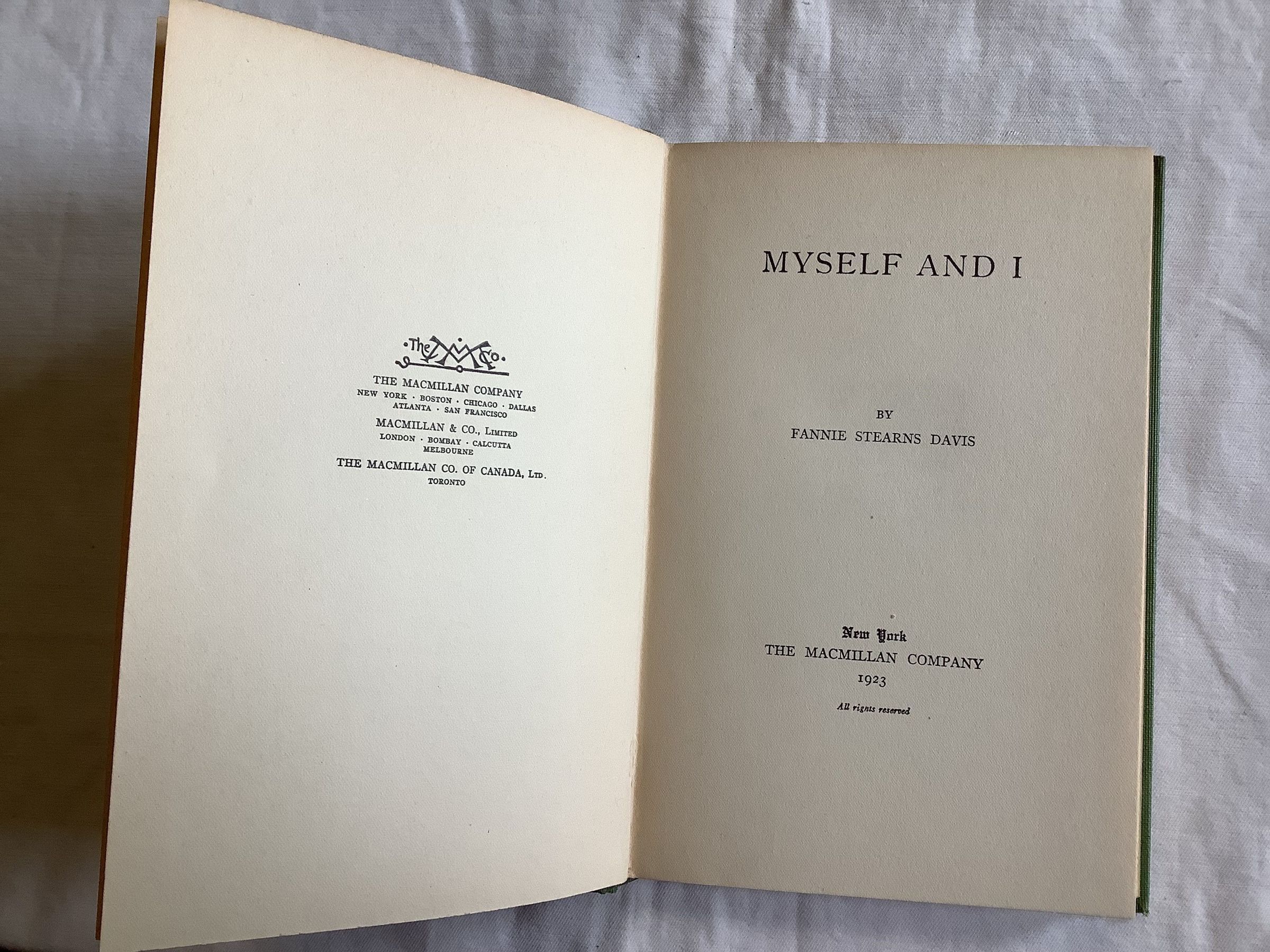 Myself And I is a collection of poems by Fannie Stearns Davis, originally published in 1913. The book features a range of poems exploring themes such as identity, self-discovery, and personal growth. Davis's writing is characterized by its introspective and contemplative nature, with many of the poems focusing on the speaker's inner thoughts and feelings. The language is often lyrical and evocative, with vivid imagery and metaphors used to convey complex emotions and experiences. Some of the poems in Myself And I also touch on broader societal issues, such as the role of women in society and the nature of human relationships. Overall, the book is a thought-provoking and insightful exploration of the human experience, as seen through the lens of one woman's personal journey. --AmazonInscription/Signature/Marks