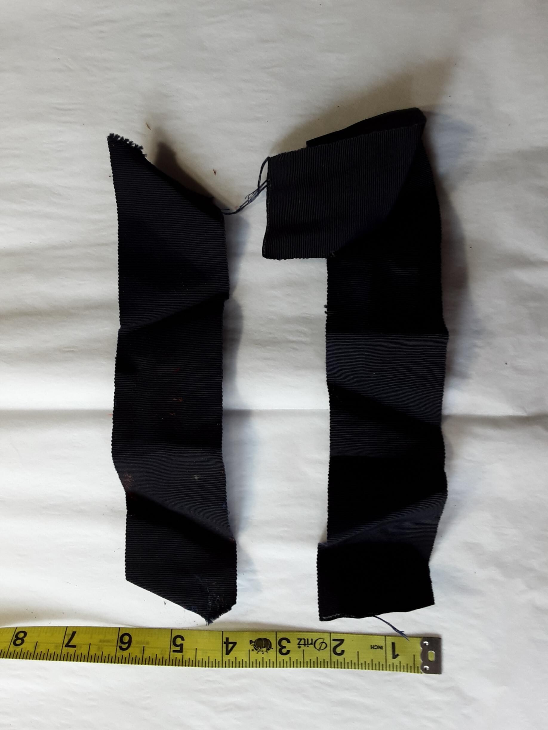 Navy blue gros grain ribbon pieces, probably used for trimming on a hat or article of clothing.