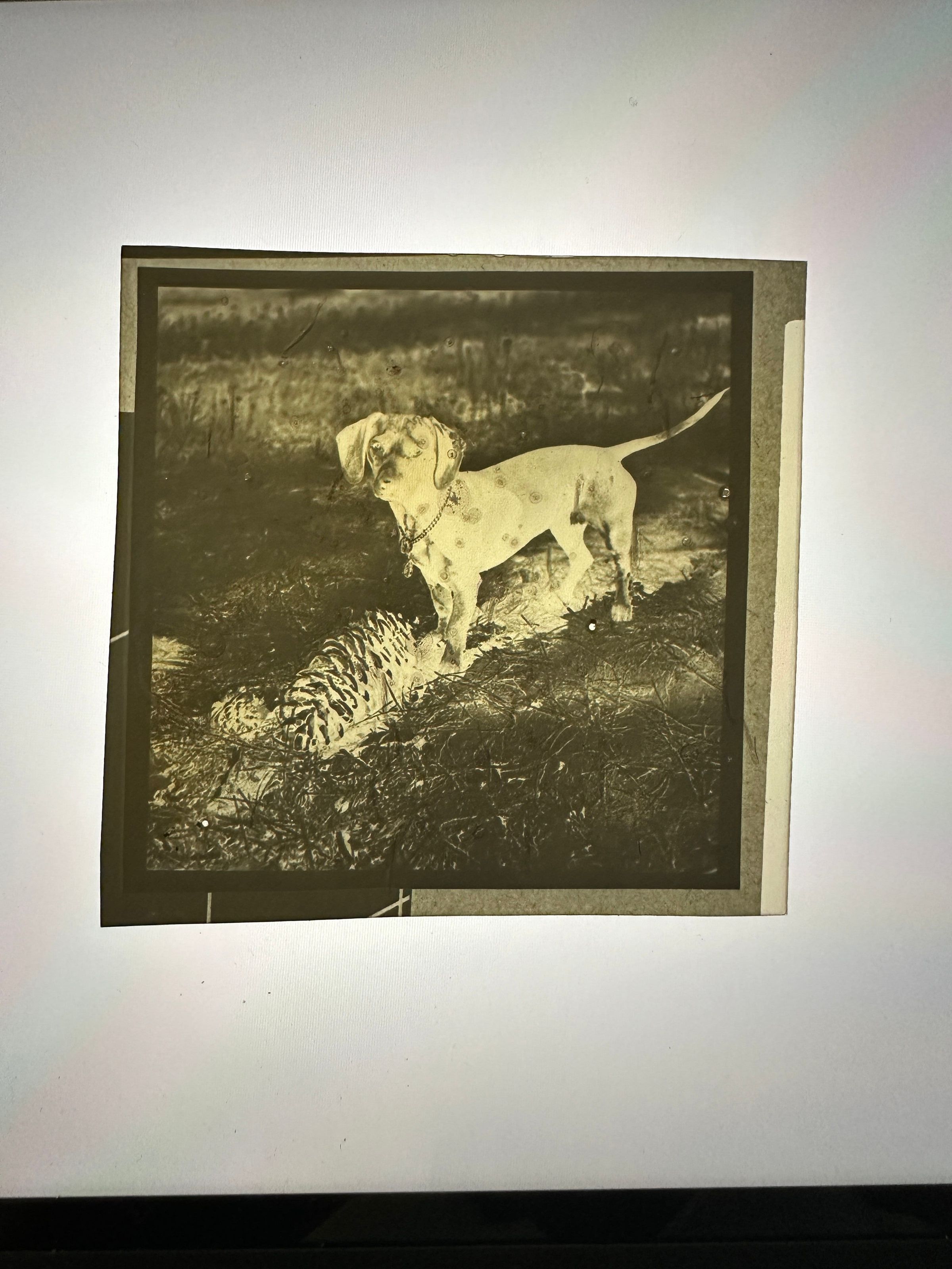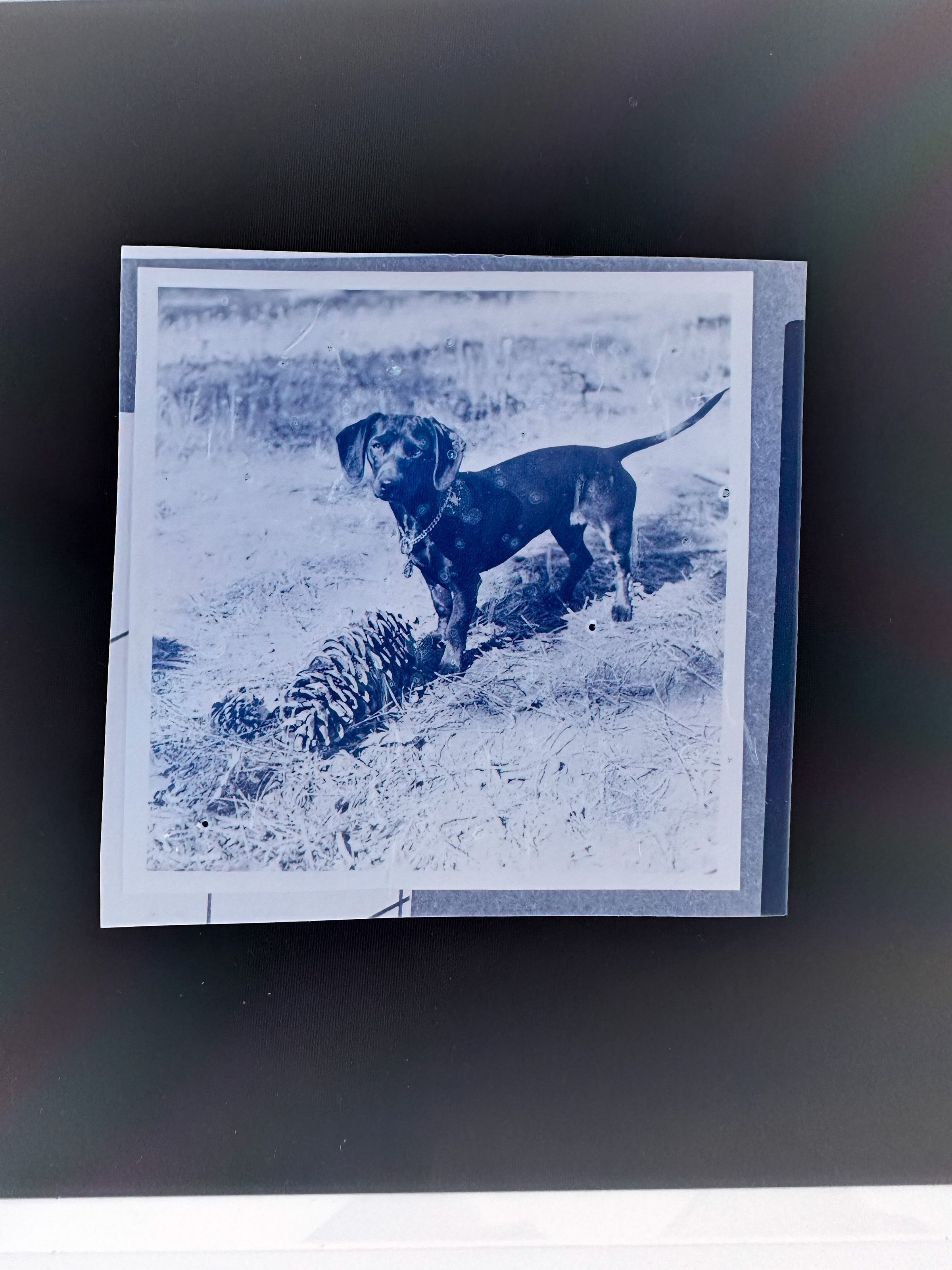 Negative of a dachshund breed dog outside. There is a large pine cone in front of the dog an a small one next to the big one. Te dog has a metal collar with tags. It is looking directly at the camera.Collection