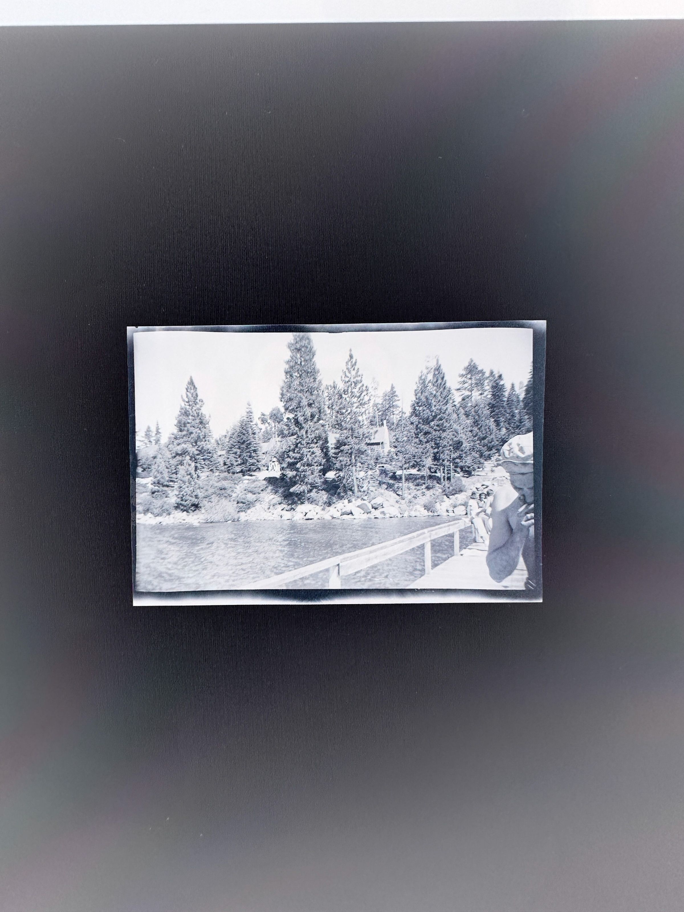 The negative depicts a man, positioned at the far right of the picture, smoking a cigarette. He has a hat, no shirt, and swim trunks. He is on a bridge, or landing of some sort, near a lake surrounded by trees and a house at the far back.Collection