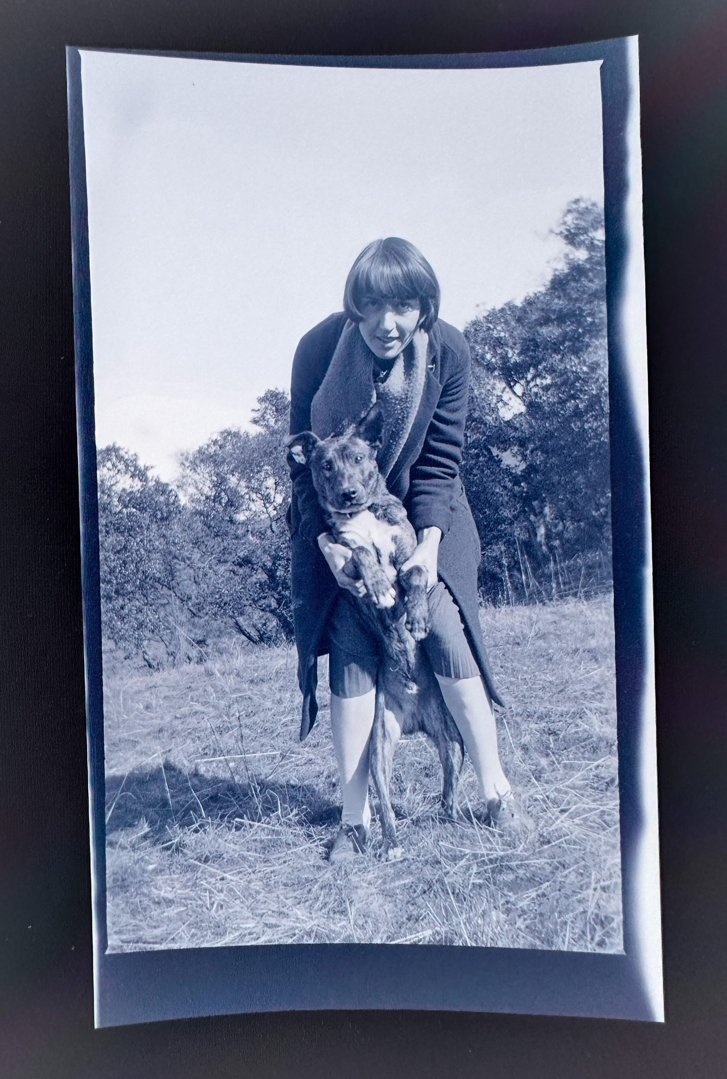 A negative of Emma Cohen Bray holding a dog upright. They are in what looks like to be a field or a patch of open grass. Both Emma and the dog are looking directly at the camera.Collection