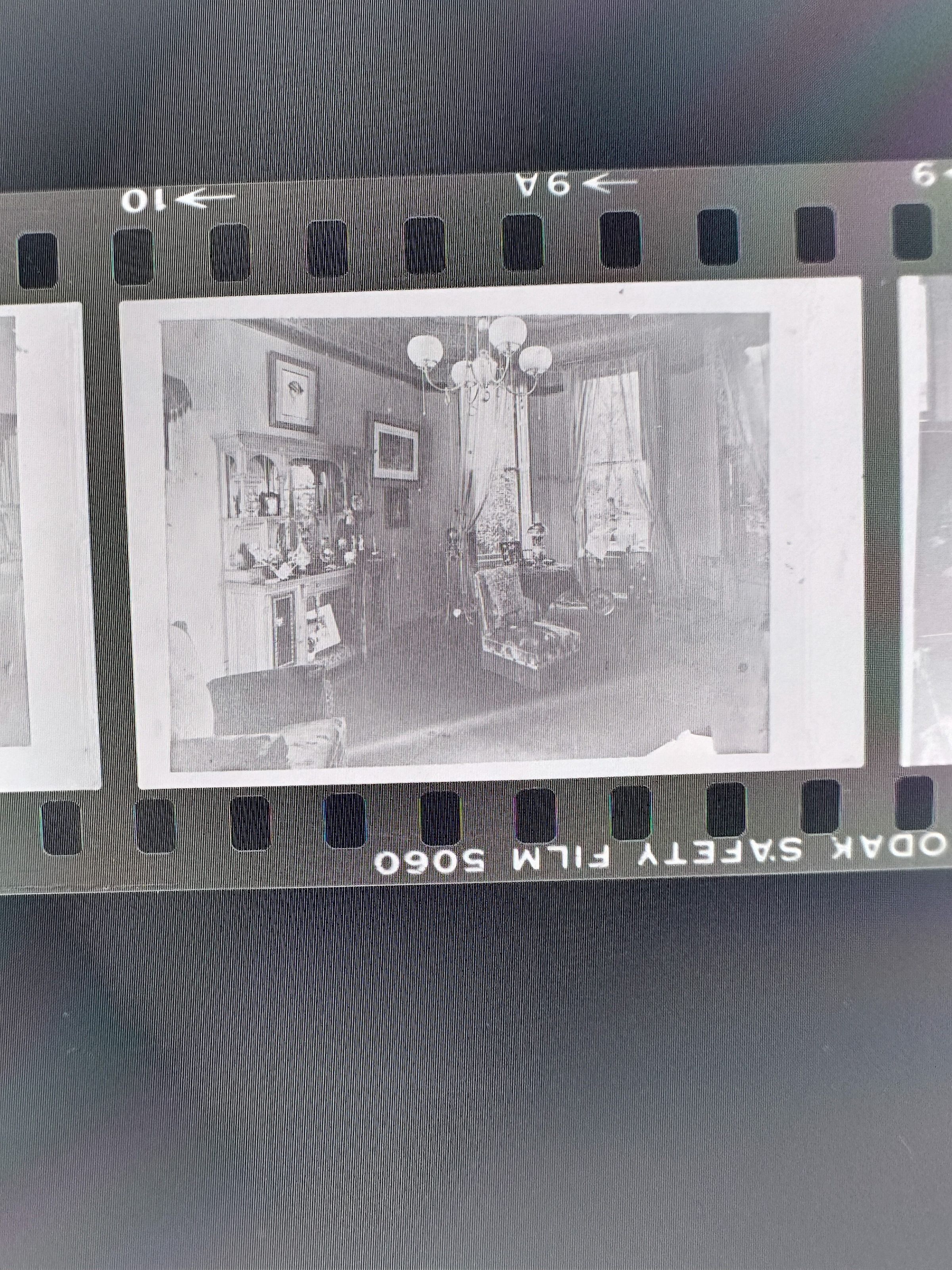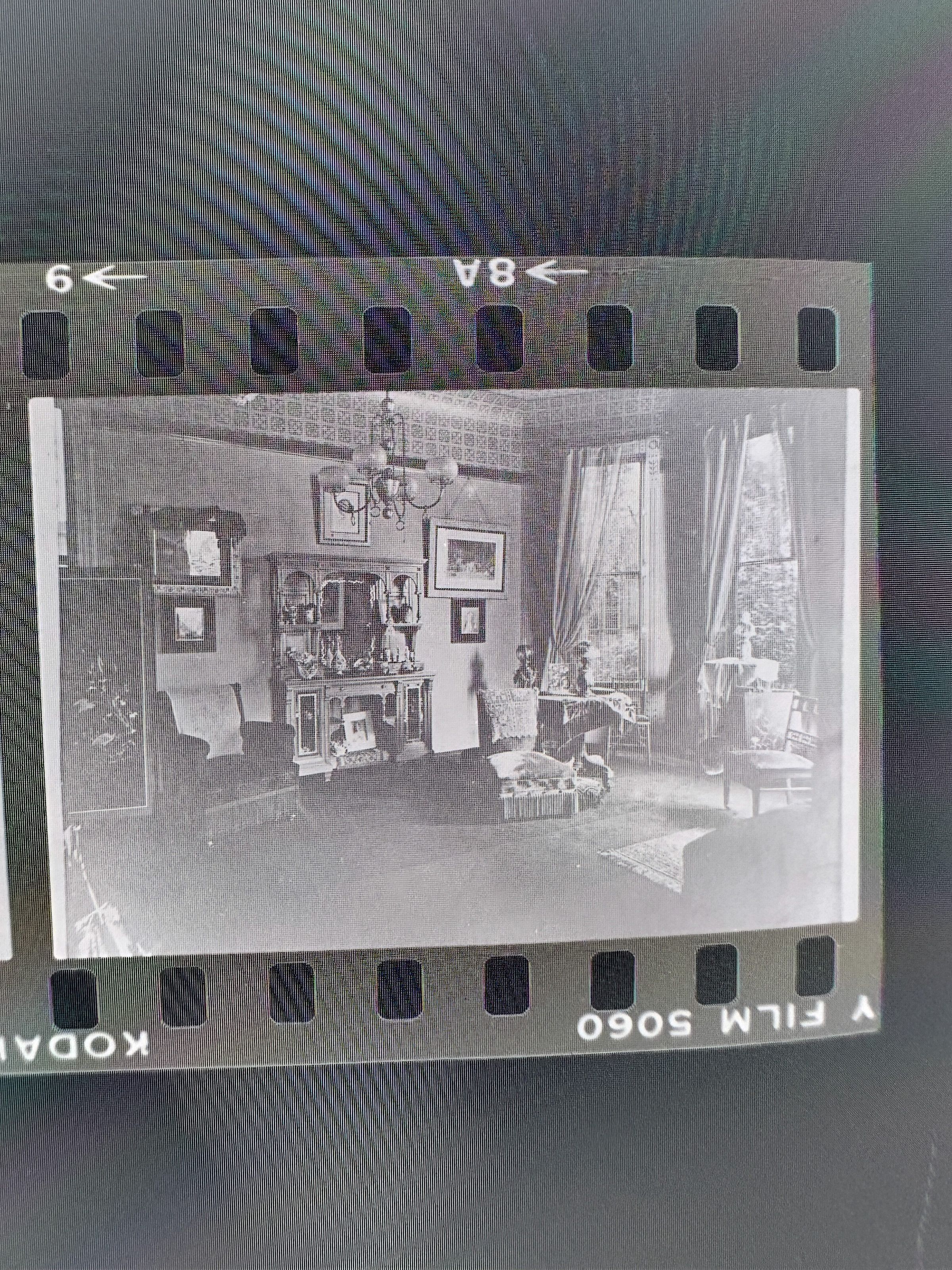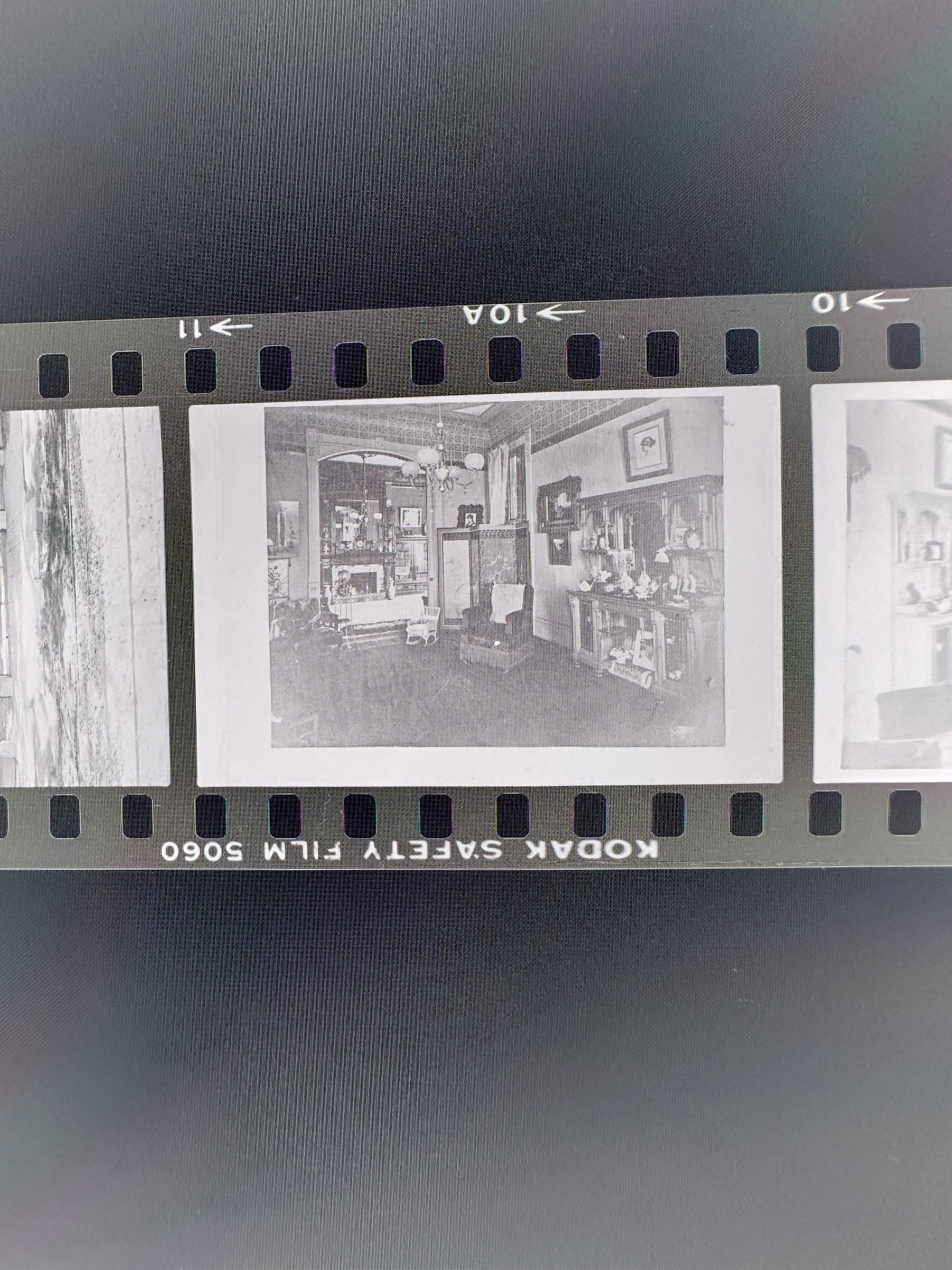 A photo negative strip with 5 pictures. Two pictures are of the outside of Fernside. One depicts the entrance/gate, while the other is of the outside view of the house. The other three pictures are of the inside of Cohen Bray House. Both are of the parlor room from different angles.Collection