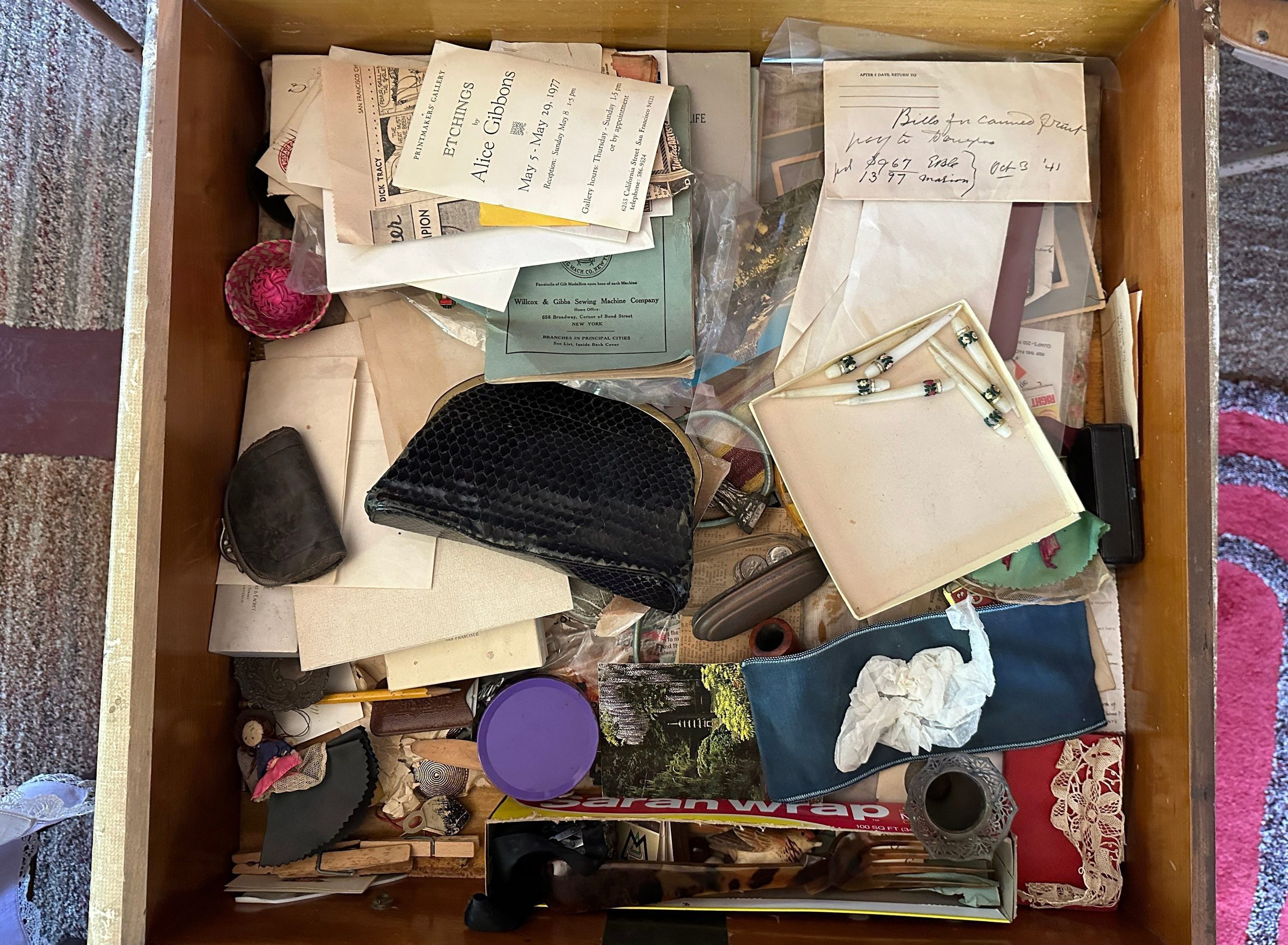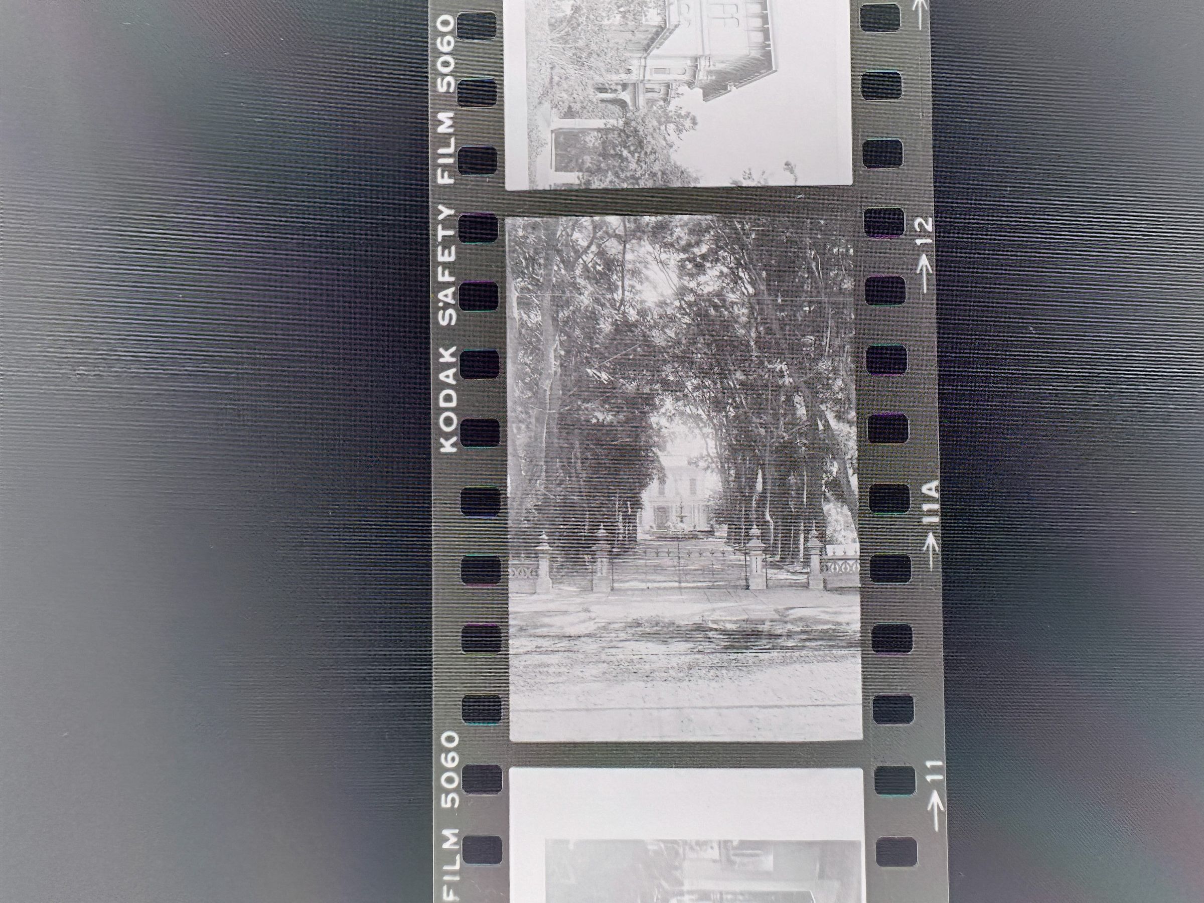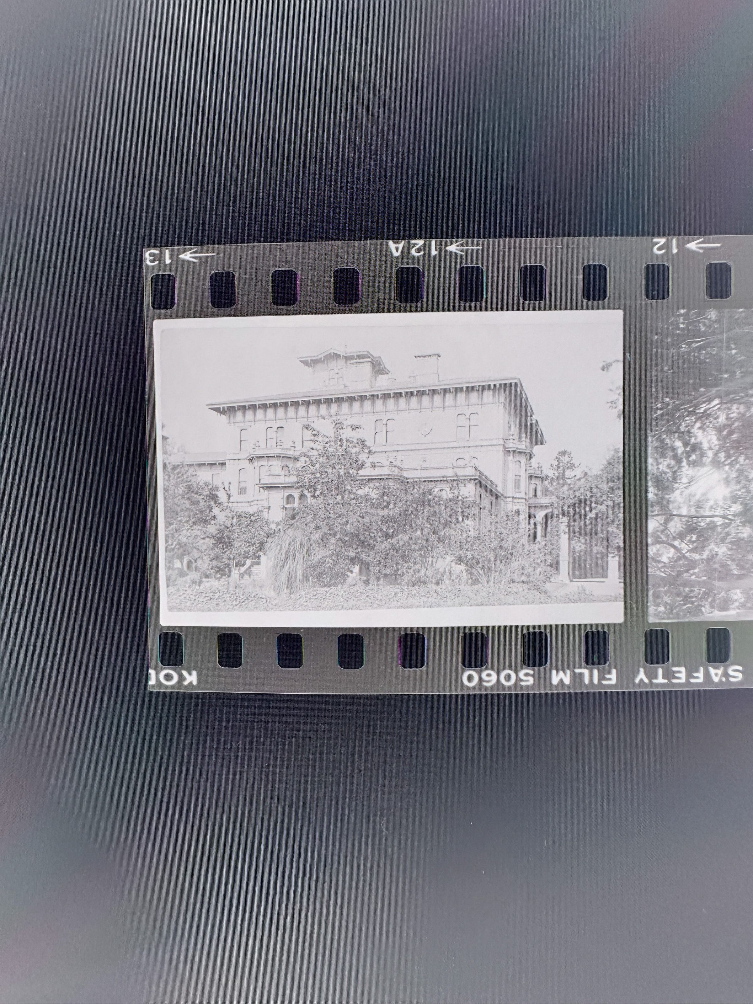 A photo negative strip with 5 pictures. Two pictures are of the outside of Fernside. One depicts the entrance/gate, while the other is of the outside view of the house. The other three pictures are of the inside of Cohen Bray House. Both are of the parlor room from different angles.Collection