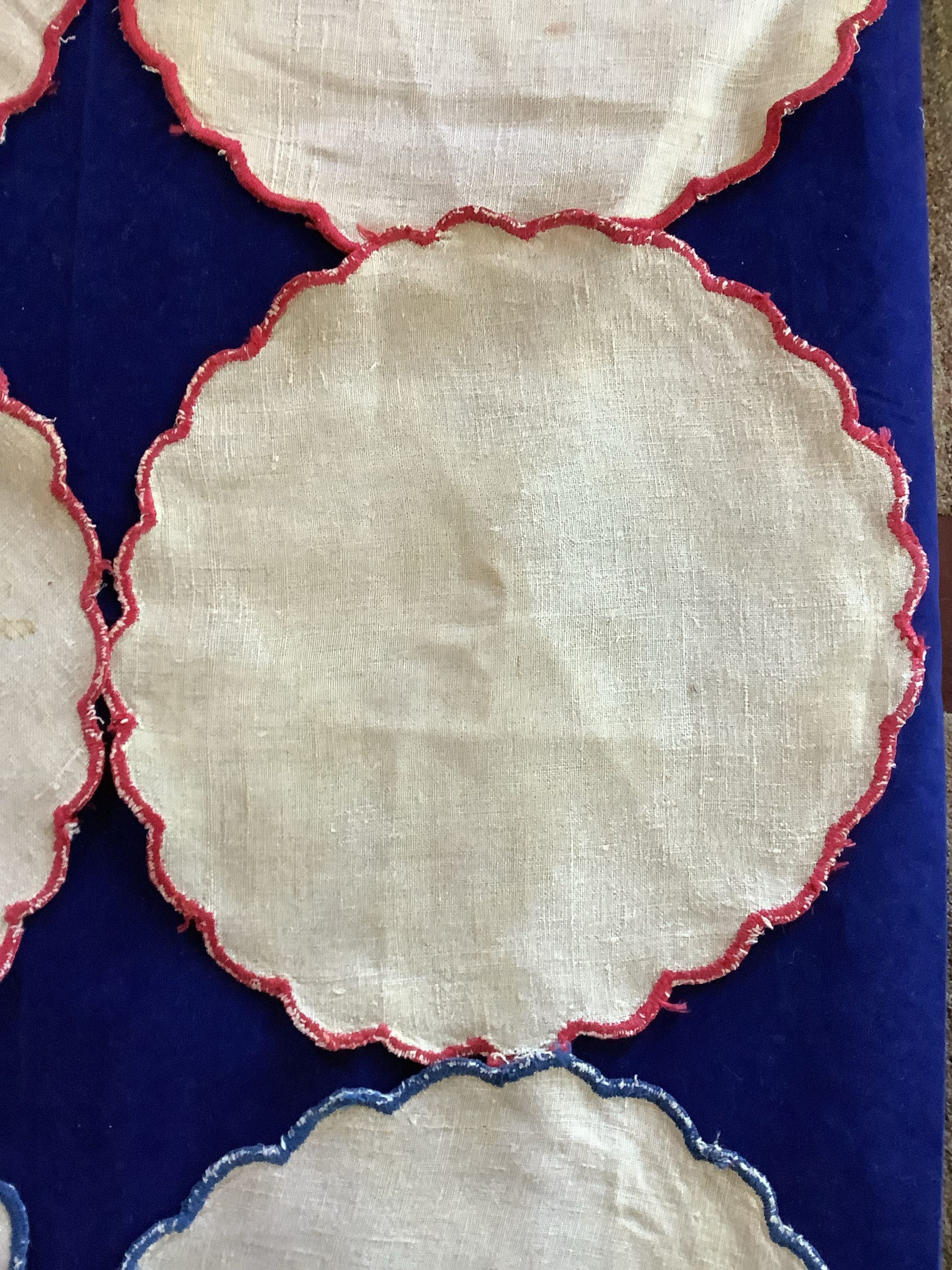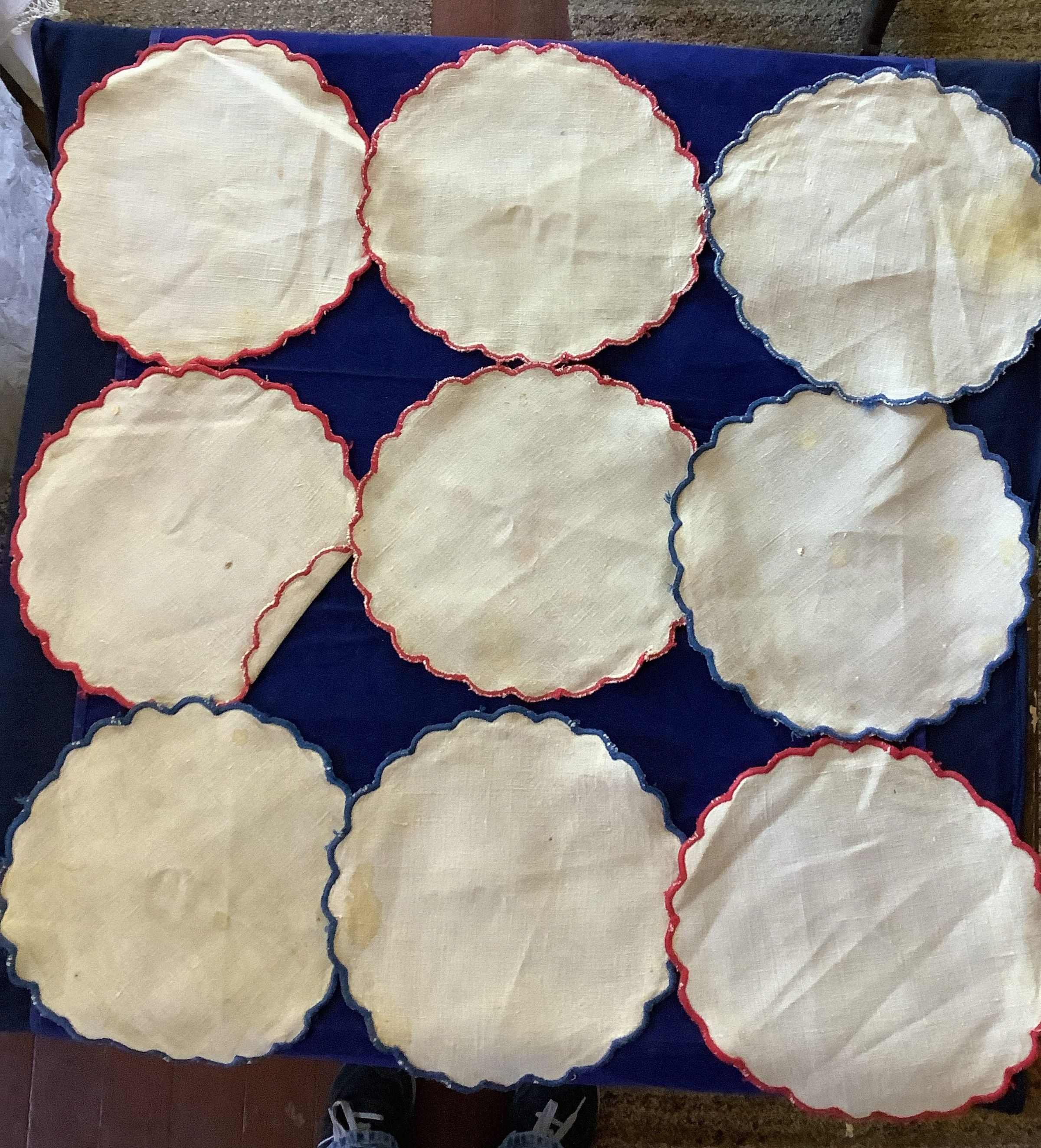 These are nine scallop edged rounds, four with a blue edge and five red edged.