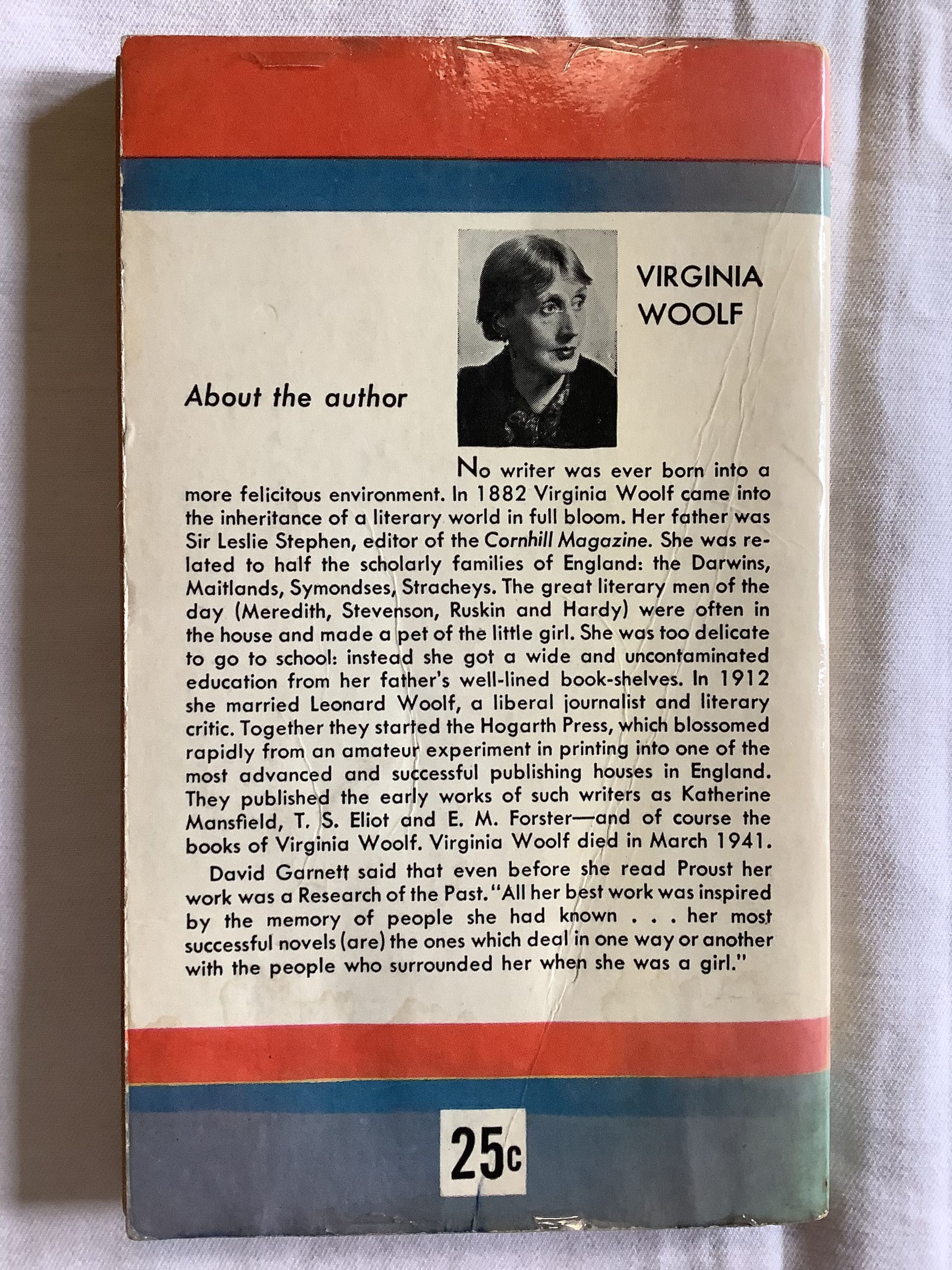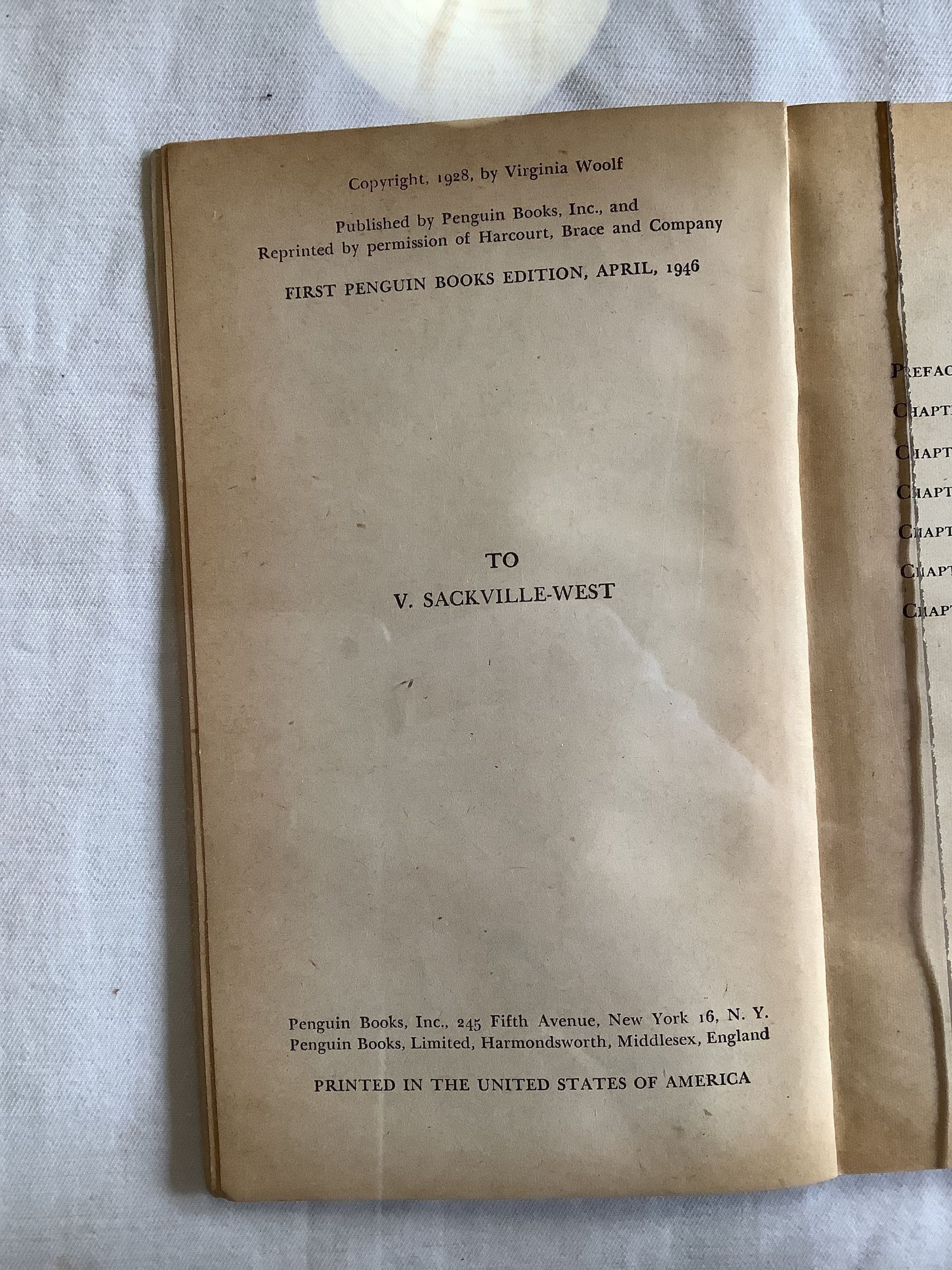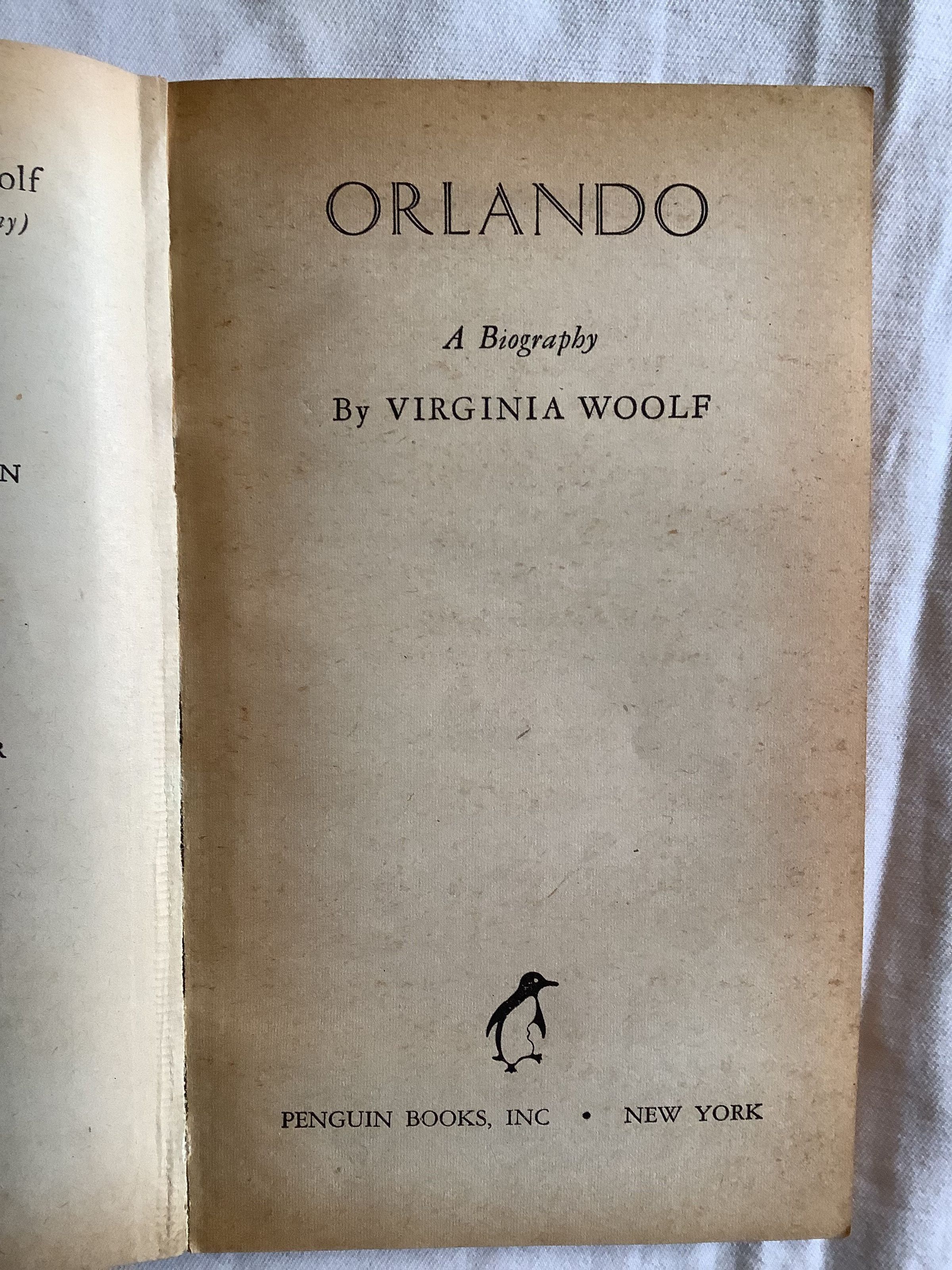 Inspired by the tumultuous family history of the aristocratic poet and novelist Vita Sackville-West, Woolf's lover and close friend, it is arguably one of her most popular novels; Orlando is a history of English literature in satiric form. The book describes the adventures of a poet who changes sex from man to woman and lives for centuries, meeting the key figures of English literary history. Considered a feminist classic, the book has been written about extensively by scholars of women's writing and gender and transgender studies. --WikipediaInscription/Signature/Marks