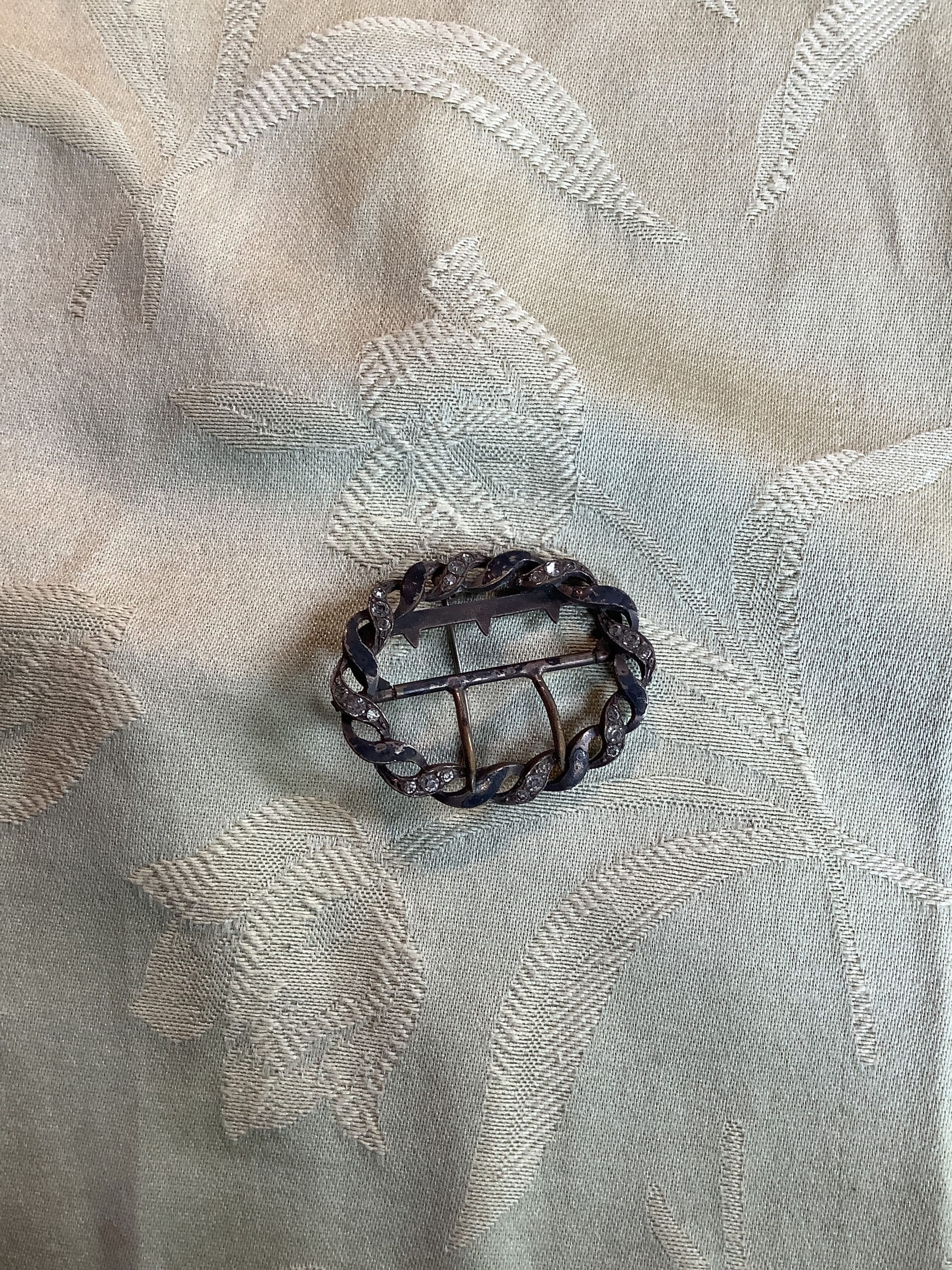 A late Victoria style buckle brooch in an oval shape. The oval is made up of a silver toned metal with Diamond like circular stones set inside.Collection