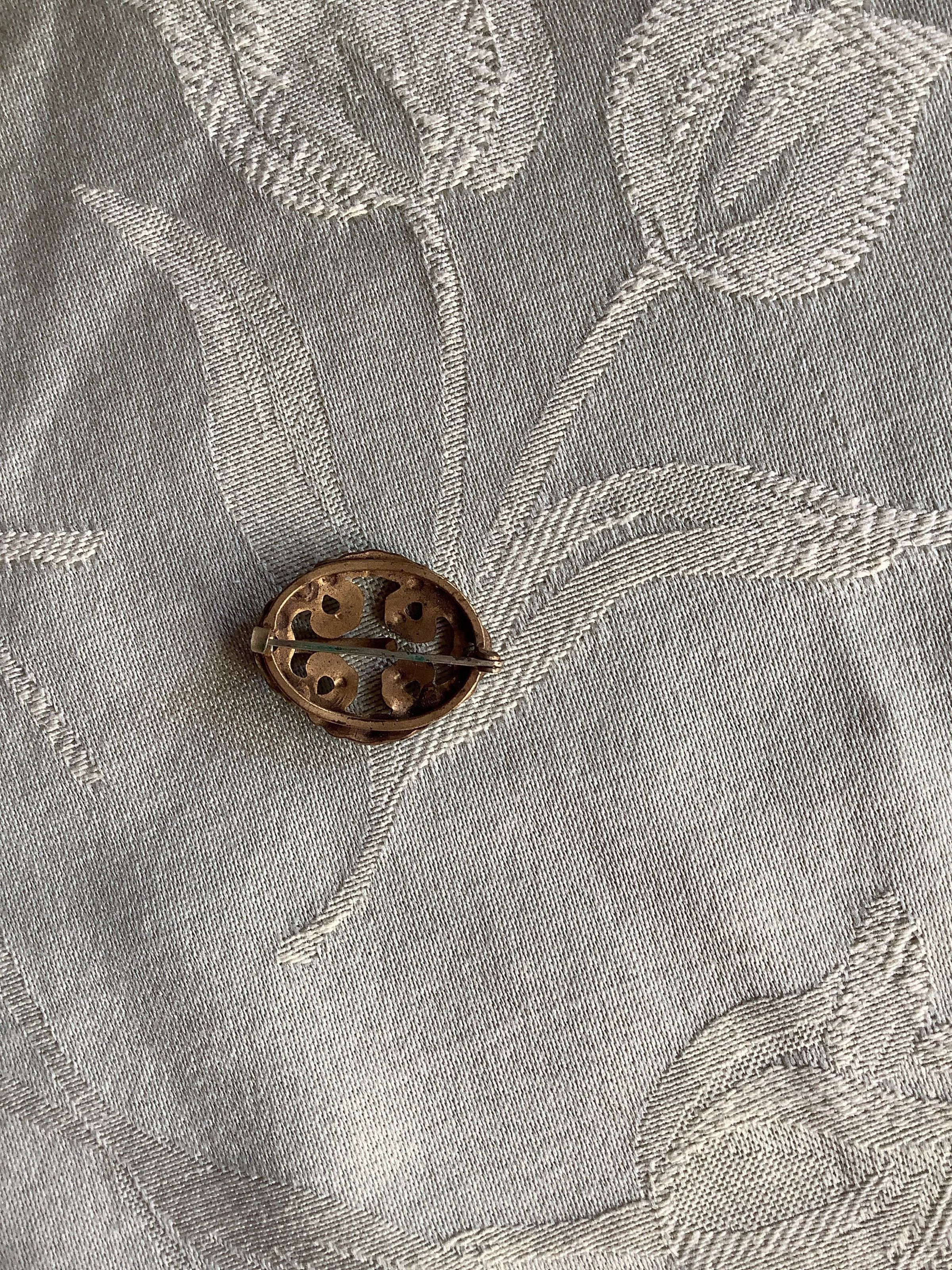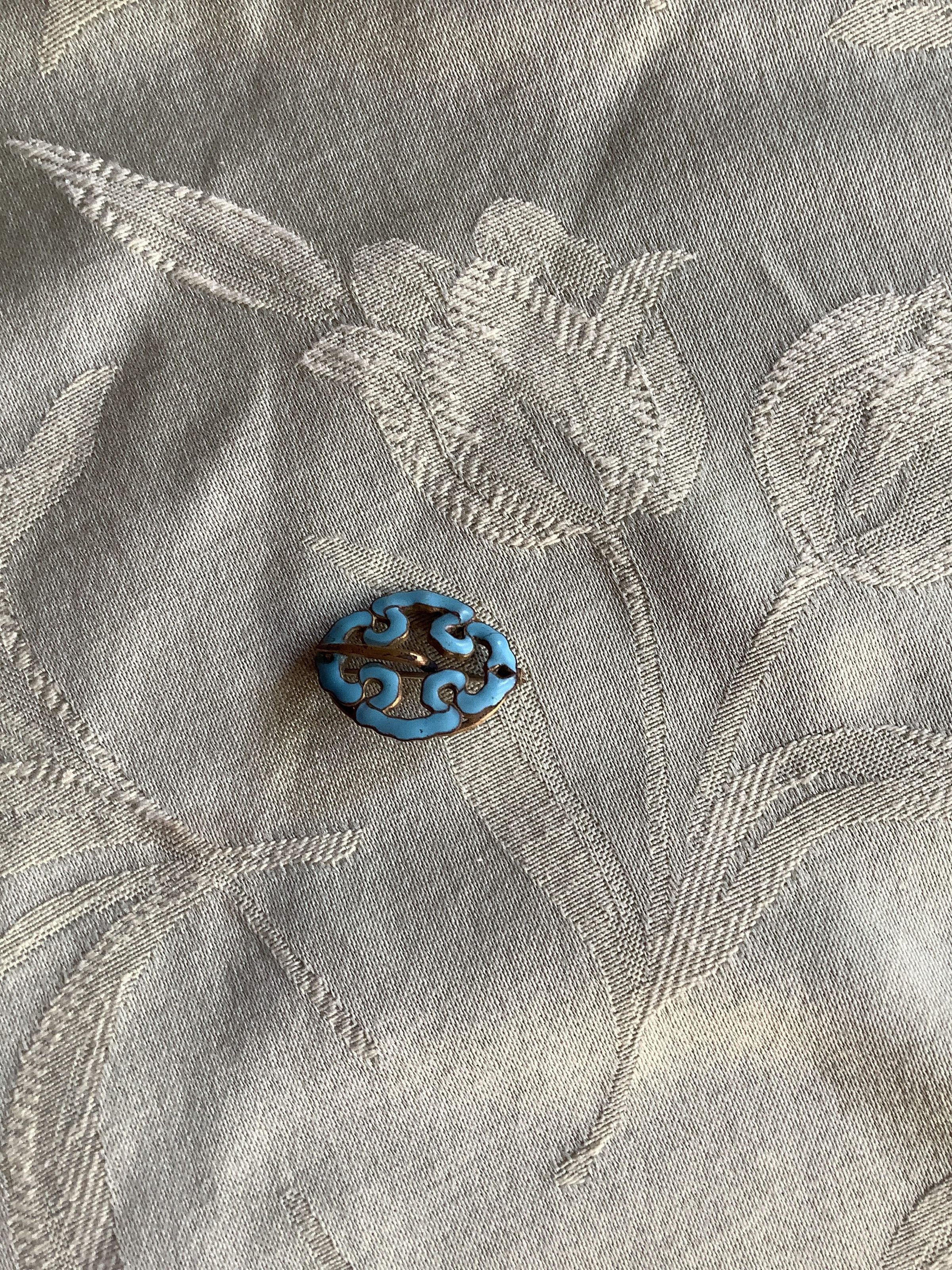 Oval shaped brooch made of tarnished gold colored metal with blue painted on top configured into swirls making the oval shape. Pin on the back. (?)Collection
