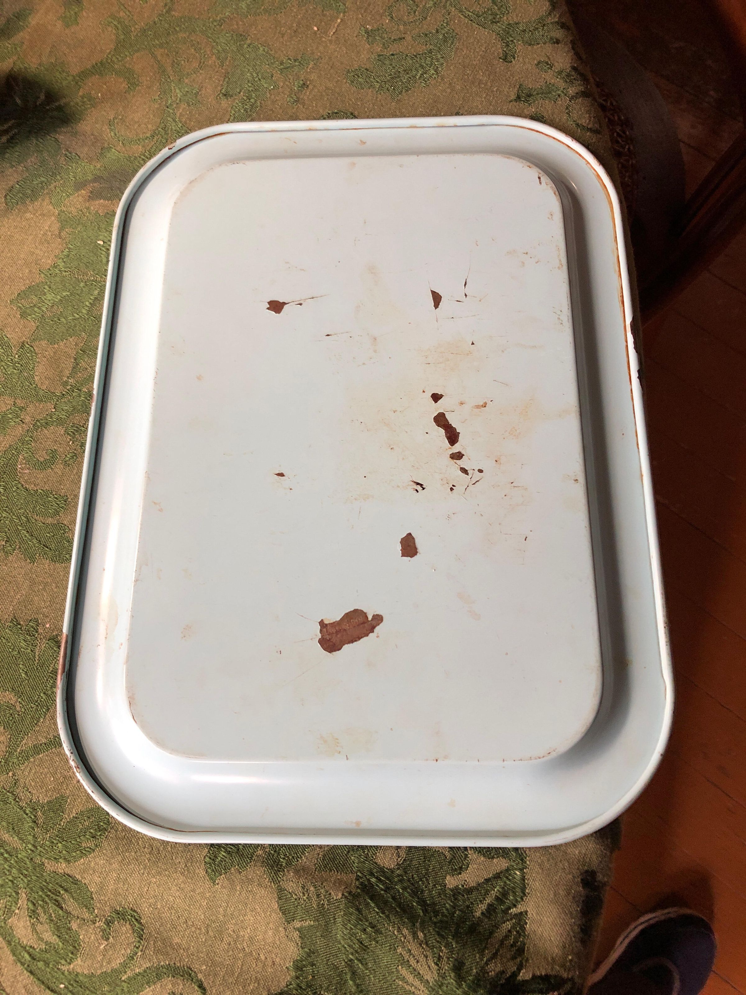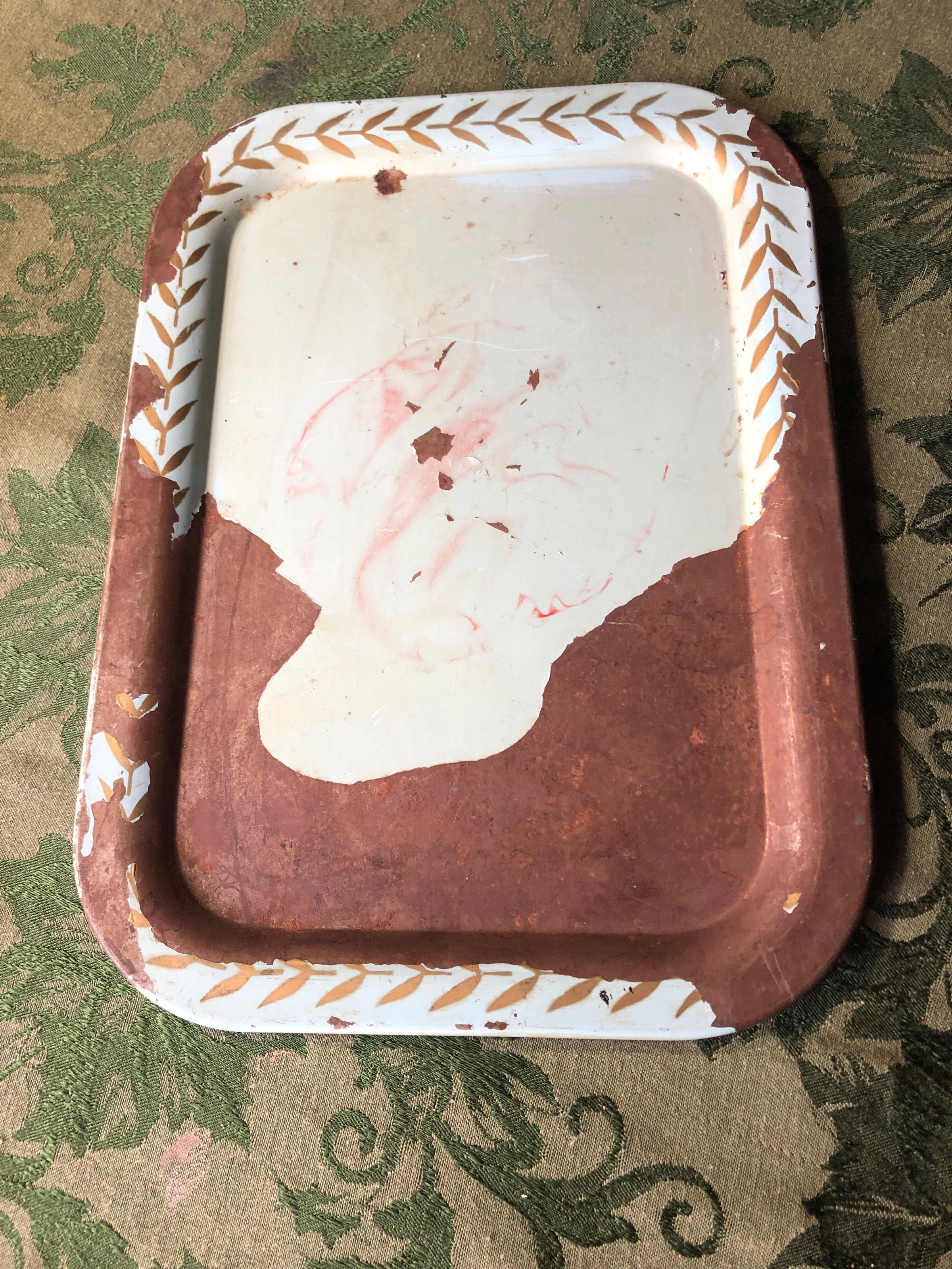 Rounded edge rectangular serving tray. White background with auburn repeating simple leaf pattern along outer edges.