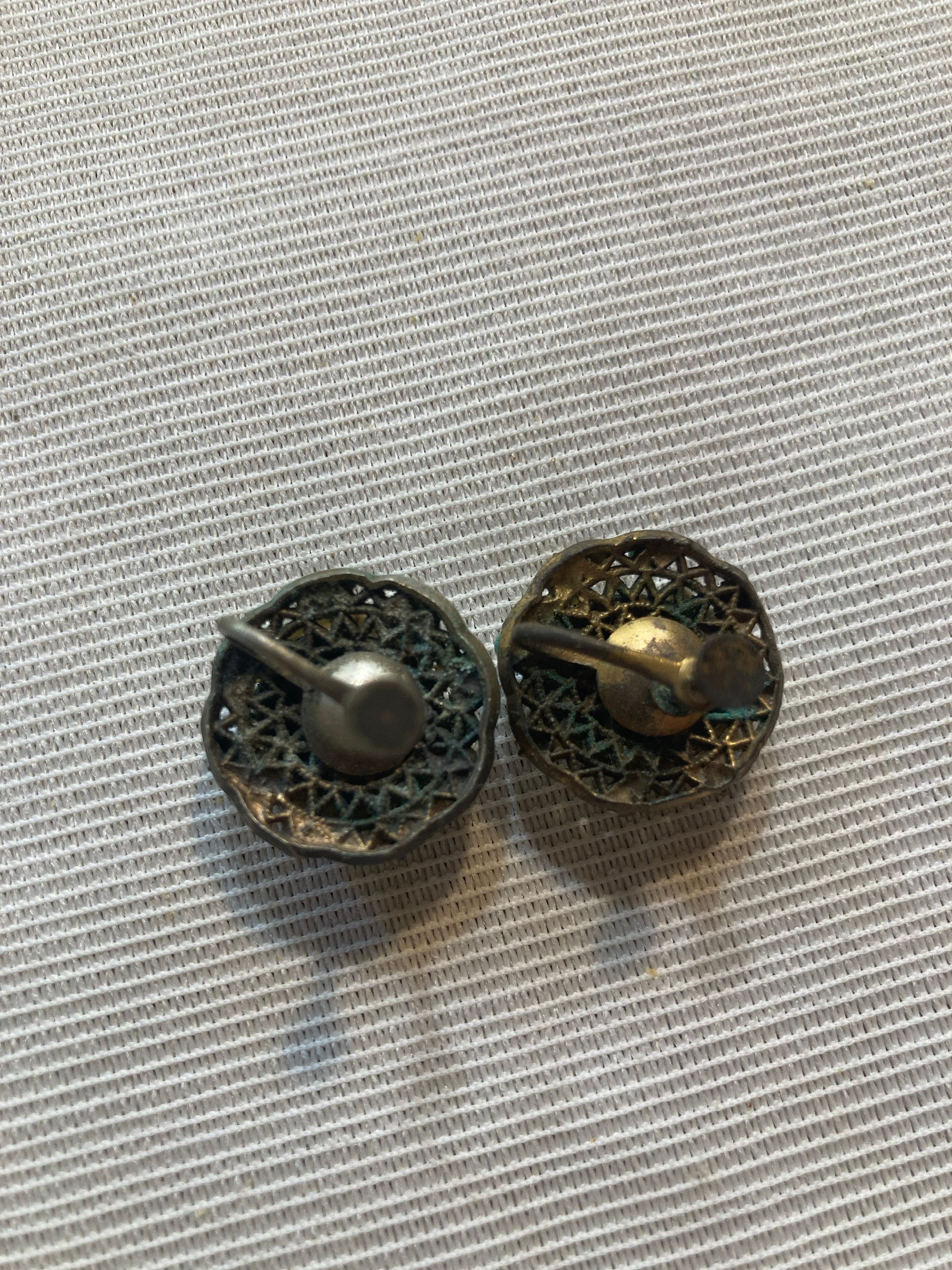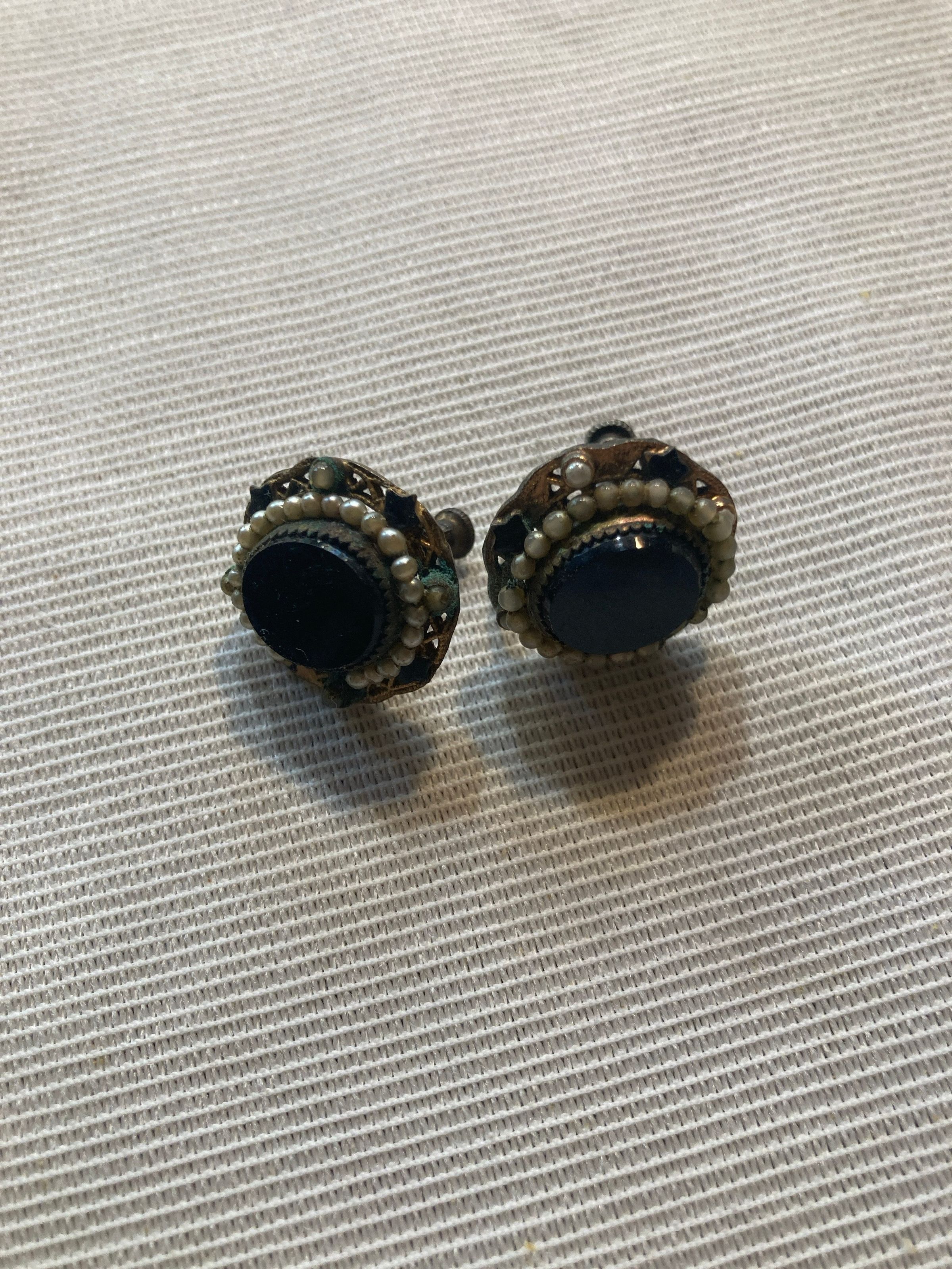 Pair of clip on earrings with screw back. Circular shaped, with central oval shaped black glass with small pearls set around the edge, set into a gold colored metal. Metal has some discoloration.Collection