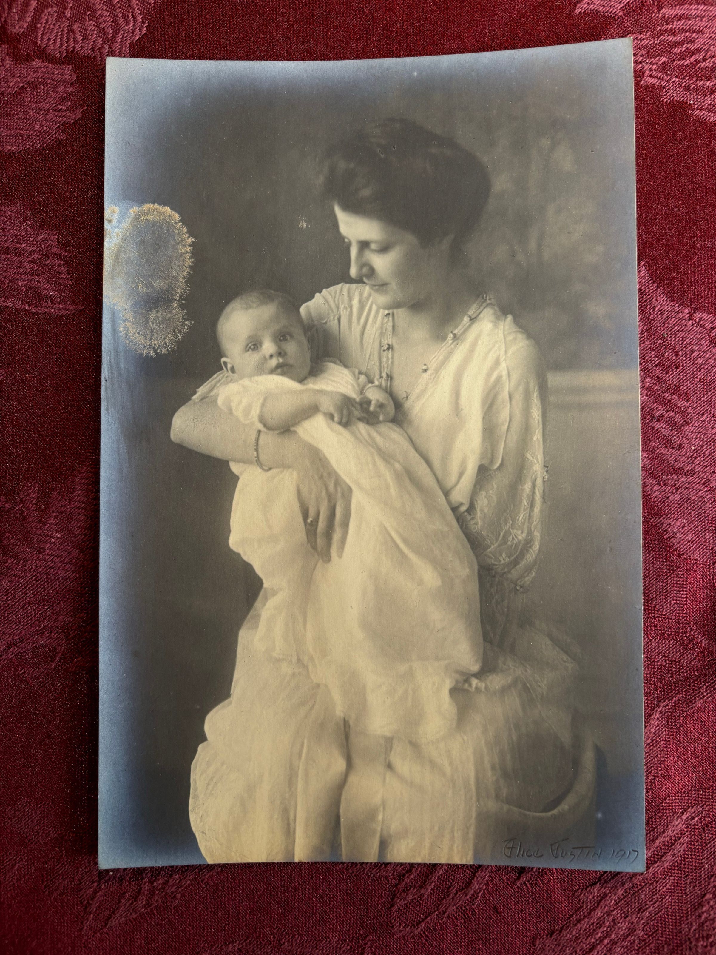 A photograph of a mother and child. The inscription reads, "Alice Justin 1917." It is unknown whether that is the name of the subject or the photographer. It is possible the subject is A. H. Cohen's sister.Inscription/Signature/Marks