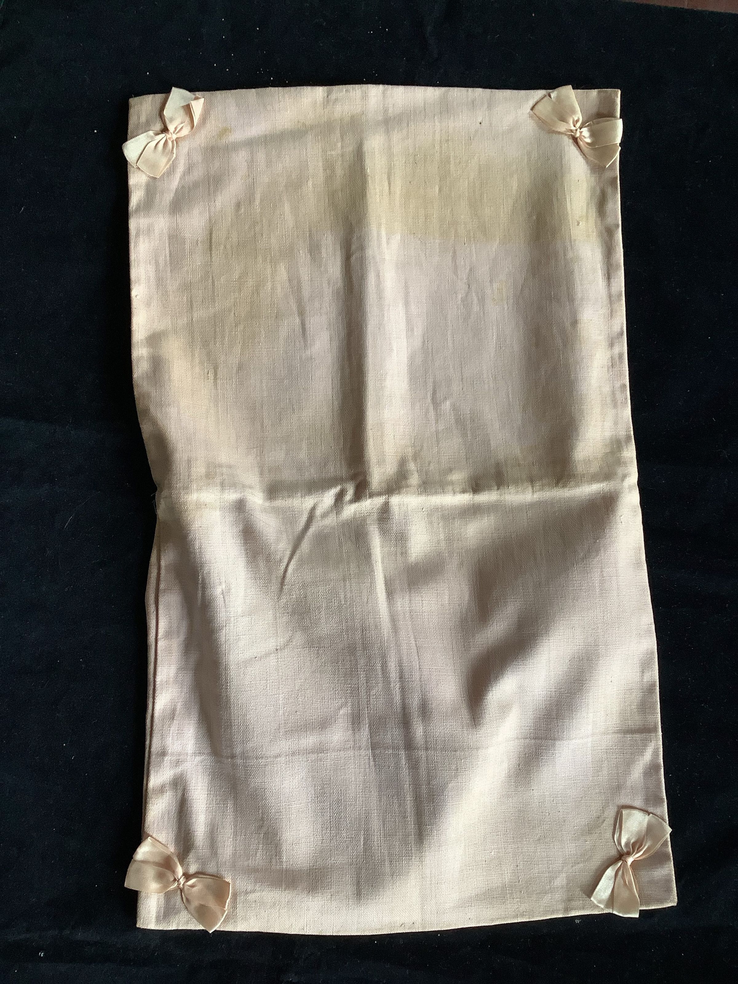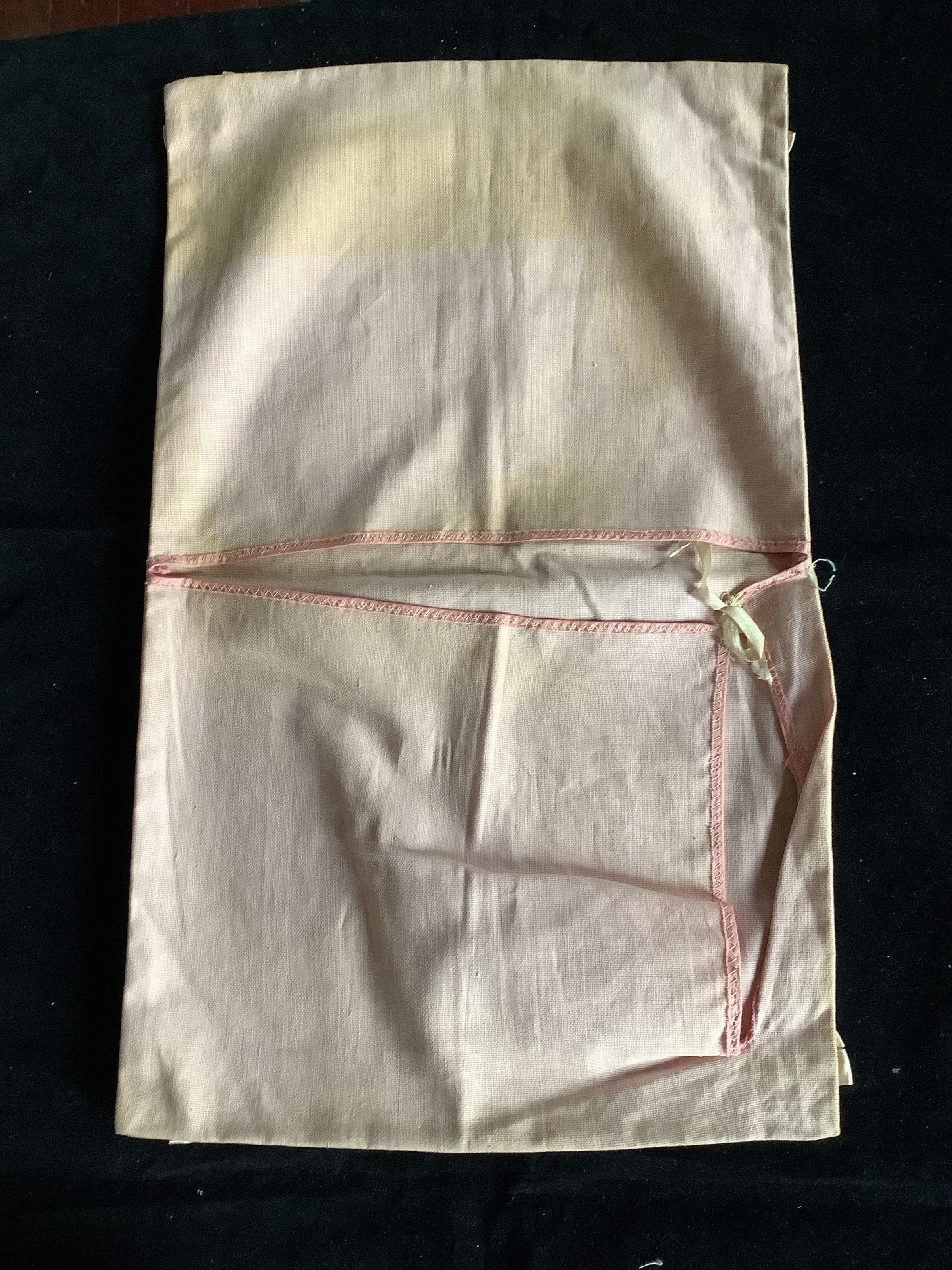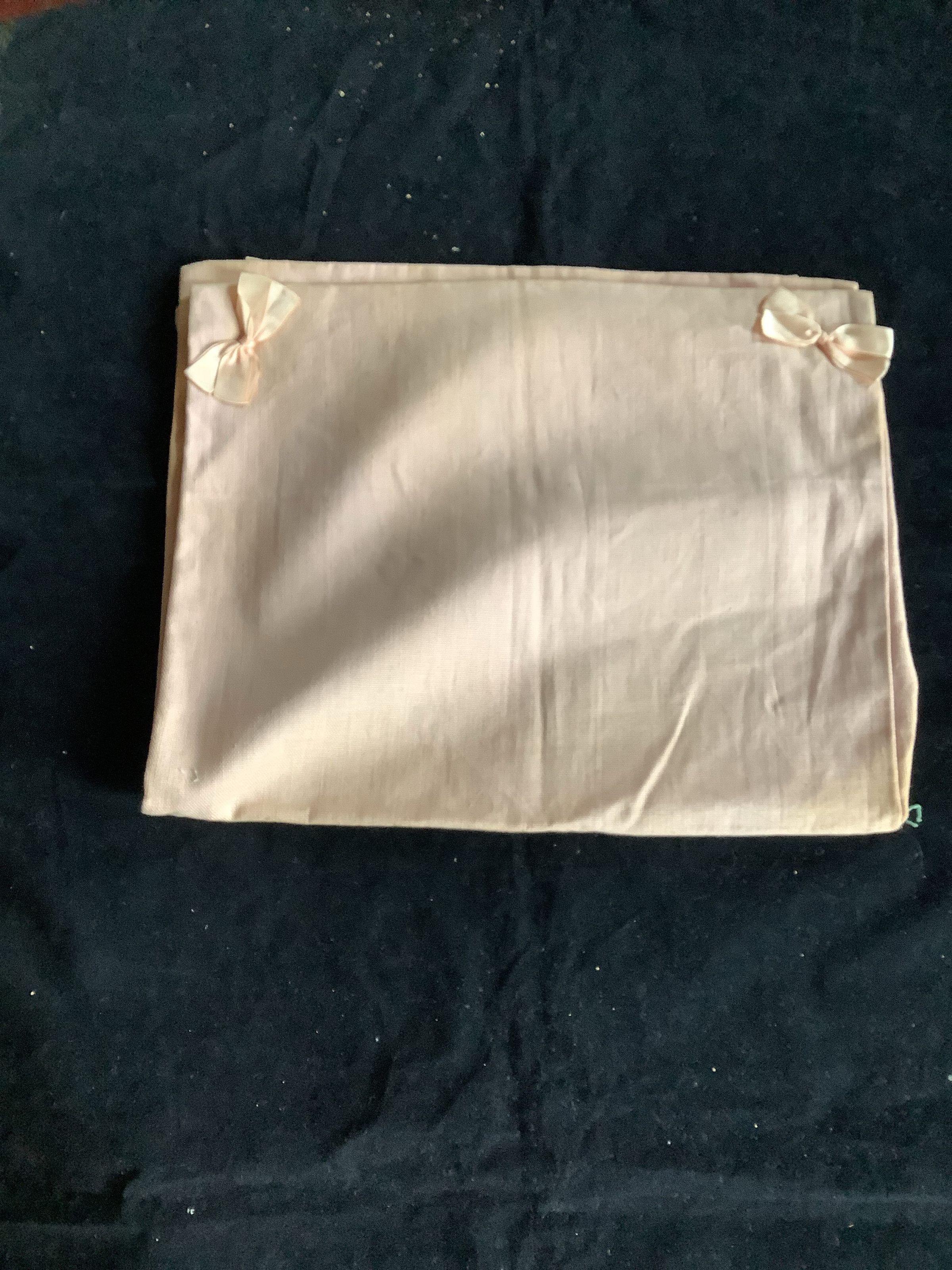 This is a pink pouch that may have been used to store clothes/lingerie in a drawer. There are 4 bows on the corners and two pouches inside.
