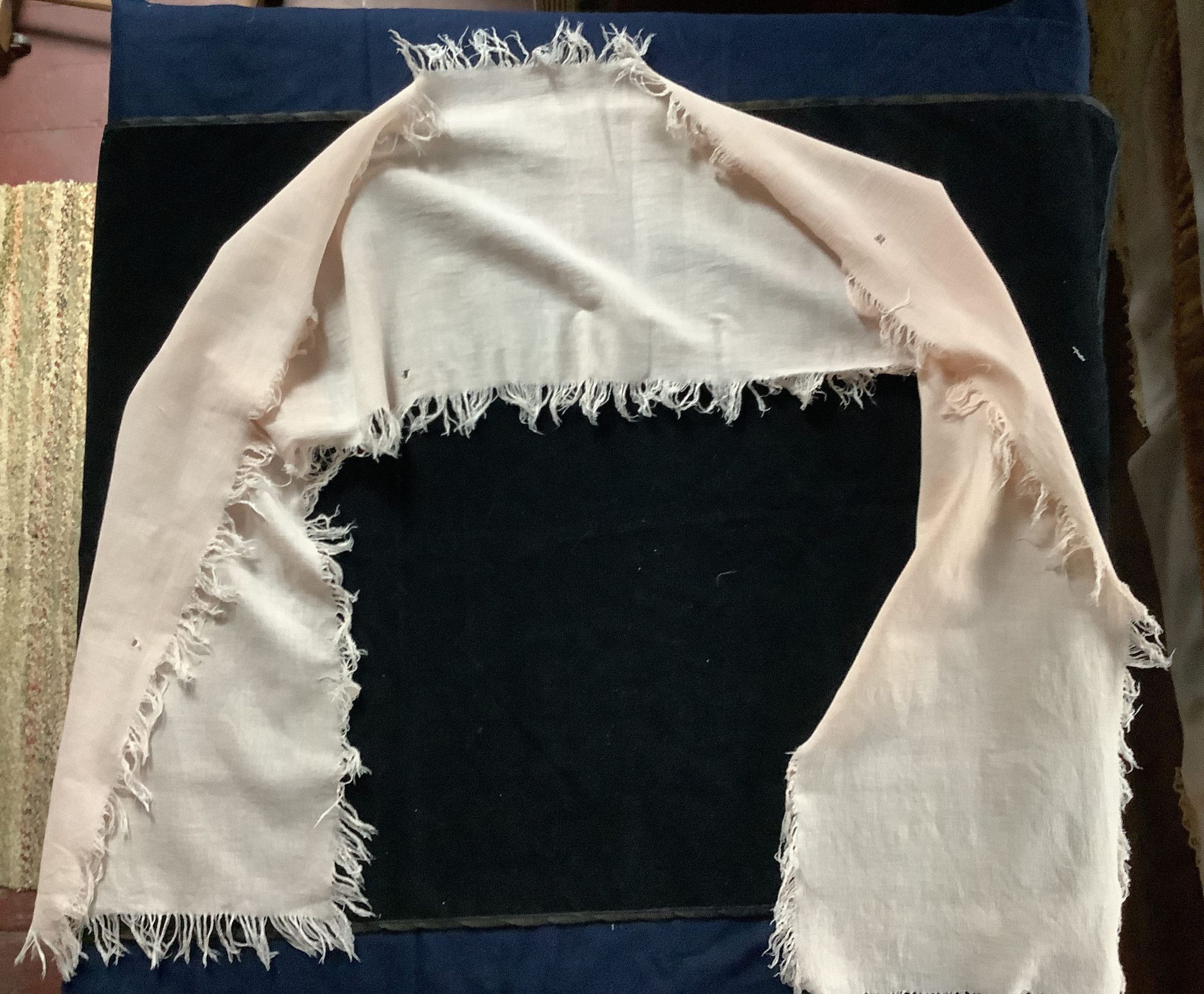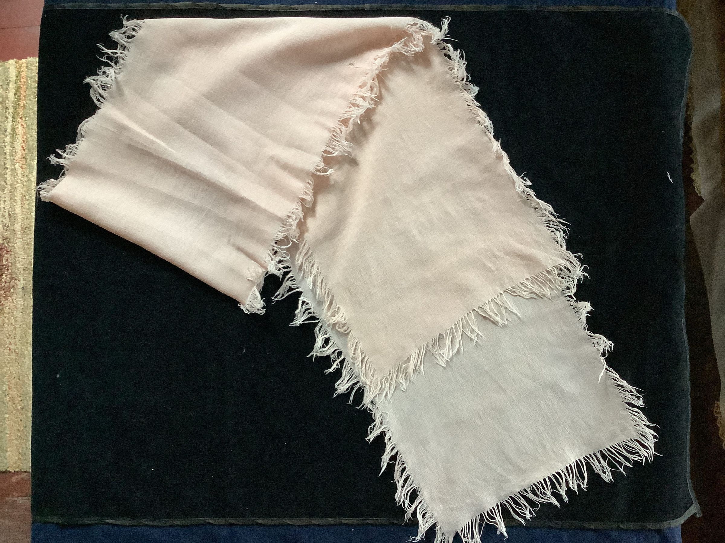 Light pink scarf, with tassels around the edges. Has a few holes and tears. Cleaned 5/2024Clothing/Dress/Costume Details
